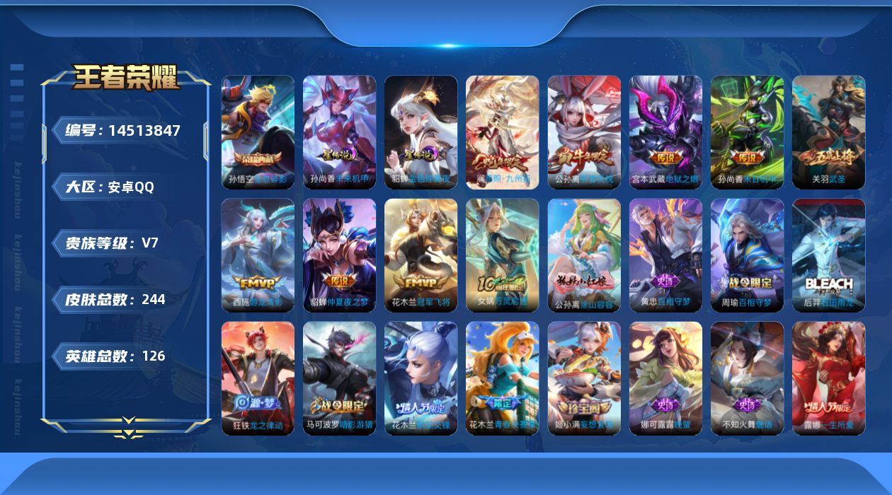 [14513847]【店主推荐捡漏号!可直接换绑】安卓q-v7-最强王者段位-126英雄-244皮肤-1典藏皮肤-8传说-72史诗 【荣耀典藏】:孙悟空全息碎影 【传说皮肤】:澜愿照九州拓,西施游龙清影,公孙离祈雪灵祝,关羽武圣,花木兰冠军飞将,貂蝉仲夏夜之梦,孙尚香末日机甲,宫本武藏地狱之眼 【限定皮肤】:白起狰,狄仁杰阴阳师,虞姬凯尔特女王,赵云皇家上将,墨子神迹守卫,孙尚香蔷薇恋人,庄周蜃楼王,庄周高山流水,孙膑妖精王,扁鹊炼金王,芈月重明,芈月幻夜卜梦,夏侯惇朔风刀,曹操烛龙,典韦穷奇,马可波罗暗影游猎,狄仁杰魔术师,狄仁杰万华元夜,达摩星际陆战队,达摩沙漠行僧,项羽海滩派对,老夫子醍醐杖,老夫子航海奇遇记,关羽武圣,程咬金演武夺筹,露娜一生所爱,韩信逐梦之影,王昭君午后时光,兰陵王金庭之子,花木兰青春决赛季,花木兰默契交锋,亚瑟狮心王,牛魔御旌,后羿圣弓游侠,李元芳银河之约,李元芳云中旅人,虞姬霸王别姬,钟馗驱傩正仪,杨玉环遇见飞天,干将莫邪真爱魔法,雅典娜单词大作战,雅典娜黎明之约,蔡文姬繁星吟游,太乙真人饕餮,鬼谷子原初探秘者,黄忠火炮绅士,苏烈千军破阵,百里玄策原初追逐者,弈星混沌棋,梦奇顽趣,公孙离祈雪灵祝,沈梦溪星空之诺,沈梦溪大漠名商,明世隐疑决卦,裴擒虎李小龙,裴擒虎擒涛扼浪,狂铁御狮,狂铁电玩高手,米莱狄御霄,米莱狄胡桃异想国,云中君纤云弄巧,盾山御銮,猪八戒西部大镖客,上官婉儿梁祝,蒙犽狂想玩偶喵,鲁班大师探海日志,桑启海盐诗旅,张良古海寻踪,蒙恬荣光圣徽,鬼谷子天穹祈灯,姬小满妄想食味,沈梦溪龙舞盛年,刘邦剑破天穹,刘备异域游侠,周瑜熔金海岸 【年限皮肤】:公孙离祈雪灵祝,关羽武圣 【赛季限定】:庄周蜃楼王,孙膑妖精王,扁鹊炼金王,白起狰,芈月重明,夏侯惇朔风刀,曹操烛龙,典韦穷奇,狄仁杰万华元夜,达摩沙漠行僧,老夫子醍醐杖,程咬金演武夺筹,兰陵王金庭之子,张良古海寻踪,亚瑟狮心王,牛魔御旌,李元芳云中旅人,虞姬凯尔特女王,钟馗驱傩正仪,雅典娜黎明之约,太乙真人饕餮,鬼谷子原初探秘者,苏烈千军破阵,百里玄策原初追逐者,弈星混沌棋,梦奇顽趣,沈梦溪大漠名商,明世隐疑决卦,裴擒虎擒涛扼浪,狂铁御狮,米莱狄御霄,盾山御銮,鲁班大师探海日志,桑启海盐诗旅,鬼谷子天穹祈灯,蒙恬荣光圣徽,刘邦剑破天穹 【战令限定】:墨子神迹守卫,芈月幻夜卜梦,马可波罗暗影游猎,达摩