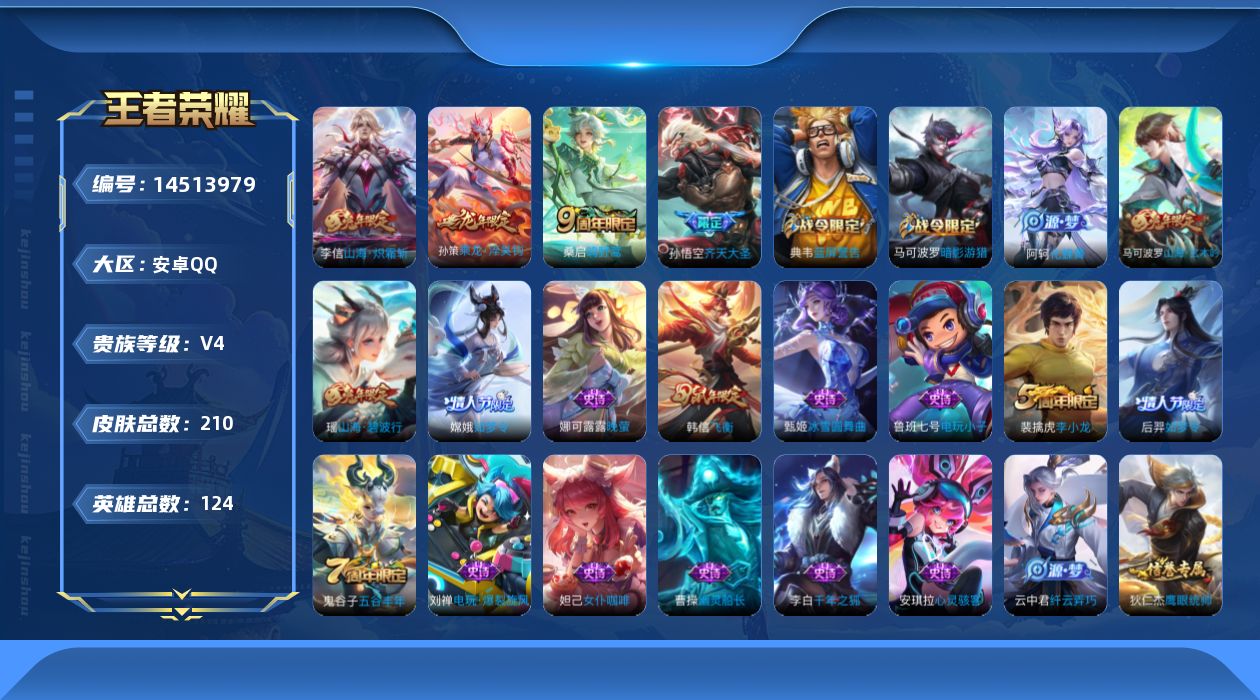 [14513979]可二次【店主推荐捡漏号!可直接换绑】安卓q-v4-荣耀黄金ii段位-123英雄-210皮肤-4传说-51史诗 【英雄全皮】:影全皮 【传说皮肤】:桑启鸣野蒿,孙策乘龙淬吴钩,孙悟空齐天大圣,李信山海炽霜斩 【限定皮肤】:大乔绒语心约,姜子牙天穹之誓,杨戬破阵退雄兵,狄仁杰阴阳师,赵云皇家上将,嬴政优雅恋人,孙尚香蔷薇恋人,芈月重明,吕布猎兽之王,夏侯惇朔风刀,曹操烛龙,典韦穷奇,典韦蓝屏警告,马可波罗暗影游猎,马可波罗山海玄木吟,狄仁杰魔术师,狄仁杰万华元夜,达摩沙漠行僧,项羽海滩派对,老夫子醍醐杖,程咬金演武夺筹,韩信飞衡,兰陵王金庭之子,孙悟空齐天大圣,牛魔御旌,后羿如梦令,李元芳云中旅人,钟馗神迹守卫,钟馗驱傩正仪,雅典娜单词大作战,蔡文姬繁星吟游,鬼谷子原初探秘者,鬼谷子五谷丰年,弈星混沌棋,沈梦溪大漠名商,明世隐疑决卦,裴擒虎李小龙,裴擒虎擒涛扼浪,狂铁御狮,米莱狄御霄,瑶山海碧波行,云中君纤云弄巧,李信山海炽霜斩,盾山御銮,猪八戒西部大镖客,上官婉儿梁祝,嫦娥如梦令,蒙犽狂想玩偶喵,鲁班大师探海日志,桑启海盐诗旅,阿古朵江河有灵,张良古海寻踪,蒙犽百解令,高渐离燃音魔法,妲己灵卜魔法,鬼谷子天穹祈灯,孙策乘龙淬吴钩,沈梦溪龙舞盛年,鲁班七号蔬乡物语,李元芳蔬乡物语,刘邦剑破天穹,刘备异域游侠,周瑜熔金海岸 【年限皮肤】:韩信飞衡,瑶山海碧波行,马可波罗山海玄木吟,李信山海炽霜斩,孙策乘龙淬吴钩 【赛季限定】:芈月重明,夏侯惇朔风刀,曹操烛龙,典韦穷奇,狄仁杰万华元夜,达摩沙漠行僧,老夫子醍醐杖,程咬金演武夺筹,兰陵王金庭之子,张良古海寻踪,牛魔御旌,李元芳云中旅人,钟馗驱傩正仪,鬼谷子原初探秘者,弈星混沌棋,沈梦溪大漠名商,明世隐疑决卦,裴擒虎擒涛扼浪,狂铁御狮,米莱狄御霄,盾山御銮,鲁班大师探海日志,桑启海盐诗旅,鬼谷子天穹祈灯,刘邦剑破天穹,姜子牙天穹之誓 【战令限定】:吕布猎兽之王,典韦蓝屏警告,马可波罗暗影游猎,钟馗神迹守卫,雅典娜单词大作战,猪八戒西部大镖客,蒙犽狂想玩偶喵,高渐离燃音魔法,妲己灵卜魔法,鲁班七号蔬乡物语,李元芳蔬乡物语 【史诗皮肤】:鲁班七号电玩小子,赵云皇家上将,貂蝉圣诞恋歌,甄姬冰雪圆舞曲,王昭君偶像歌手,狄仁杰魔术师,宫本武藏鬼剑武藏,孙尚香蔷薇恋人,孙尚香水果甜心,嬴政优雅恋人,嬴政暗夜贵公子,嬴政摇滚巨星,妲己魅力