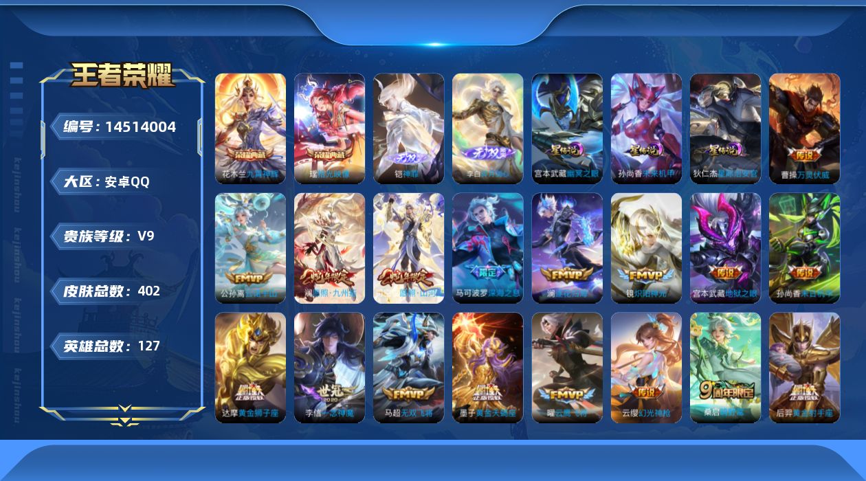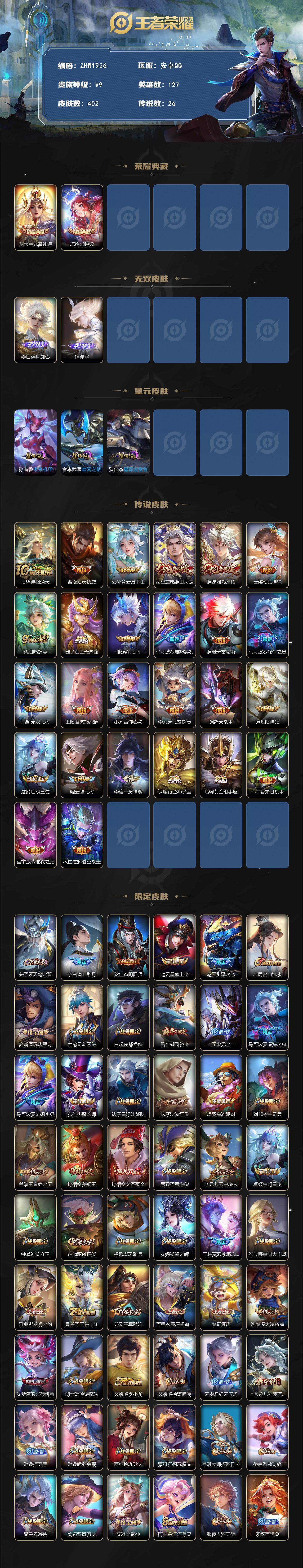 [14514004]【店主推荐捡漏号!可直接换绑】安卓q-v9-最强王者段位-127英雄-402皮肤-2典藏皮肤-2无双-26传说-117史诗 【英雄全皮】:刘禅全皮,达摩全皮,刘邦全皮,孙权全皮,钟馗全皮,苍全皮,蒙恬全皮,澜全皮,戈娅全皮,空空儿全皮,影全皮 【荣耀典藏】:花木兰九霄神辉,瑶拾光映像 【无双皮肤】:李白碎月剑心,铠神罪 【传说皮肤】:后羿神树通天,曹操万灵伏威,公孙离云诺千山,司空震愿照山河定,澜愿照九州拓,云缨幻光神呛,桑启鸣野蒿,墨子黄金天蝎座,澜逐花归海,马可波罗妄想实况,澜电玩雷克斯,马可波罗深海之息,马超无双飞将,王昭君乞巧织情,小乔音你心动,李元芳飞鸢探春,铠绛天战甲,镜炽阳神光,虞姬启明星使,曜云鹰飞将,李信一念神魔,达摩黄金狮子座,后羿黄金射手座,孙尚香末日机甲,宫本武藏地狱之眼,狄仁杰超时空战士 【限定皮肤】:姜子牙天穹之誓,李白谪仙醉月,狄仁杰阴阳师,赵云皇家上将,赵云引擎之心,庄周高山流水,高渐离玩趣恶龙,扁鹊奇幻香踪,白起夜都怪侠,吕布御风骁将,元歌无心,马可波罗深海之息,马可波罗妄想实况,狄仁杰魔术师,达摩星际陆战队,达摩沙漠行僧,项羽海滩派对,刘邦夺宝奇兵,兰陵王金庭之子,孙悟空美猴王,孙悟空大圣娶亲,后羿圣弓游侠,李元芳云中旅人,虞姬启明星使,钟馗神迹守卫,钟馗驱傩正仪,杨戬潮玩骑兵,女娲朔望之晖,干将莫邪冰霜恋舞曲,雅典娜单词大作战,雅典娜黎明之约,鬼谷子五谷丰年,苏烈千军破阵,百里玄策原初追逐者,梦奇顽趣,沈梦溪大漠名商,沈梦溪匿光破解者,明世隐吟游魔法,裴擒虎李小龙,裴擒虎擒涛扼浪,云中君纤云弄巧,上官婉儿神器万象笔,嫦娥拒霜思,嫦娥暖冬兔眠,西施玲珑珍味,蒙犽狂想玩偶喵,鲁班大师探海日志,桑启海盐诗旅,暃星界游侠,戈娅驭风魔法,艾琳女武神,阿古朵江河有灵,张良古海寻踪,蒙犽百解令,蒙恬荣光圣徽,高渐离燃音魔法,妲己灵卜魔法,鬼谷子天穹祈灯,李白碎月剑心,沈梦溪龙舞盛年,鲁班七号蔬乡物语,李元芳蔬乡物语,刘邦剑破天穹,程咬金群星魔术团,镜青焰无极,项羽苍威无极,刘备异域游侠,芈月浮光幕影,周瑜熔金海岸 【年限皮肤】:孙悟空美猴王,吕布御风骁将,马超神威 【赛季限定】:达摩沙漠行僧,兰陵王金庭之子,张良古海寻踪,李元芳云中旅人,钟馗驱傩正仪,雅典娜黎明之约,苏烈千军破阵,百里玄策原初追逐者,梦奇顽趣,沈梦溪大漠名商,裴擒虎擒涛扼浪