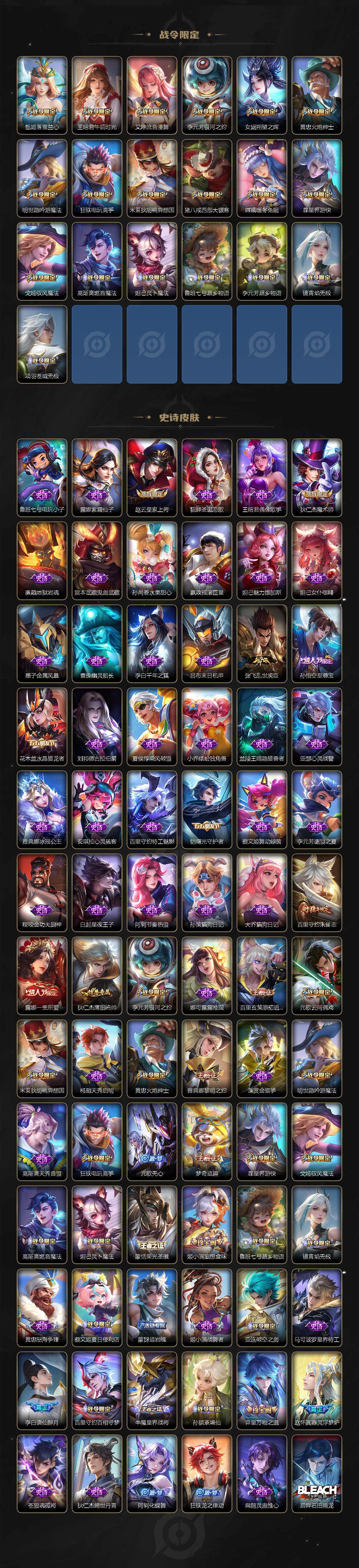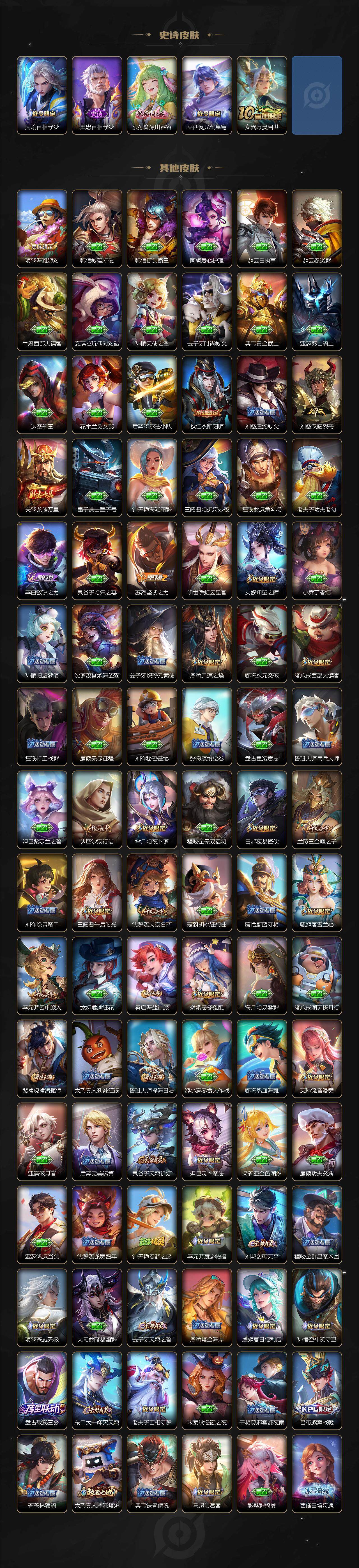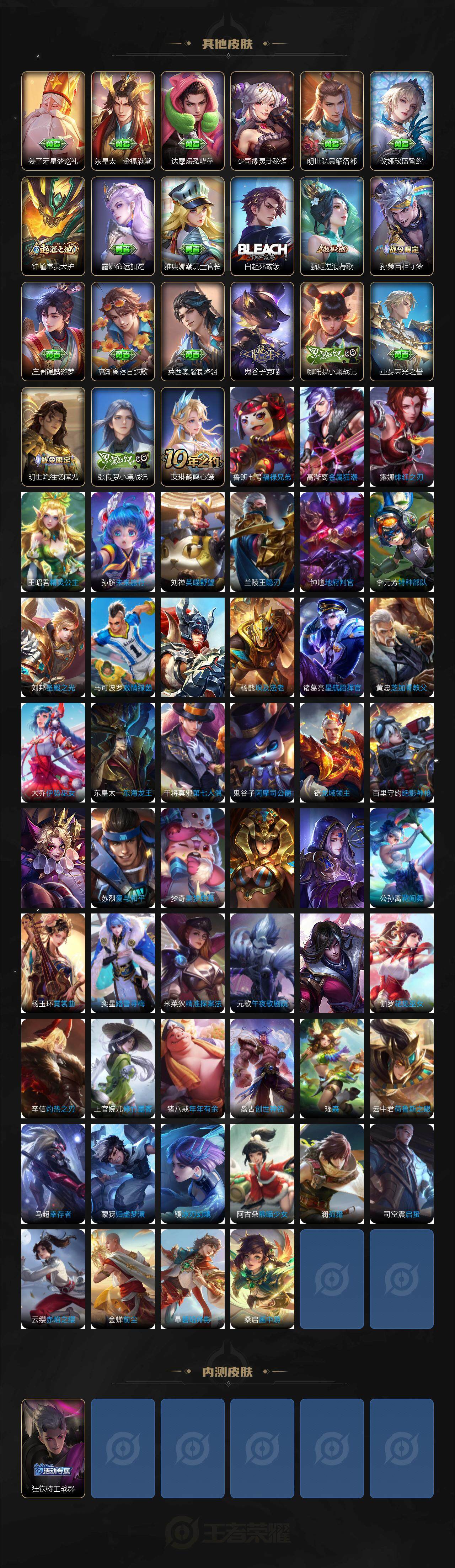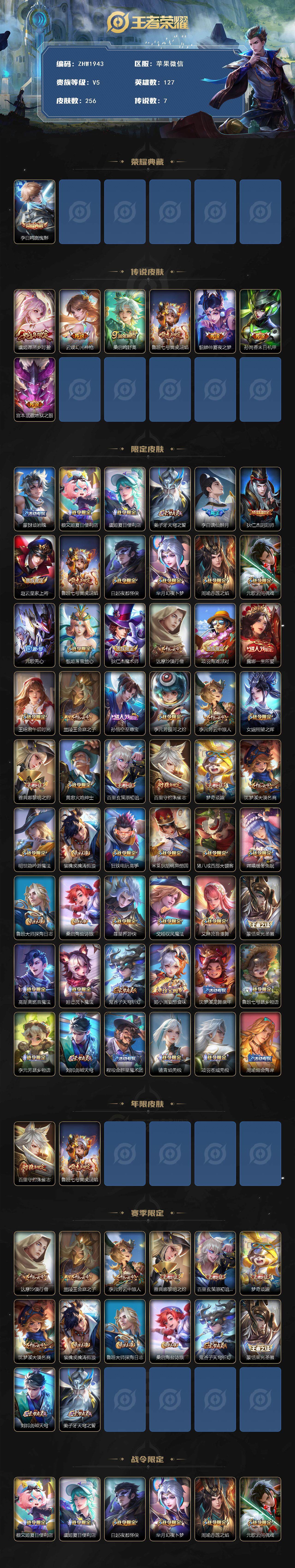 127英雄-256皮肤-苹果wx-v5-最强王者段位-127英雄-256皮肤-1典藏皮肤-7传说-82史诗 【英雄全皮】:苍全皮,戈娅全皮,影全皮 【荣耀典藏】:李白鸣剑曳影 【传说皮肤】:虞姬愿照岁时盈,云缨幻光神呛,桑启鸣野蒿,鲁班七号寅虎瑞焰,貂蝉仲夏夜之梦,孙尚香末日机甲,宫本武藏地狱之眼 【限定皮肤】:蒙犽顽岩魄