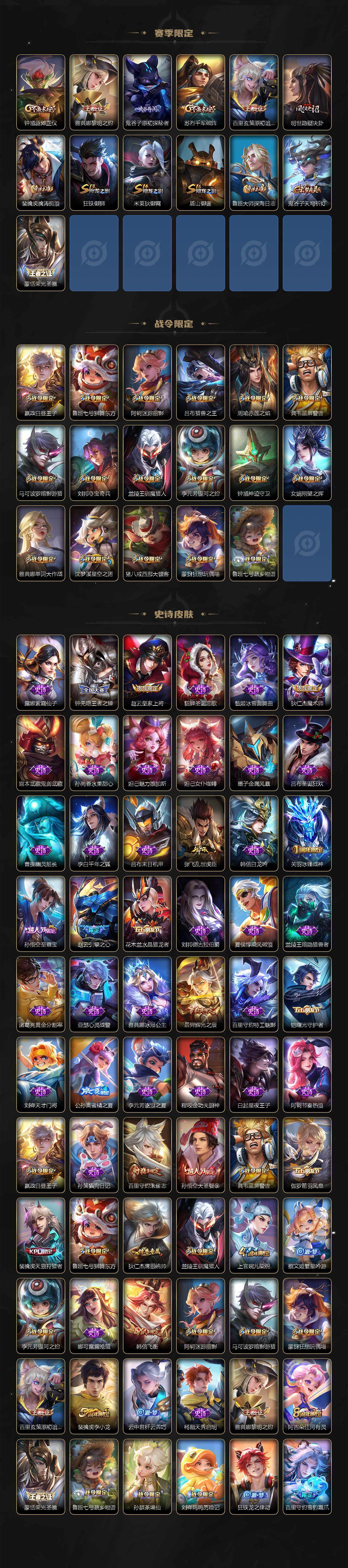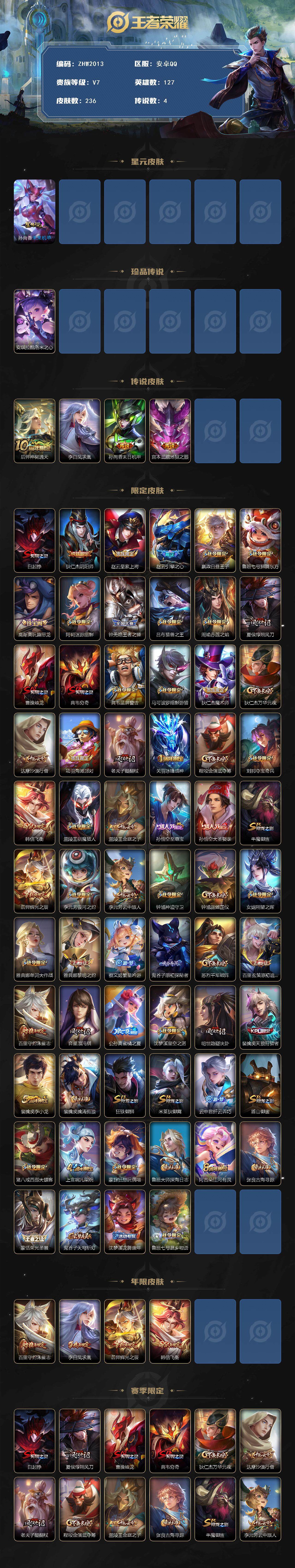 【店主推荐捡漏号!可直接换绑】安卓q-v7-最强王者段位-127英雄-236皮肤-1珍品传说-4传说-72史诗 【珍品传说】:安琪拉酷洛米之心 【传说皮肤】:后羿神树通天,李白凤求凰,孙尚香末日机甲,宫本武藏地狱之眼 【限定皮肤】:白起狰,狄仁杰阴阳师,赵云皇家上将,赵云引擎之心,嬴政白昼王子,鲁班七号狮舞东方,高渐离玩趣恶龙,阿轲迷踪丽影,钟无艳王者之锤,吕布猎兽之王,周瑜赤莲之焰,夏侯惇朔风刀,曹操烛龙,典韦穷奇,典韦蓝屏警告,马可波罗暗影游猎,狄仁杰魔术师,狄仁杰万华元夜,达摩沙漠行僧,项羽海滩派对,老夫子醍醐杖,关羽冰锋战神,程咬金演武夺筹,刘邦夺宝奇兵,韩信飞衡,兰陵王驯魔猎人,兰陵王金庭之子,孙悟空至尊宝,孙悟空大圣娶亲,牛魔御旌,后羿辉光之辰,李元芳银河之约,李元芳云中旅人,钟馗神迹守卫,钟馗驱傩正仪,女娲朔望之晖,雅典娜单词大作战,雅典娜黎明之约,蔡文姬繁星吟游,鬼谷子原初探秘者,苏烈千军破阵,百里玄策原初追逐者,百里守约朱雀志,弈星混沌棋,公孙离蜜橘之夏,沈梦溪星空之诺,明世隐疑决卦,裴擒虎天狼狩猎者,裴擒虎李小龙,裴擒虎擒涛扼浪,狂铁御狮,米莱狄御霄,云中君纤云弄巧,盾山御銮,猪八戒西部大镖客,上官婉儿梁祝,蒙犽狂想玩偶喵,鲁班大师探海日志,阿古朵江河有灵,张良古海寻踪,蒙恬荣光圣徽,鬼谷子天穹祈灯,沈梦溪龙舞盛年,鲁班七号蔬乡物语 【年限皮肤】:百里守约朱雀志,李白凤求凰,后羿辉光之辰,韩信飞衡 【赛季限定】:白起狰,夏侯惇朔风刀,曹操烛龙,典韦穷奇,狄仁杰万华元夜,达摩沙漠行僧,老夫子醍醐杖,程咬金演武夺筹,兰陵王金庭之子,张良古海寻踪,牛魔御旌,李元芳云中旅人,钟馗驱傩正仪,雅典娜黎明之约,鬼谷子原初探秘者,苏烈千军破阵,百里玄策原初追逐者,弈星混沌棋,明世隐疑决卦,裴擒虎擒涛扼浪,狂铁御狮,米莱狄御霄,盾山御銮,鲁班大师探海日志,鬼谷子天穹祈灯,蒙恬荣光圣徽 【战令限定】:嬴政白昼王子,鲁班七号狮舞东方,阿轲迷踪丽影,吕布猎兽之王,周瑜赤莲之焰,典韦蓝屏警告,马可波罗暗影游猎,刘邦夺宝奇兵,兰陵王驯魔猎人,李元芳银河之约,钟馗神迹守卫,女娲朔望之晖,雅典娜单词大作战,沈梦溪星空之诺,猪八戒西部大镖客,蒙犽狂想玩偶喵,鲁班七号蔬乡物语 【史诗皮肤】:露娜紫霞仙子,钟无艳王者之锤,赵云皇家上将,貂蝉圣诞恋歌,甄姬冰雪圆舞曲,狄仁杰魔术师,宫本武藏鬼剑武藏,孙尚香水果甜心,妲己魅力维加斯,妲己女仆咖啡,墨子金属风暴,吕布圣诞狂欢,曹操幽灵船长,李白千年之狐,吕布末日机甲,张飞乱世虎臣,韩信白龙吟,关羽冰锋战神,孙悟空至尊宝,赵云引擎之心,花木兰水晶猎龙者,刘邦德古拉伯爵,夏侯惇乘风破浪,兰陵王暗隐猎兽者,诸葛亮黄金分割率,亚瑟心灵战警,雅典娜冰冠公主,后羿辉光之辰,百里守约特工魅影,铠曙光守护者,刘禅天才门将,公孙离蜜橘之夏,李元芳逐浪之夏,程咬金功夫厨神,白起星夜王子,阿轲节奏热浪,嬴政白昼王子,孙策猫狗日记,百里守约朱雀志,孙悟空大圣娶亲,典韦蓝屏警告,伽罗箭羽风息,裴擒虎天狼狩猎者,鲁班七号狮舞东方,狄仁杰鹰眼统帅,兰陵王驯魔猎人,上官婉儿梁祝,蔡文姬繁星吟游,李元芳银河之约,娜可露露晚萤,韩信飞衡,阿轲迷踪丽影,马可波罗暗影游猎,蒙犽狂想玩偶喵,百里玄策原初追逐者,裴擒虎李小龙,云中君纤云弄巧,杨戬天秀启明,雅典娜黎明之约,阿古朵江河有灵,蒙恬荣光圣徽,鲁班七号蔬乡物语,孙膑茶境仙,刘禅鸭鸭历险记,狂铁龙之律动,百里守约雪豹霜爪,后羿石田雨龙,周瑜百相守梦,黄忠百相守梦,西施织梦人,女娲万灵启世,少司缘巫礼祀神 【其他皮肤】:项羽海滩派对,韩信教廷特使,韩信街头霸王,阿轲爱心护理,达摩大发明家,赵云忍炎影,程咬金星际陆战队,白起白色死神,扁鹊化身博士,安琪拉玩偶对对碰,孙膑天使之翼,妲己少女阿狸,典韦黄金武士,亚瑟死亡骑士,达摩拳王,花木兰兔女郎,张飞五福同心,甄姬花好人间,刘备万事如意,宫本武藏万象初新,后羿阿尔法小队,狄仁杰阴阳师,刘备纽约教父,刘备汉昭烈帝,关羽龙腾万里,白起狰,钟无艳海滩丽影,宫本武藏霸王丸,曹操烛龙,王昭君幻想奇妙夜,老夫子功夫老勺,孙尚香沉稳之力,典韦穷奇,李白敏锐之力,鬼谷子幻乐之宴,狂铁御狮,安琪拉如懿,苏烈坚韧之力,项羽科学大爆炸,米莱狄御霄,吕布猎兽之王,明世隐虹云星官,张良幽兰居士,庄周奇妙博物学,牛魔御旌,女娲朔望之晖,小乔丁香结,吕布野性能量,钟馗神迹守卫,盾山御銮,孙膑归虚梦演,高渐离玩趣恶龙,沈梦溪鲨炮海盗猫,姜子牙炽热元素使,夏侯惇朔风刀,周瑜赤莲之焰,沈梦溪星空之诺,弈星混沌棋,哪吒次元突破,鲁班七号黑桃队长,明世隐疑决卦,刘邦夺宝奇兵,盾山圆桌骑士,老夫子醍醐杖,猪八戒西部大镖客,鬼谷子原初探秘者,雅典娜单词大作战,狄仁杰万华元夜,刘禅秘密基地,露娜瓷语鉴心,程咬金演武夺筹,张良缤纷绘卷,钟馗驱傩正仪,鲁班大师乓乓大师,苏烈千军破阵,达摩沙漠行僧,程咬金无双福将,兰陵王金庭之子,李元芳云中旅人,猪八戒潮玩探月行,裴擒虎擒涛扼浪,莱西奥西部游侠,鲁班大师探海日志,张良古海寻踪,后羿完美运算,鬼谷子天穹祈灯,朵莉亚金色潮汐,廉颇功夫炙烤,沈梦溪龙舞盛年,大司命暗都幽影,太乙真人谧流熔炉,马超访茗客,姜子牙星梦巡礼,明世隐景韶洛都,戈娅玫蓝誓约,刘备浪漫序章,钟