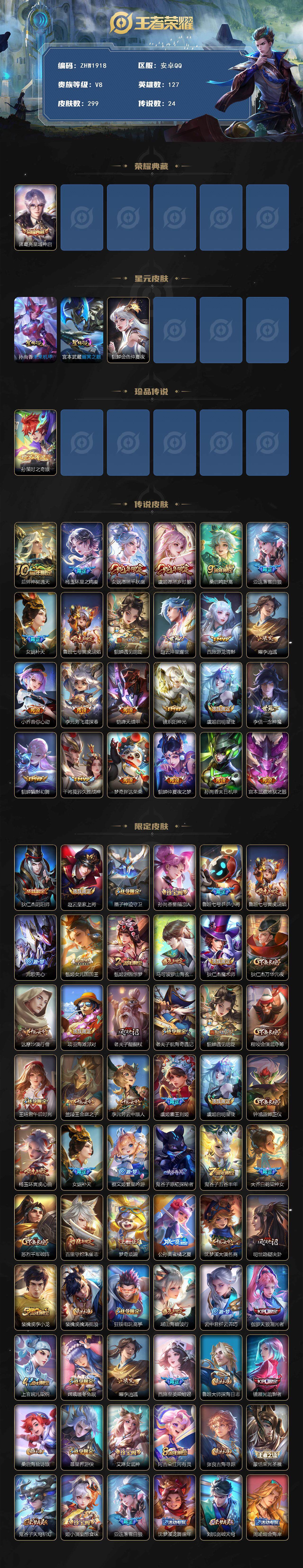 [14514180]【店主推荐捡漏号!可直接换绑】安卓q-v8-最强王者段位-127英雄-299皮肤-1典藏皮肤-1珍品传说-24传说-90史诗 【英雄全皮】:孙权全皮,鬼谷子全皮,亚连全皮,蒙恬全皮,阿古朵全皮,空空儿全皮,影全皮 【荣耀典藏】:诸葛亮星域神启 【珍品传说】:孙策时之奇旅 【传说皮肤】:后羿神树通天,杨玉环星之鸣奏,女娲愿照千秋盛,虞姬愿照岁时盈,桑启鸣野蒿,亚连落雪白狼,女娲补天,鲁班七号寅虎瑞焰,貂蝉遇见胡旋,赵云淬星耀世,西施游龙清影,曜李 ,小乔音你心动,李元芳飞鸢探春,铠绛天战甲,镜炽阳神光,虞姬启明星使,李信一念神魔,貂蝉猫影幻舞,干将莫邪久胜战神,梦奇胖达荣荣,貂蝉仲夏夜之梦,孙尚香末日机甲,宫本武藏地狱之眼 【限定皮肤】:狄仁杰阴阳师,赵云皇家上将,墨子神迹守卫,孙尚香蔷薇恋人,鲁班七号乒乒小将,鲁班七号寅虎瑞焰,元歌无心,甄姬女儿国国王,甄姬游园惊梦,马可波罗山海玄木吟,狄仁杰魔术师,狄仁杰万华元夜,达摩沙漠行僧,项羽海滩派对,老夫子醍醐杖,老夫子航海奇遇记,貂蝉遇见胡旋,程咬金演武夺筹,王昭君午后时光,兰陵王金庭之子,李元芳云中旅人,虞姬霸王别姬,虞姬启明星使,钟馗驱傩正仪,杨玉环寅虎心曲,女娲补天,蔡文姬繁星吟游,鬼谷子原初探秘者,鬼谷子五谷丰年,大乔白鹤梁神女,苏烈千军破阵,百里守约朱雀志,梦奇顽趣,公孙离蜜橘之夏,沈梦溪大漠名商,明世隐疑决卦,裴擒虎李小龙,裴擒虎擒涛扼浪,狂铁电玩高手,瑶山海碧波行,云中君纤云弄巧,伽罗天狼溯光者,上官婉儿梁祝,嫦娥暖冬兔眠,曜李 ,西施至美乘鲤谣,鲁班大师探海日志,镜匿光追影者,桑启海盐诗旅,暃星界游侠,艾琳女武神,阿古朵江河有灵,张良古海寻踪,蒙恬荣光圣徽,鬼谷子天穹祈灯,姬小满妄想食味,亚连落雪白狼,沈梦溪龙舞盛年,刘邦剑破天穹,周瑜熔金海岸 【年限皮肤】:百里守约朱雀志,鲁班七号寅虎瑞焰,杨玉环寅虎心曲,马超神威,瑶山海碧波行,马可波罗山海玄木吟 【赛季限定】:狄仁杰万华元夜,达摩沙漠行僧,老夫子醍醐杖,程咬金演武夺筹,兰陵王金庭之子,张良古海寻踪,李元芳云中旅人,钟馗驱傩正仪,鬼谷子原初探秘者,苏烈千军破阵,梦奇顽趣,沈梦溪大漠名商,明世隐疑决卦,裴擒虎擒涛扼浪,鲁班大师探海日志,桑启海盐诗旅,鬼谷子天穹祈灯,蒙恬荣光圣徽,刘邦剑破天穹 【战令限定】:墨子神迹守卫,老夫子航海奇遇记,王昭君