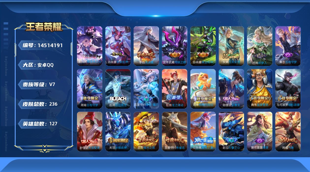 [14514191]【店主推荐捡漏号!可直接换绑】安卓q-v7-最强王者段位-127英雄-236皮肤-1珍品传说-4传说-72史诗 【珍品传说】:安琪拉酷洛米之心 【传说皮肤】:后羿神树通天,李白凤求凰,孙尚香末日机甲,宫本武藏地狱之眼 【限定皮肤】:白起狰,狄仁杰阴阳师,赵云皇家上将,赵云引擎之心,嬴政白昼王子,鲁班七号狮舞东方,高渐离玩趣恶龙,阿轲迷踪丽影,钟无艳王者之锤,吕布猎兽之王,周瑜赤莲之焰,夏侯惇朔风刀,曹操烛龙,典韦穷奇,典韦蓝屏警告,马可波罗暗影游猎,狄仁杰魔术师,狄仁杰万华元夜,达摩沙漠行僧,项羽海滩派对,老夫子醍醐杖,关羽冰锋战神,程咬金演武夺筹,刘邦夺宝奇兵,韩信飞衡,兰陵王驯魔猎人,兰陵王金庭之子,孙悟空至尊宝,孙悟空大圣娶亲,牛魔御旌,后羿辉光之辰,李元芳银河之约,李元芳云中旅人,钟馗神迹守卫,钟馗驱傩正仪,女娲朔望之晖,雅典娜单词大作战,雅典娜黎明之约,蔡文姬繁星吟游,鬼谷子原初探秘者,苏烈千军破阵,百里玄策原初追逐者,百里守约朱雀志,弈星混沌棋,公孙离蜜橘之夏,沈梦溪星空之诺,明世隐疑决卦,裴擒虎天狼狩猎者,裴擒虎李小龙,裴擒虎擒涛扼浪,狂铁御狮,米莱狄御霄,云中君纤云弄巧,盾山御銮,猪八戒西部大镖客,上官婉儿梁祝,蒙犽狂想玩偶喵,鲁班大师探海日志,阿古朵江河有灵,张良古海寻踪,蒙恬荣光圣徽,鬼谷子天穹祈灯,沈梦溪龙舞盛年,鲁班七号蔬乡物语 【年限皮肤】:百里守约朱雀志,李白凤求凰,后羿辉光之辰,韩信飞衡 【赛季限定】:白起狰,夏侯惇朔风刀,曹操烛龙,典韦穷奇,狄仁杰万华元夜,达摩沙漠行僧,老夫子醍醐杖,程咬金演武夺筹,兰陵王金庭之子,张良古海寻踪,牛魔御旌,李元芳云中旅人,钟馗驱傩正仪,雅典娜黎明之约,鬼谷子原初探秘者,苏烈千军破阵,百里玄策原初追逐者,弈星混沌棋,明世隐疑决卦,裴擒虎擒涛扼浪,狂铁御狮,米莱狄御霄,盾山御銮,鲁班大师探海日志,鬼谷子天穹祈灯,蒙恬荣光圣徽 【战令限定】:嬴政白昼王子,鲁班七号狮舞东方,阿轲迷踪丽影,吕布猎兽之王,周瑜赤莲之焰,典韦蓝屏警告,马可波罗暗影游猎,刘邦夺宝奇兵,兰陵王驯魔猎人,李元芳银河之约,钟馗神迹守卫,女娲朔望之晖,雅典娜单词大作战,沈梦溪星空之诺,猪八戒西部大镖客,蒙犽狂想玩偶喵,鲁班七号蔬乡物语 【史诗皮肤】:露娜紫霞仙子,钟无艳王者之锤,赵云皇家上将,貂蝉圣诞恋歌,甄姬冰雪圆舞曲,狄仁杰魔术师,宫