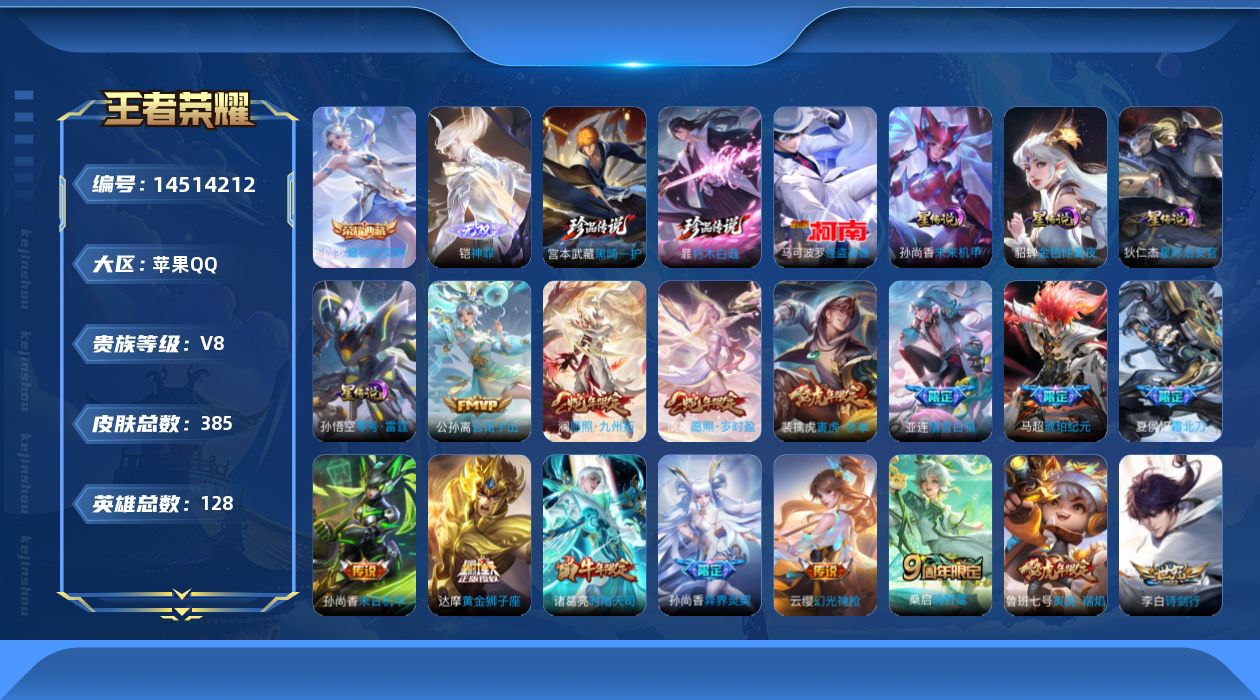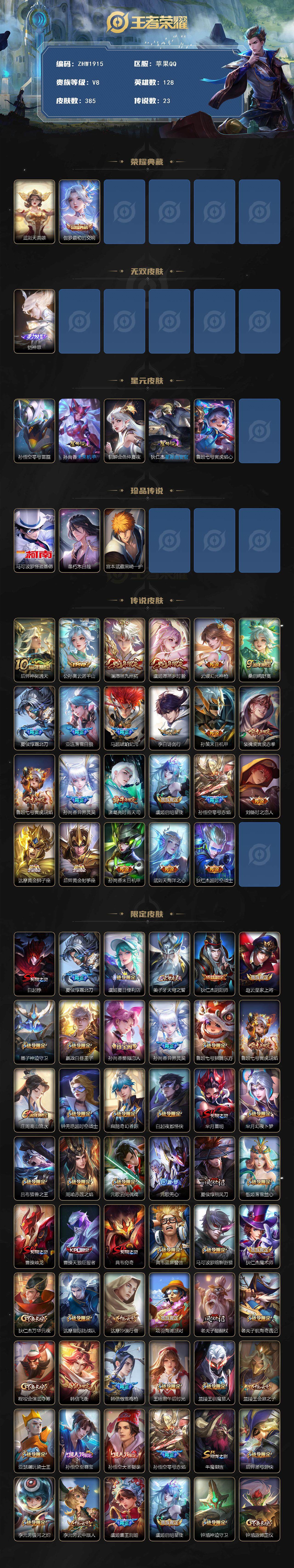 [14514212]【店主推荐捡漏号!可直接换绑】苹果q-v8-最强王者段位-128英雄-385皮肤-1典藏皮肤-1典藏英雄-1无双-3珍品传说-5星传说-23传说-117史诗 【英雄全皮】:刘禅全皮,达摩全皮,孙权全皮,钟馗全皮,鬼谷子全皮,狂铁全皮,猪八戒全皮,蒙恬全皮,莱西奥全皮,空空儿全皮 【荣耀典藏】:武则天英雄,伽罗最初的交响 【无双皮肤】:铠神罪 【珍品传说】:马可波罗怪盗基德,暃朽木白哉,宫本武藏黑崎一护 【传说皮肤】:后羿神树通天,公孙离云诺千山,澜愿照九州拓,虞姬愿照岁时盈,云缨幻光神呛,桑启鸣野蒿,夏侯惇霜北刀,亚连落雪白狼,马超琥珀纪元,李白诗剑行,孙策末日机甲,裴擒虎寅虎赤拳,鲁班七号寅虎瑞焰,孙尚香异界灵契,诸葛亮时雨天司,虞姬启明星使,孙悟空零号赤焰,刘备时之恋人,达摩黄金狮子座,后羿黄金射手座,孙尚香末日机甲,武则天海洋之心,狄仁杰超时空战士 【限定皮肤】:白起狰,夏侯惇霜北刀,虞姬夏日便利店,姜子牙天穹之誓,狄仁杰阴阳师,赵云皇家上将,墨子神迹守卫,嬴政白昼王子,孙尚香蔷薇恋人,孙尚香异界灵契,鲁班七号狮舞东方,鲁班七号寅虎瑞焰,庄周高山流水,钟无艳超时空战士,扁鹊奇幻香踪,白起夜都怪侠,芈月重明,芈月幻夜卜梦,吕布猎兽之王,周瑜赤莲之焰,元歌云间偶戏,元歌无心,夏侯惇朔风刀,甄姬落雪兰心,曹操烛龙,曹操天狼征服者,典韦穷奇,典韦蓝屏警告,马可波罗暗影游猎,狄仁杰魔术师,狄仁杰万华元夜,达摩星际陆战队,达摩沙漠行僧,项羽海滩派对,老夫子醍醐杖,老夫子航海奇遇记,程咬金演武夺筹,韩信飞衡,韩信傲雪梅呛,王昭君午后时光,兰陵王驯魔猎人,兰陵王金庭之子,亚瑟潮玩骑士王,孙悟空至尊宝,孙悟空大圣娶亲,孙悟空零号赤焰,牛魔御旌,后羿圣弓游侠,李元芳银河之约,李元芳云中旅人,虞姬霸王别姬,虞姬启明星使,钟馗神迹守卫,钟馗驱傩正仪,杨戬潮玩骑兵,女娲朔望之晖,干将莫邪真爱魔法,雅典娜单词大作战,雅典娜黎明之约,蔡文姬繁星吟游,太乙真人饕餮,鬼谷子原初探秘者,鬼谷子五谷丰年,诸葛亮时雨天司,黄忠火炮绅士,苏烈千军破阵,百里玄策原初追逐者,弈星混沌棋,梦奇顽趣,沈梦溪星空之诺,沈梦溪大漠名商,明世隐疑决卦,明世隐吟游魔法,裴擒虎李小龙,裴擒虎寅虎赤拳,裴擒虎擒涛扼浪,狂铁御狮,狂铁电玩高手,米莱狄御霄,米莱狄胡桃异想国,云中君纤云弄巧,伽罗天狼溯光者,盾山御銮,猪八戒