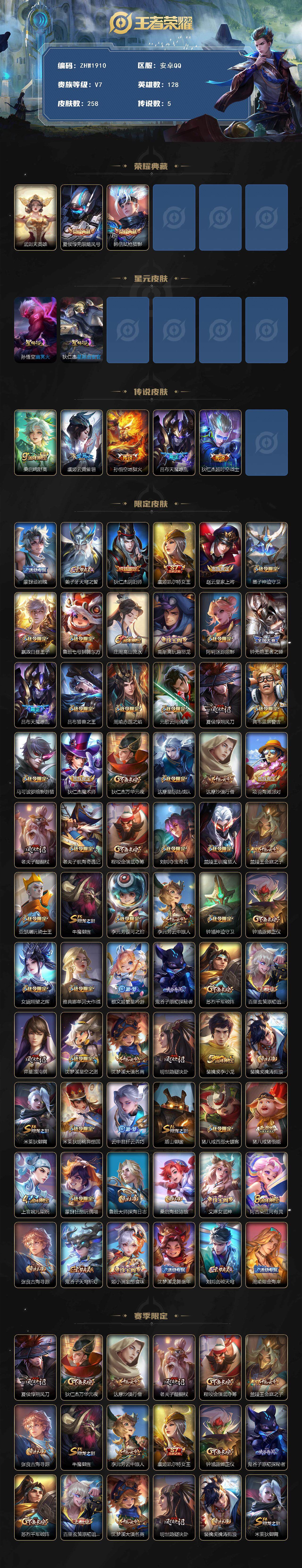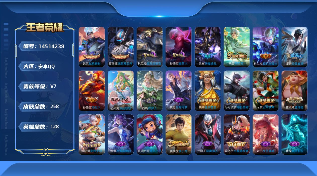 [14514238]【店主推荐捡漏号!可直接换绑】安卓q-v7-永恒钻石iv段位-128英雄-258皮肤-2典藏皮肤-1典藏英雄-5传说-63史诗 【英雄全皮】:猪八戒全皮 【荣耀典藏】:武则天英雄,夏侯惇无限飓风号,韩信弑呛猎影 【传说皮肤】:桑启鸣野蒿,虞姬云霓雀翎,孙悟空地狱火,吕布天魔缭乱,狄仁杰超时空战士 【限定皮肤】:蒙犽顽岩魄,姜子牙天穹之誓,狄仁杰阴阳师,虞姬凯尔特女王,赵云皇家上将,墨子神迹守卫,嬴政白昼王子,鲁班七号狮舞东方,庄周高山流水,高渐离玩趣恶龙,阿轲迷踪丽影,钟无艳王者之锤,吕布天魔缭乱,吕布猎兽之王,周瑜赤莲之焰,元歌云间偶戏,夏侯惇朔风刀,典韦蓝屏警告,马可波罗暗影游猎,狄仁杰魔术师,狄仁杰万华元夜,达摩星际陆战队,达摩沙漠行僧,项羽海滩派对,老夫子醍醐杖,老夫子航海奇遇记,程咬金演武夺筹,刘邦夺宝奇兵,兰陵王驯魔猎人,兰陵王金庭之子,亚瑟潮玩骑士王,牛魔御旌,李元芳银河之约,李元芳云中旅人,钟馗神迹守卫,钟馗驱傩正仪,女娲朔望之晖,雅典娜单词大作战,蔡文姬繁星吟游,鬼谷子原初探秘者,苏烈千军破阵,百里玄策原初追逐者,弈星混沌棋,沈梦溪星空之诺,沈梦溪大漠名商,明世隐疑决卦,裴擒虎李小龙,裴擒虎擒涛扼浪,米莱狄御霄,米莱狄胡桃异想国,云中君纤云弄巧,盾山御銮,猪八戒西部大镖客,猪八戒猪悟能,上官婉儿梁祝,蒙犽狂想玩偶喵,鲁班大师探海日志,桑启海盐诗旅,艾琳女武神,阿古朵江河有灵,张良古海寻踪,鬼谷子天穹祈灯,姬小满妄想食味,沈梦溪龙舞盛年,刘邦剑破天穹,周瑜熔金海岸 【赛季限定】:夏侯惇朔风刀,狄仁杰万华元夜,达摩沙漠行僧,老夫子醍醐杖,程咬金演武夺筹,兰陵王金庭之子,张良古海寻踪,牛魔御旌,李元芳云中旅人,虞姬凯尔特女王,钟馗驱傩正仪,鬼谷子原初探秘者,苏烈千军破阵,百里玄策原初追逐者,弈星混沌棋,沈梦溪大漠名商,明世隐疑决卦,裴擒虎擒涛扼浪,米莱狄御霄,盾山御銮,鲁班大师探海日志,桑启海盐诗旅,鬼谷子天穹祈灯,刘邦剑破天穹,姜子牙天穹之誓 【战令限定】:墨子神迹守卫,嬴政白昼王子,鲁班七号狮舞东方,阿轲迷踪丽影,吕布猎兽之王,周瑜赤莲之焰,元歌云间偶戏,典韦蓝屏警告,马可波罗暗影游猎,达摩星际陆战队,老夫子航海奇遇记,刘邦夺宝奇兵,兰陵王驯魔猎人,亚瑟潮玩骑士王,李元芳银河之约,钟馗神迹守卫,女娲朔望之晖,雅典娜单词大作战,沈梦溪星空之诺,米莱狄