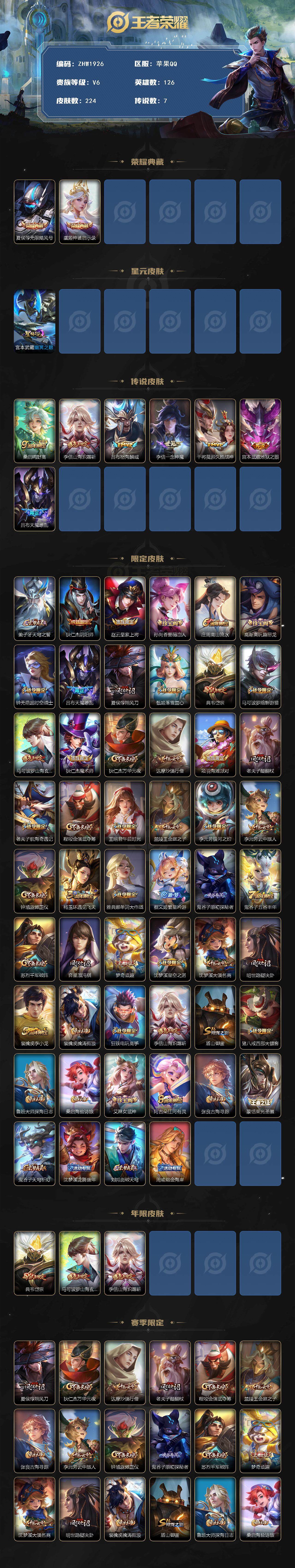 126英雄-224皮肤-【店主推荐捡漏号!可直接换绑】苹果q-v6-最强王者段位-126英雄-224皮肤-2典藏皮肤-7传说-63史诗 【英雄全皮】:鬼谷子全皮,李信全皮 【荣耀典藏】:夏侯惇无限飓风号,虞姬神鉴启示录 【传说皮肤】:桑启鸣野蒿,李信山海炽霜斩,吕布怒海麟威,李信一念神魔,干将莫邪久胜战神,宫本武藏地狱之眼