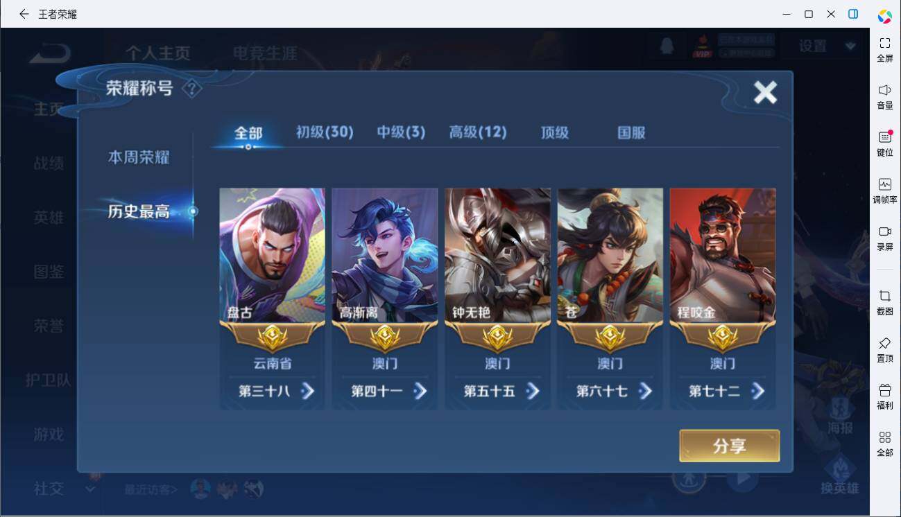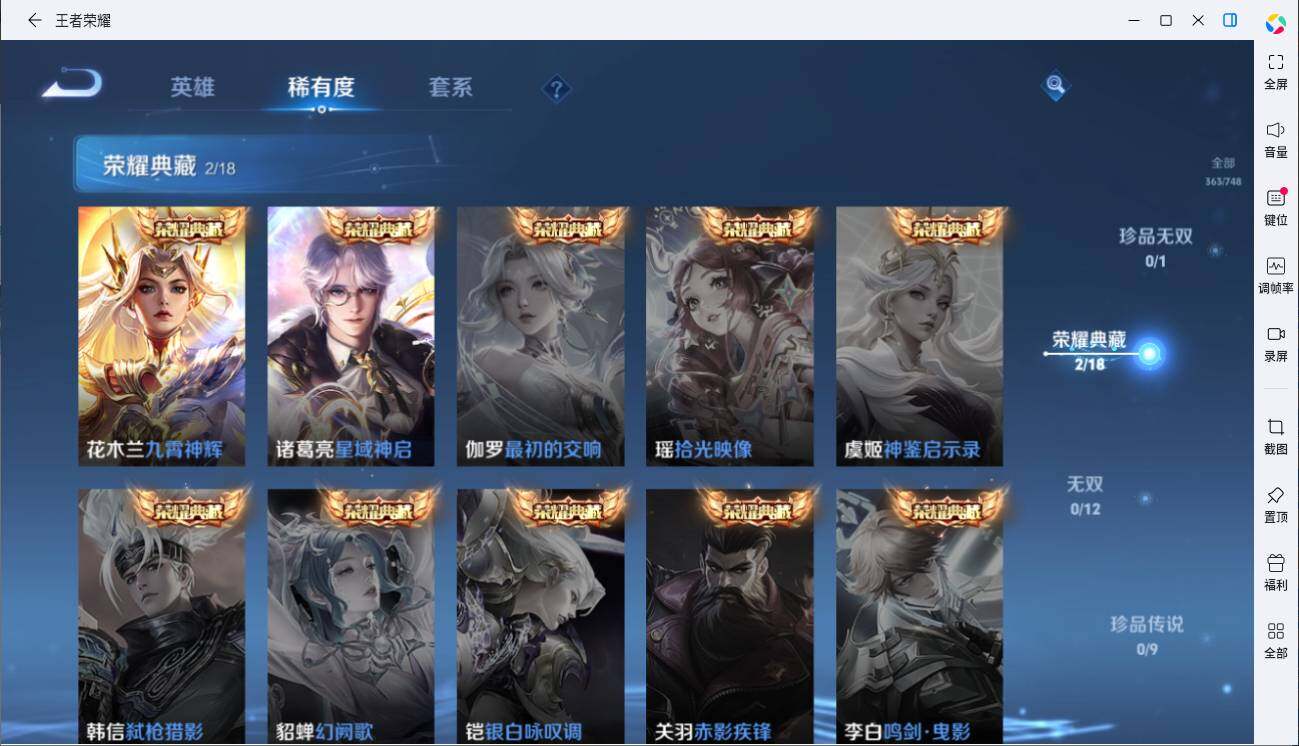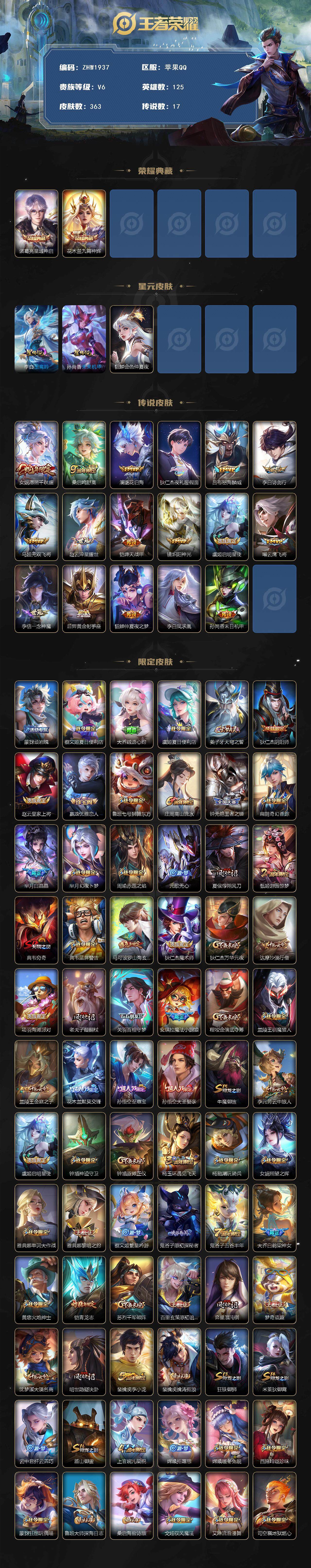 125英雄-363皮肤-【店主推荐捡漏号!可直接换绑】苹果q-v6-至尊星耀iii段位-125英雄-363皮肤-2典藏皮肤-17传说-3星传说-102史诗 【英雄全皮】:鬼谷子全皮,蒙恬全皮,影全皮 【荣耀典藏】:诸葛亮星域神启,花木兰九霄神辉 【传说皮肤】:女娲愿照千秋盛,桑启鸣野蒿,澜逐花归海,狄仁杰夜礼服假面,吕布怒