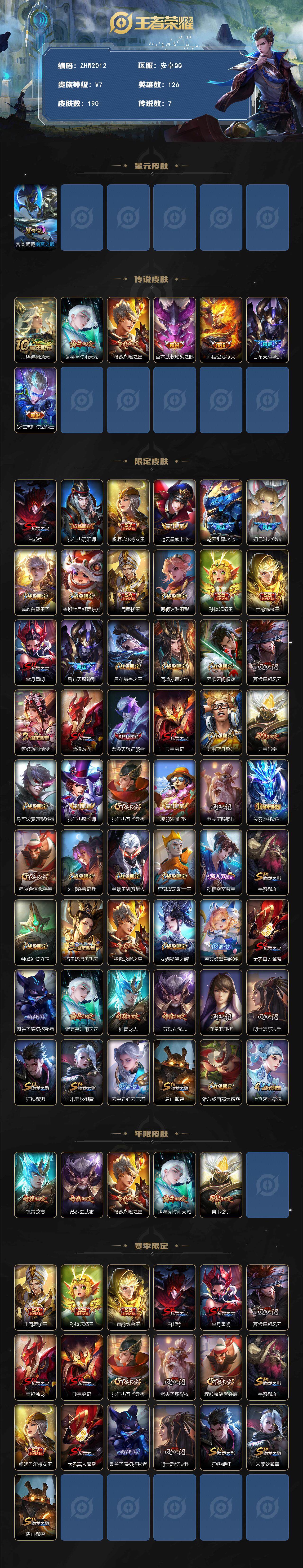 126英雄-190皮肤-可二次【店主推荐捡漏号!可直接换绑】安卓q-v7-至尊星耀ii段位-126英雄-190皮肤-1星传说-7传说-45史诗 【传说皮肤】:后羿神树通天,诸葛亮时雨天司,杨戬永曜之星,宫本武藏地狱之眼,孙悟空地狱火,吕布天魔缭乱,狄仁杰超时空战士 【限定皮肤】:白起狰,狄仁杰阴阳师,虞姬凯尔特女王,赵云皇