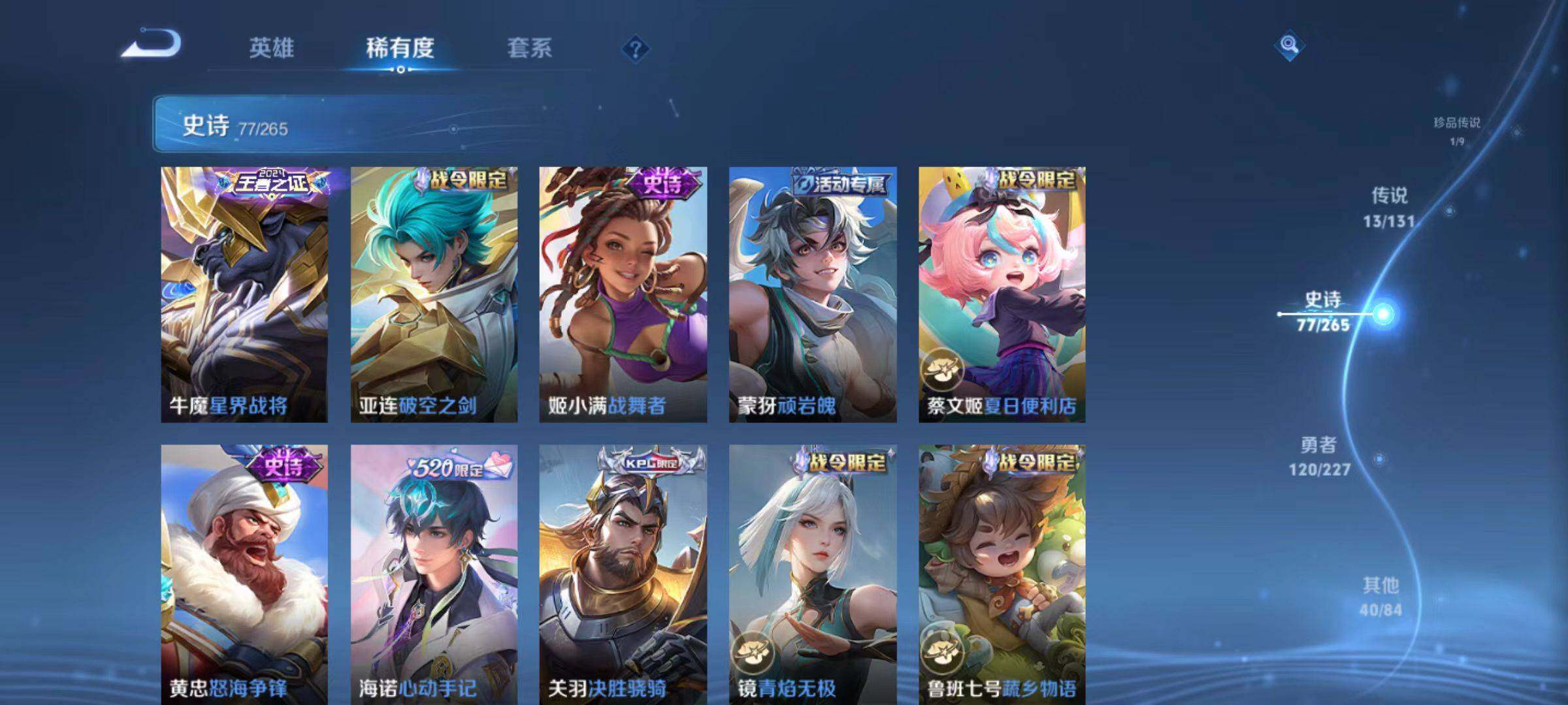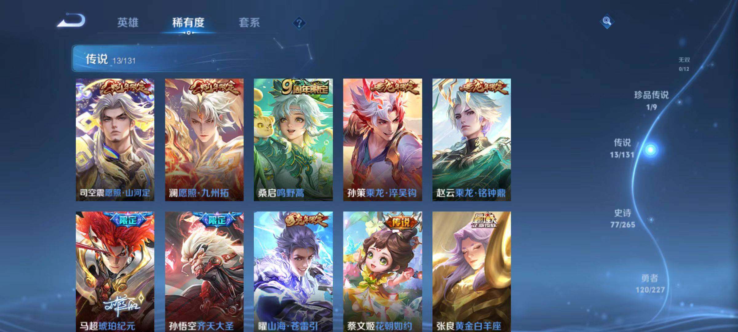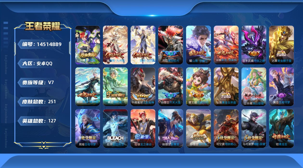 [14514889]安卓q-v7-至尊星耀v段位-127英雄-251皮肤-1典藏英雄-1珍品传说-13传说-77史诗 【英雄全皮】:孙权全皮,司空震全皮,影全皮,海诺全皮 【荣耀典藏】:武则天英雄 【珍品传说】:孙策时之奇旅 【传说皮肤】:司空震愿照山河定,澜愿照九州拓,桑启鸣野蒿,孙策乘龙淬吴钩,赵云乘龙铭钟鼎,马超琥珀纪元,孙悟空齐天大圣,曜山海苍雷引,蔡文姬花朝如约,张良黄金白羊座,干将莫邪久胜战神,达摩黄金狮子座,宫本武藏地狱之眼 【限定皮肤】:蒙犽顽岩魄,蔡文姬夏日便利店,虞姬夏日便利店,姜子牙天穹之誓,杨戬破阵退雄兵,狄仁杰阴阳师,赵云皇家上将,孙尚香蔷薇恋人,芈月幻夜卜梦,吕布猎兽之王,元歌无心,马可波罗暗影游猎,马可波罗山海玄木吟,狄仁杰魔术师,达摩星际陆战队,项羽海滩派对,韩信傲雪梅呛,兰陵王驯魔猎人,兰陵王金庭之子,孙悟空至尊宝,孙悟空孙行者,孙悟空齐天大圣,李元芳云中旅人,鬼谷子五谷丰年,铠青龙志,百里玄策原初追逐者,沈梦溪大漠名商,裴擒虎李小龙,裴擒虎擒涛扼浪,云中君纤云弄巧,上官婉儿梁祝,曜山海苍雷引,鲁班大师探海日志,桑启海盐诗旅,暃星界游侠,艾琳流音漫舞,司空震地狱燃心,阿古朵江河有灵,张良古海寻踪,蒙犽百解令,蒙恬荣光圣徽,高渐离燃音魔法,妲己灵卜魔法,鬼谷子天穹祈灯,马超琥珀纪元,孙策乘龙淬吴钩,赵云乘龙铭钟鼎,沈梦溪龙舞盛年,鲁班七号蔬乡物语,李元芳蔬乡物语,刘邦剑破天穹,程咬金群星魔术团,关羽决胜骁骑,镜青焰无极,项羽苍威无极,海诺心动手记,周瑜熔金海岸 【年限皮肤】:铠青龙志,马可波罗山海玄木吟,曜山海苍雷引,孙策乘龙淬吴钩,赵云乘龙铭钟鼎 【赛季限定】:兰陵王金庭之子,张良古海寻踪,李元芳云中旅人,百里玄策原初追逐者,沈梦溪大漠名商,裴擒虎擒涛扼浪,鲁班大师探海日志,桑启海盐诗旅,鬼谷子天穹祈灯,蒙恬荣光圣徽,刘邦剑破天穹,姜子牙天穹之誓 【战令限定】:蔡文姬夏日便利店,虞姬夏日便利店,芈月幻夜卜梦,吕布猎兽之王,马可波罗暗影游猎,达摩星际陆战队,兰陵王驯魔猎人,艾琳流音漫舞,司空震地狱燃心,暃星界游侠,高渐离燃音魔法,妲己灵卜魔法,鲁班七号蔬乡物语,李元芳蔬乡物语,镜青焰无极,项羽苍威无极 【史诗皮肤】:赵云皇家上将,赵云未来纪元,甄姬冰雪圆舞曲,王昭君偶像歌手,狄仁杰魔术师,宫本武藏鬼剑武藏,孙尚香蔷薇恋人,孙尚香水果甜心,嬴政暗夜贵公子