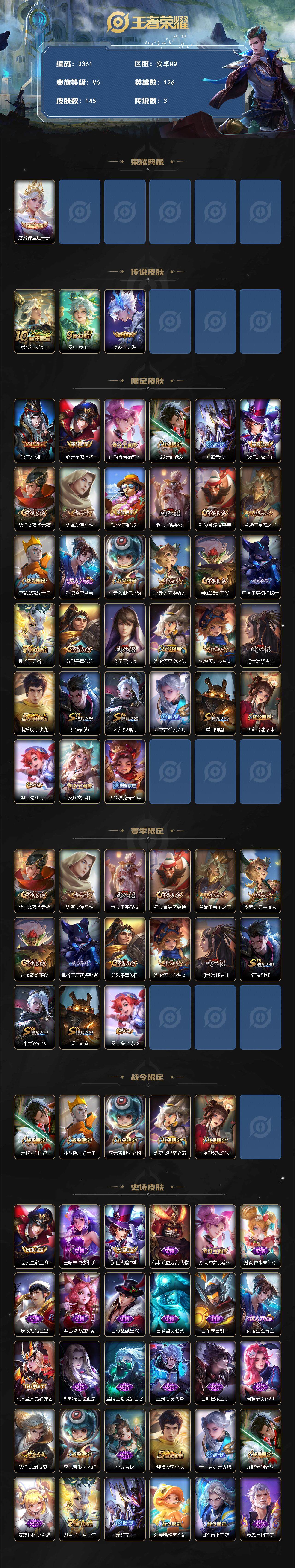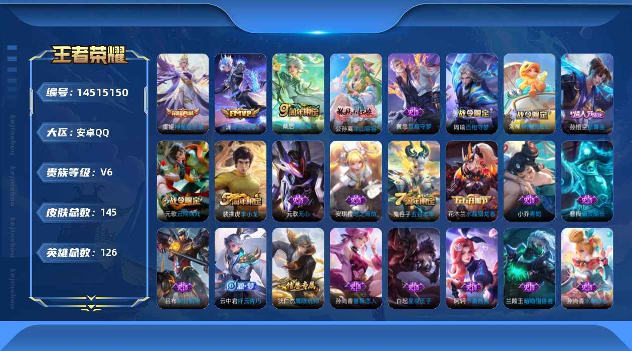 [14515150]安卓q-v6-最强王者段位-126英雄-145皮肤-1典藏皮肤-3传说-31史诗 【英雄全皮】:孙权全皮,空空儿全皮 【荣耀典藏】:虞姬神鉴启示录 【传说皮肤】:后羿神树通天,桑启鸣野蒿,澜逐花归海 【限定皮肤】:狄仁杰阴阳师,赵云皇家上将,孙尚香蔷薇恋人,元歌云间偶戏,元歌无心,狄仁杰魔术师,狄仁杰万华元夜,达摩沙漠行僧,项羽海滩派对,老夫子醍醐杖,程咬金演武夺筹,兰陵王金庭之子,亚瑟潮玩骑士王,孙悟空至尊宝,李元芳银河之约,李元芳云中旅人,钟馗驱傩正仪,鬼谷子原初探秘者,鬼谷子五谷丰年,苏烈千军破阵,弈星混沌棋,沈梦溪星空之诺,沈梦溪大漠名商,明世隐疑决卦,裴擒虎李小龙,狂铁御狮,米莱狄御霄,云中君纤云弄巧,盾山御銮,西施玲珑珍味,桑启海盐诗旅,艾琳女武神,沈梦溪龙舞盛年 【赛季限定】:狄仁杰万华元夜,达摩沙漠行僧,老夫子醍醐杖,程咬金演武夺筹,兰陵王金庭之子,李元芳云中旅人,钟馗驱傩正仪,鬼谷子原初探秘者,苏烈千军破阵,弈星混沌棋,沈梦溪大漠名商,明世隐疑决卦,狂铁御狮,米莱狄御霄,盾山御銮,桑启海盐诗旅 【战令限定】:元歌云间偶戏,亚瑟潮玩骑士王,李元芳银河之约,沈梦溪星空之诺,西施玲珑珍味 【史诗皮肤】:赵云皇家上将,王昭君偶像歌手,狄仁杰魔术师,宫本武藏鬼剑武藏,孙尚香蔷薇恋人,孙尚香水果甜心,嬴政摇滚巨星,妲己魅力维加斯,吕布圣诞狂欢,曹操幽灵船长,吕布末日机甲,孙悟空至尊宝,花木兰水晶猎龙者,刘邦德古拉伯爵,兰陵王暗隐猎兽者,亚瑟心灵战警,白起星夜王子,阿轲节奏热浪,狄仁杰鹰眼统帅,李元芳银河之约,小乔青蛇,裴擒虎李小龙,云中君纤云弄巧,元歌云间偶戏,安琪拉时之奇旅,鬼谷子五谷丰年,元歌无心,刘禅鸭鸭历险记,周瑜百相守梦,黄忠百相守梦,公孙离涂山容容 【其他皮肤】:项羽海滩派对,韩信教廷特使,韩信街头霸王,阿轲爱心护理,达摩大发明家,赵云忍炎影,芈月红桃皇后,艾琳女武神,扁鹊化身博士,扁鹊救世之瞳,安琪拉玩偶对对碰,姜子牙时尚教父,典韦黄金武士,亚瑟死亡骑士,达摩拳王,花木兰兔女郎,狄仁杰阴阳师,刘备汉昭烈帝,钟无艳海滩丽影,宫本武藏霸王丸,王昭君幻想奇妙夜,狂铁命运角斗场,诸葛亮掌控之力,鬼谷子幻乐之宴,狂铁御狮,米莱狄御霄,明世隐虹云星官,盾山御銮,姜子牙炽热元素使,沈梦溪星空之诺,弈星混沌棋,鲁班七号黑桃队长,明世隐疑决卦,盾山圆桌骑士,老夫