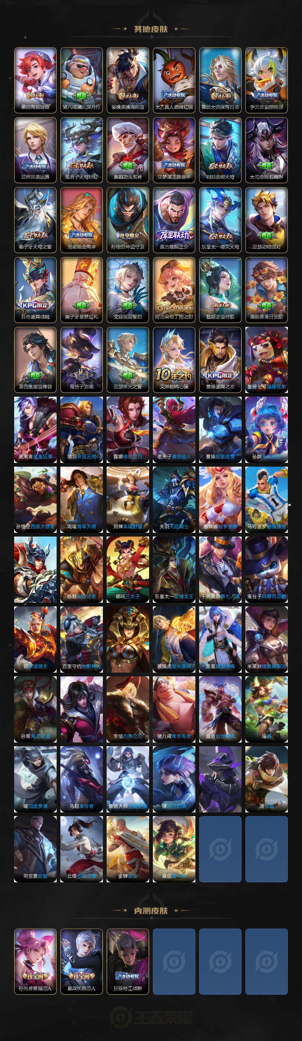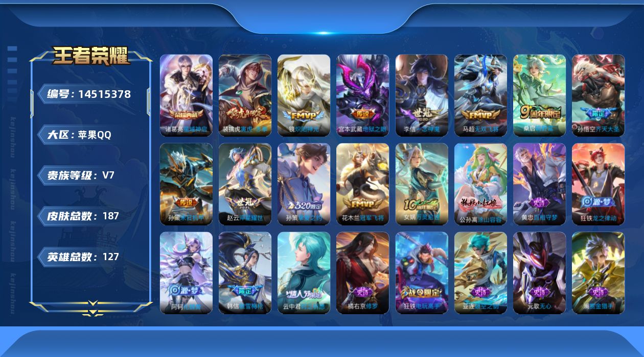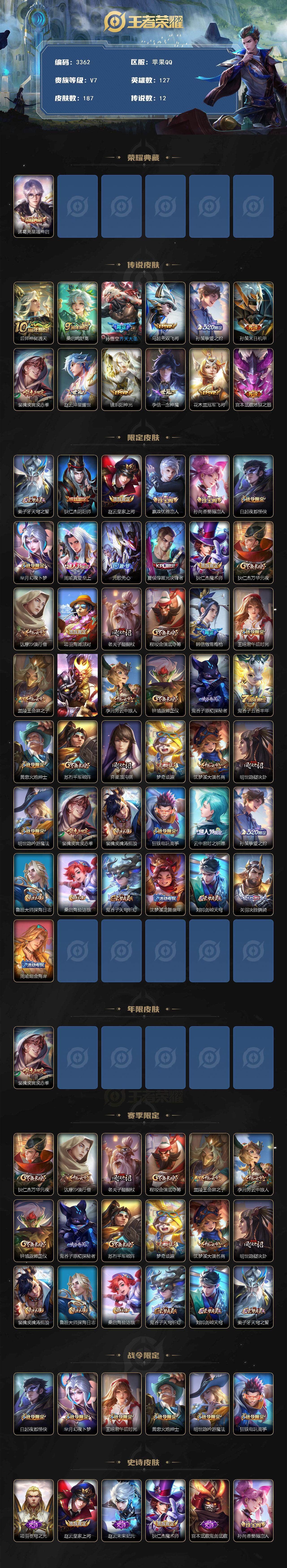[14515378]苹果q-v7-最强王者段位-127英雄-187皮肤-1典藏皮肤-12传说-44史诗 【英雄全皮】:鬼谷子全皮 【荣耀典藏】:诸葛亮星域神启 【传说皮肤】:后羿神树通天,桑启鸣野蒿,孙悟空齐天大圣,马超无双飞将,孙策挚爱之约,孙策末日机甲,裴擒虎寅虎赤拳,赵云淬星耀世,镜炽阳神光,李信一念神魔,花木兰冠军飞将,宫本武藏地狱之眼 【限定皮肤】:姜子牙天穹之誓,狄仁杰阴阳师,赵云皇家上将,嬴政优雅恋人,孙尚香蔷薇恋人,白起夜都怪侠,芈月幻夜卜梦,周瑜真爱至上,元歌无心,夏侯惇匿光决锋者,狄仁杰魔术师,狄仁杰万华元夜,达摩沙漠行僧,项羽海滩派对,老夫子醍醐杖,程咬金演武夺筹,韩信傲雪梅呛,王昭君午后时光,兰陵王金庭之子,孙悟空齐天大圣,李元芳云中旅人,钟馗驱傩正仪,鬼谷子原初探秘者,鬼谷子五谷丰年,黄忠火炮绅士,苏烈千军破阵,弈星混沌棋,梦奇顽趣,沈梦溪大漠名商,明世隐疑决卦,明世隐吟游魔法,裴擒虎寅虎赤拳,裴擒虎擒涛扼浪,狂铁电玩高手,云中君时之祈愿,孙策挚爱之约,鲁班大师探海日志,桑启海盐诗旅,鬼谷子天穹祈灯,沈梦溪龙舞盛年,刘邦剑破天穹,关羽决胜骁骑,周瑜熔金海岸 【年限皮肤】:裴擒虎寅虎赤拳 【赛季限定】:狄仁杰万华元夜,达摩沙漠行僧,老夫子醍醐杖,程咬金演武夺筹,兰陵王金庭之子,李元芳云中旅人,钟馗驱傩正仪,鬼谷子原初探秘者,苏烈千军破阵,弈星混沌棋,梦奇顽趣,沈梦溪大漠名商,明世隐疑决卦,裴擒虎擒涛扼浪,鲁班大师探海日志,桑启海盐诗旅,鬼谷子天穹祈灯,刘邦剑破天穹,姜子牙天穹之誓 【战令限定】:白起夜都怪侠,芈月幻夜卜梦,王昭君午后时光,黄忠火炮绅士,明世隐吟游魔法,狂铁电玩高手 【史诗皮肤】:项羽苍穹之光,赵云皇家上将,赵云未来纪元,狄仁杰魔术师,宫本武藏鬼剑武藏,孙尚香蔷薇恋人,孙尚香水果甜心,嬴政优雅恋人,妲己女仆咖啡,周瑜真爱至上,李白千年之狐,吕布末日机甲,张飞乱世虎臣,刘邦德古拉伯爵,夏侯惇乘风破浪,兰陵王暗隐猎兽者,亚瑟心灵战警,百里守约特工魅影,李元芳逐浪之夏,程咬金功夫厨神,白起星夜王子,孙策猫狗日记,狄仁杰鹰眼统帅,橘右京修罗,黄忠火炮绅士,韩信傲雪梅呛,云中君时之祈愿,澜赏金猎手,明世隐吟游魔法,夏侯惇匿光决锋者,狂铁电玩高手,鬼谷子五谷丰年,元歌无心,梦奇顽趣,关羽决胜骁骑,亚连破空之剑,弈星炽弈燎原,马可波罗星界特工,牛魔星界战将,阿