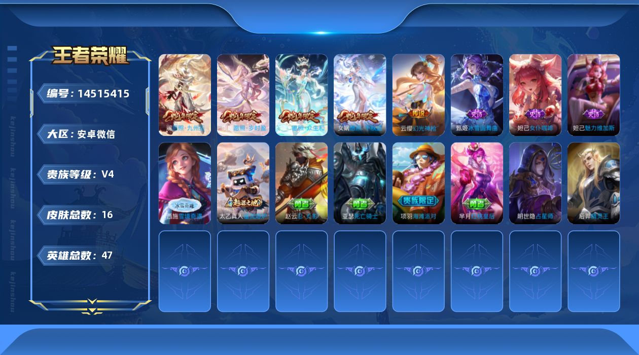 [14515415]v4 5传说 47英雄 16皮肤 可修改实名 【传说皮】:幻光神呛 【史诗皮】:女仆咖啡魅力维加斯 【限定皮】:愿照·九州拓澜年限愿照·岁时盈虞姬年限愿照·众生和妲己年限愿照·千秋盛女娲年限 【普通皮】:谧流熔炉雪境奇遇-西施海滩派对红桃皇后死亡骑士忍·炎影冰雪圆舞曲精灵王占星师