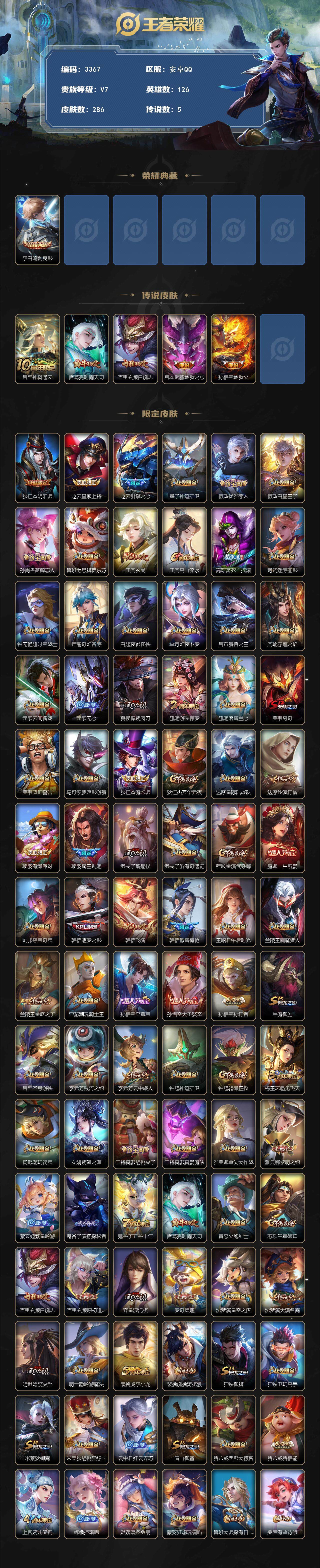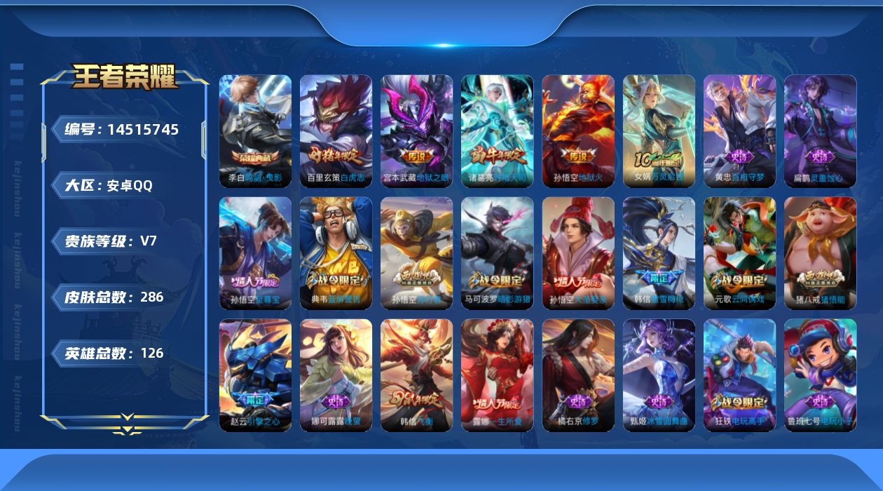 [14515745]安卓q-v7-最强王者段位-126英雄-286皮肤-1典藏皮肤-5传说-100史诗 【英雄全皮】:孙权全皮,鬼谷子全皮,空空儿全皮 【荣耀典藏】:李白鸣剑曳影 【传说皮肤】:后羿神树通天,诸葛亮时雨天司,百里玄策白虎志,宫本武藏地狱之眼,孙悟空地狱火 【限定皮肤】:狄仁杰阴阳师,赵云皇家上将,赵云引擎之心,墨子神迹守卫,嬴政优雅恋人,嬴政白昼王子,孙尚香蔷薇恋人,鲁班七号狮舞东方,庄周玄嵩,庄周高山流水,高渐离死亡摇滚,阿轲迷踪丽影,钟无艳超时空战士,扁鹊奇幻香踪,白起夜都怪侠,芈月幻夜卜梦,吕布猎兽之王,周瑜赤莲之焰,元歌云间偶戏,元歌无心,夏侯惇朔风刀,甄姬游园惊梦,甄姬落雪兰心,典韦穷奇,典韦蓝屏警告,马可波罗暗影游猎,狄仁杰魔术师,狄仁杰万华元夜,达摩星际陆战队,达摩沙漠行僧,项羽海滩派对,项羽霸王别姬,老夫子醍醐杖,老夫子航海奇遇记,程咬金演武夺筹,露娜一生所爱,刘邦夺宝奇兵,韩信逐梦之影,韩信飞衡,韩信傲雪梅呛,王昭君午后时光,兰陵王驯魔猎人,兰陵王金庭之子,亚瑟潮玩骑士王,孙悟空至尊宝,孙悟空大圣娶亲,孙悟空孙行者,牛魔御旌,后羿圣弓游侠,李元芳银河之约,李元芳云中旅人,钟馗神迹守卫,钟馗驱傩正仪,杨玉环遇见飞天,杨戬潮玩骑兵,女娲朔望之晖,干将莫邪胡桃夹子,干将莫邪真爱魔法,雅典娜单词大作战,雅典娜黎明之约,蔡文姬繁星吟游,鬼谷子原初探秘者,鬼谷子五谷丰年,诸葛亮时雨天司,黄忠火炮绅士,苏烈千军破阵,百里玄策白虎志,百里玄策原初追逐者,弈星混沌棋,梦奇顽趣,沈梦溪星空之诺,沈梦溪大漠名商,明世隐疑决卦,明世隐吟游魔法,裴擒虎李小龙,裴擒虎擒涛扼浪,狂铁御狮,狂铁电玩高手,米莱狄御霄,米莱狄胡桃异想国,云中君纤云弄巧,盾山御銮,猪八戒西部大镖客,猪八戒猪悟能,上官婉儿梁祝,嫦娥拒霜思,嫦娥暖冬兔眠,蒙犽狂想玩偶喵,鲁班大师探海日志,桑启海盐诗旅,暃星界游侠,阿古朵江河有灵,张良古海寻踪,蒙恬荣光圣徽,鬼谷子天穹祈灯,沈梦溪龙舞盛年,程咬金群星魔术团,周瑜熔金海岸 【年限皮肤】:百里玄策白虎志,诸葛亮时雨天司,韩信飞衡,庄周玄嵩 【赛季限定】:夏侯惇朔风刀,典韦穷奇,狄仁杰万华元夜,达摩沙漠行僧,老夫子醍醐杖,程咬金演武夺筹,兰陵王金庭之子,张良古海寻踪,牛魔御旌,李元芳云中旅人,钟馗驱傩正仪,雅典娜黎明之约,鬼谷子原初探秘者,苏烈千军破阵,百里玄策原