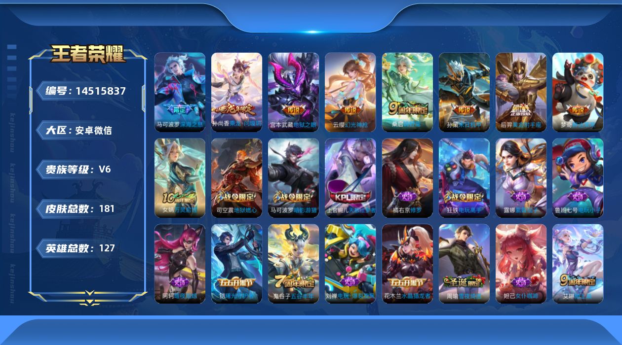 [14515837]v6 9传说 127英雄 181皮肤 可修改实名 【英雄全皮】:敖隐全皮 【稀有英雄】:敖隐小龙人大司命嬴政始皇帝韩信韩跳跳夏洛特夏师傅艾琳橘右京橘子娜可露露鸟人不知火舞赵云金蝉唐僧戈娅 【传说皮】:乘龙·问璇玑孙尚香年限神树通天幻光神呛黄金射手座地狱之眼胖达荣荣末日机甲-孙策 【珍宝阁皮】:万物之道蔷薇恋人玩趣恶龙 【赛季/战令皮】:噬灭天穹s37古海寻踪s33星界游侠海盐诗旅s30擒涛扼浪s31探海日志s32流音漫舞顽趣-梦奇地狱燃心剑破天穹s35天穹祈灯s34青焰无极苍威无极天穹之誓s36蔡文姬夏日便利店虞姬夏日便利店暖冬·兔眠暗影游猎游乐娃子沙漠行僧s26金庭之子s27电玩高手电玩铁子午后时光大漠名商s28云中旅人s29 【史诗皮】:茶境仙星界战将蒙犽顽岩魄蔬乡物语鲁班七号万灵启世紫霞仙子苍穹之光电玩小子小书包特工魅影千年之狐匿光侦查者江河有灵高渐离燃音魔法雪夜绮愿周瑜百解令蒙犽蒙恬荣光圣徽冰冠公主偶像歌手电玩·爆裂旋风暗夜猫娘末日机甲-吕布乱世虎臣节奏热浪修罗女仆咖啡摇滚巨星水果甜心绅士熊喵心灵骇客功夫厨神暗隐猎兽者鬼剑武藏舞动绿茵地狱岩魂拒霜思乘风破浪逐浪之夏月团寄思水晶猎龙者曙光守护者箭羽风息金属风暴原初追逐者圣诞狂欢圣诞恋歌鹰眼统帅暗夜贵公子魅力维加斯黎明之约 【限定皮】:陌上桑鸣野蒿五谷丰年梁祝天狼绘梦者深海之息深海大菠萝神器·万象笔 【普通皮】:苍林狼骑访茗客铁骨偃魂谧流熔炉劲辣红锅暗都幽影程咬金群星魔术团蔬乡物语李元芳春野之旅龙舞盛年朵莉亚金色潮汐亚瑟鸿运当头功夫炙烤漠中幻影街头霸王雪境奇遇-西施星梦巡礼鹤鸣心笺荣光之誓春野闲踪景韶洛都玫蓝誓约虚灵犬护浪漫序章灵野札记布丁狗之约命运加冕危途狂花聚星闪耀西部游侠妄想特派热血海滩尼罗河女神完美运算妲己灵卜魔法鬼谷子天穹祈灯s34时空谍影万事如意五福同心龙腾万里花好人间海滩丽影海滩派对皇家上将掌控之力守护之力