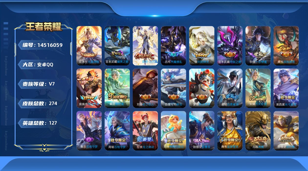 [14516059]安卓q-v7-最强王者段位-127英雄-274皮肤-1典藏皮肤-13传说-63史诗-1星元 【英雄全皮】:蒙恬全皮 【荣耀典藏】:花木兰九霄神辉 【传说皮肤】:后羿神树通天,司空震愿照山河定,裴擒虎祥瑞亨通,桑启鸣野蒿,典韦战鼓燎原,百里守约碎云,镜炽阳神光,李信一念神魔,刘备时之恋人,虞姬云霓雀翎,梦奇胖达荣荣,宫本武藏地狱之眼,吕布天魔缭乱 【限定皮肤】:白起狰,大乔绒语心约,姜子牙天穹之誓,狄仁杰阴阳师,虞姬凯尔特女王,赵云皇家上将,庄周蜃楼王,庄周高山流水,高渐离玩趣恶龙,孙膑妖精王,扁鹊炼金王,芈月重明,吕布天魔缭乱,夏侯惇朔风刀,曹操烛龙,典韦穷奇,典韦蓝屏警告,狄仁杰魔术师,狄仁杰万华元夜,达摩沙漠行僧,项羽海滩派对,老夫子醍醐杖,程咬金演武夺筹,韩信逐梦之影,兰陵王金庭之子,孙悟空至尊宝,孙悟空孙行者,牛魔御旌,李元芳云中旅人,钟馗驱傩正仪,杨玉环遇见飞天,杨戬潮玩骑兵,女娲朔望之晖,雅典娜黎明之约,太乙真人饕餮,鬼谷子原初探秘者,黄忠烈魂,苏烈千军破阵,百里玄策原初追逐者,弈星混沌棋,梦奇顽趣,沈梦溪大漠名商,明世隐疑决卦,狂铁御狮,米莱狄御霄,盾山御銮,嫦娥拒霜思,张良古海寻踪,蒙恬荣光圣徽,鬼谷子天穹祈灯,姬小满妄想食味,刘邦剑破天穹,程咬金群星魔术团,刘备异域游侠,周瑜熔金海岸 【年限皮肤】:马超神威,黄忠烈魂 【赛季限定】:庄周蜃楼王,孙膑妖精王,扁鹊炼金王,白起狰,芈月重明,夏侯惇朔风刀,曹操烛龙,典韦穷奇,狄仁杰万华元夜,达摩沙漠行僧,老夫子醍醐杖,程咬金演武夺筹,兰陵王金庭之子,张良古海寻踪,牛魔御旌,李元芳云中旅人,虞姬凯尔特女王,钟馗驱傩正仪,雅典娜黎明之约,太乙真人饕餮,鬼谷子原初探秘者,苏烈千军破阵,百里玄策原初追逐者,弈星混沌棋,梦奇顽趣,沈梦溪大漠名商,明世隐疑决卦,狂铁御狮,米莱狄御霄,盾山御銮,鬼谷子天穹祈灯,蒙恬荣光圣徽,刘邦剑破天穹,姜子牙天穹之誓 【战令限定】:典韦蓝屏警告,杨戬潮玩骑兵,女娲朔望之晖 【史诗皮肤】:露娜紫霞仙子,赵云皇家上将,甄姬冰雪圆舞曲,王昭君偶像歌手,狄仁杰魔术师,廉颇地狱岩魂,宫本武藏鬼剑武藏,孙尚香水果甜心,嬴政暗夜贵公子,妲己魅力维加斯,妲己女仆咖啡,墨子龙骑士,墨子金属风暴,刘禅绅士熊喵,曹操幽灵船长,李白千年之狐,韩信白龙吟,孙悟空至尊宝,花木兰水晶猎龙者,韩信逐梦之影,夏侯惇