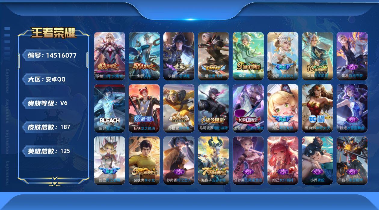 [14516077]【店主推荐捡漏号!可直接换绑】安卓q-v6-至尊星耀ii段位-125英雄-187皮肤-6传说-46史诗 【英雄全皮】:李信全皮,空空儿全皮 【传说皮肤】:桑启鸣野蒿,伽罗炽翼辉光,李信山海炽霜斩,曜云鹰飞将,李信一念神魔,伽罗太华 【限定皮肤】:姜子牙天穹之誓,杨戬破阵退雄兵,狄仁杰阴阳师,赵云皇家上将,妲己时之彼端,妲己时之奇旅,孙尚香蔷薇恋人,阿轲迷踪丽影,钟无艳超时空战士,夏侯惇朔风刀,甄姬落雪兰心,马可波罗暗影游猎,狄仁杰魔术师,狄仁杰万华元夜,项羽海滩派对,老夫子醍醐杖,程咬金演武夺筹,刘邦夺宝奇兵,孙悟空美猴王,孙悟空孙行者,李元芳云中旅人,钟馗驱傩正仪,干将莫邪胡桃夹子,鬼谷子原初探秘者,鬼谷子五谷丰年,弈星混沌棋,沈梦溪大漠名商,明世隐疑决卦,裴擒虎李小龙,裴擒虎擒涛扼浪,云中君纤云弄巧,李信山海炽霜斩,伽罗太华,伽罗天狼溯光者,伽罗炽翼辉光,猪八戒西部大镖客,上官婉儿天狼绘梦者,鲁班大师探海日志,桑启海盐诗旅,阿古朵江河有灵,张良古海寻踪,鬼谷子天穹祈灯,沈梦溪龙舞盛年,刘邦剑破天穹,程咬金群星魔术团,刘备异域游侠 【年限皮肤】:孙悟空美猴王,伽罗太华,李信山海炽霜斩,伽罗炽翼辉光 【赛季限定】:夏侯惇朔风刀,狄仁杰万华元夜,老夫子醍醐杖,程咬金演武夺筹,张良古海寻踪,李元芳云中旅人,钟馗驱傩正仪,鬼谷子原初探秘者,弈星混沌棋,沈梦溪大漠名商,明世隐疑决卦,裴擒虎擒涛扼浪,鲁班大师探海日志,桑启海盐诗旅,鬼谷子天穹祈灯,刘邦剑破天穹,姜子牙天穹之誓 【战令限定】:阿轲迷踪丽影,钟无艳超时空战士,甄姬落雪兰心,马可波罗暗影游猎,刘邦夺宝奇兵,猪八戒西部大镖客 【史诗皮肤】:赵云皇家上将,赵云未来纪元,甄姬冰雪圆舞曲,狄仁杰魔术师,廉颇地狱岩魂,宫本武藏鬼剑武藏,孙尚香蔷薇恋人,孙尚香水果甜心,妲己魅力维加斯,妲己女仆咖啡,墨子金属风暴,吕布圣诞狂欢,吕布末日机甲,刘邦德古拉伯爵,小乔缤纷独角兽,兰陵王暗隐猎兽者,诸葛亮黄金分割率,安琪拉心灵骇客,百里守约特工魅影,蔡文姬舞动绿茵,刘禅天才门将,李元芳逐浪之夏,白起星夜王子,孙策猫狗日记,伽罗箭羽风息,狄仁杰鹰眼统帅,公孙离无限星赏官,妲己时之彼端,小乔青蛇,阿轲迷踪丽影,孙尚香时之恋人,上官婉儿天狼绘梦者,马可波罗暗影游猎,裴擒虎李小龙,云中君纤云弄巧,伽罗天狼溯光者,孙悟空孙行者,钟无艳超时空战士