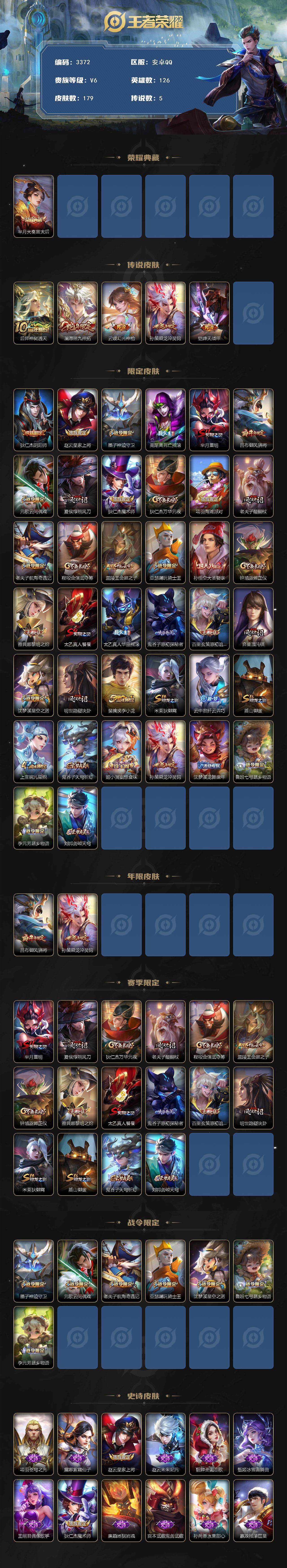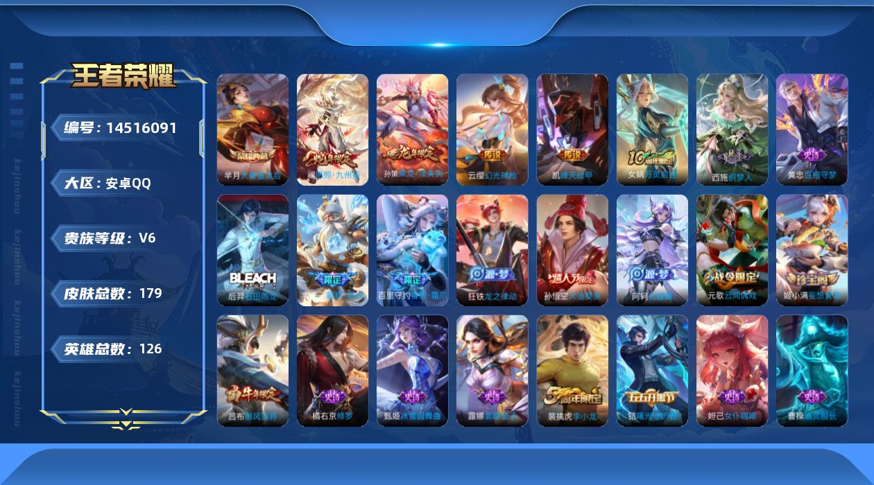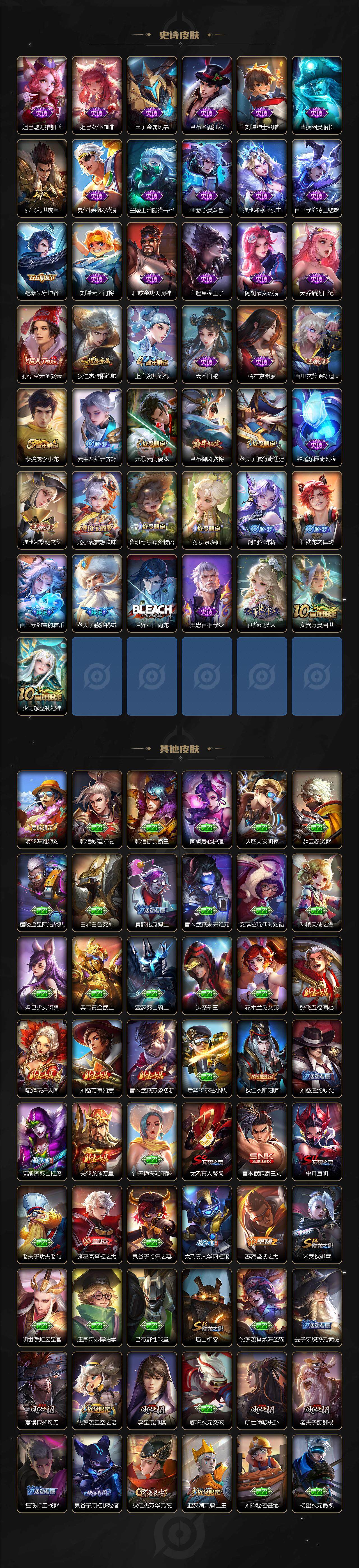 [14516091]安卓q-v6-最强王者段位-126英雄-179皮肤-1典藏皮肤-5传说-55史诗 【荣耀典藏】:芈月大秦宣太后 【传说皮肤】:后羿神树通天,澜愿照九州拓,云缨幻光神呛,孙策乘龙淬吴钩,铠绛天战甲 【限定皮肤】:狄仁杰阴阳师,赵云皇家上将,墨子神迹守卫,高渐离死亡摇滚,芈月重明,吕布御风骁将,元歌云间偶戏,夏侯惇朔风刀,狄仁杰魔术师,狄仁杰万华元夜,项羽海滩派对,老夫子醍醐杖,老夫子航海奇遇记,程咬金演武夺筹,兰陵王金庭之子,亚瑟潮玩骑士王,孙悟空大圣娶亲,钟馗驱傩正仪,雅典娜黎明之约,太乙真人饕餮,太乙真人华丽摇滚,鬼谷子原初探秘者,百里玄策原初追逐者,弈星混沌棋,沈梦溪星空之诺,明世隐疑决卦,裴擒虎李小龙,米莱狄御霄,云中君纤云弄巧,盾山御銮,上官婉儿梁祝,鬼谷子天穹祈灯,姬小满妄想食味,孙策乘龙淬吴钩,沈梦溪龙舞盛年,鲁班七号蔬乡物语,李元芳蔬乡物语,刘邦剑破天穹 【年限皮肤】:吕布御风骁将,孙策乘龙淬吴钩 【赛季限定】:芈月重明,夏侯惇朔风刀,狄仁杰万华元夜,老夫子醍醐杖,程咬金演武夺筹,兰陵王金庭之子,钟馗驱傩正仪,雅典娜黎明之约,太乙真人饕餮,鬼谷子原初探秘者,百里玄策原初追逐者,弈星混沌棋,明世隐疑决卦,米莱狄御霄,盾山御銮,鬼谷子天穹祈灯,刘邦剑破天穹 【战令限定】:墨子神迹守卫,元歌云间偶戏,老夫子航海奇遇记,亚瑟潮玩骑士王,沈梦溪星空之诺,鲁班七号蔬乡物语,李元芳蔬乡物语 【史诗皮肤】:项羽苍穹之光,露娜紫霞仙子,赵云皇家上将,赵云未来纪元,貂蝉圣诞恋歌,甄姬冰雪圆舞曲,王昭君偶像歌手,狄仁杰魔术师,廉颇地狱岩魂,宫本武藏鬼剑武藏,孙尚香水果甜心,嬴政摇滚巨星,妲己魅力维加斯,妲己女仆咖啡,墨子金属风暴,吕布圣诞狂欢,刘禅绅士熊喵,曹操幽灵船长,张飞乱世虎臣,夏侯惇乘风破浪,兰陵王暗隐猎兽者,亚瑟心灵战警,雅典娜冰冠公主,百里守约特工魅影,铠曙光守护者,刘禅天才门将,程咬金功夫厨神,白起星夜王子,阿轲节奏热浪,大乔猫狗日记,孙悟空大圣娶亲,狄仁杰鹰眼统帅,上官婉儿梁祝,大乔白蛇,橘右京修罗,百里玄策原初追逐者,裴擒虎李小龙,云中君纤云弄巧,元歌云间偶戏,吕布御风骁将,老夫子航海奇遇记,钟馗乐园奇幻夜,雅典娜黎明之约,姬小满妄想食味,鲁班七号蔬乡物语,孙膑茶境仙,阿轲化蝶舞,狂铁龙之律动,百里守约雪豹霜爪,老夫子藏狐褐绒,后羿石田雨龙,黄忠百相守梦