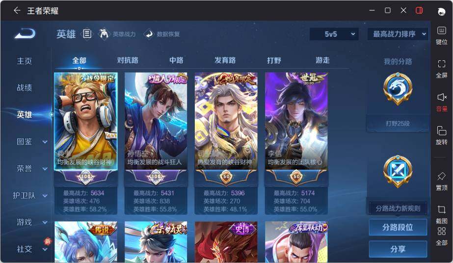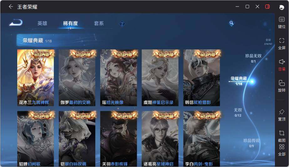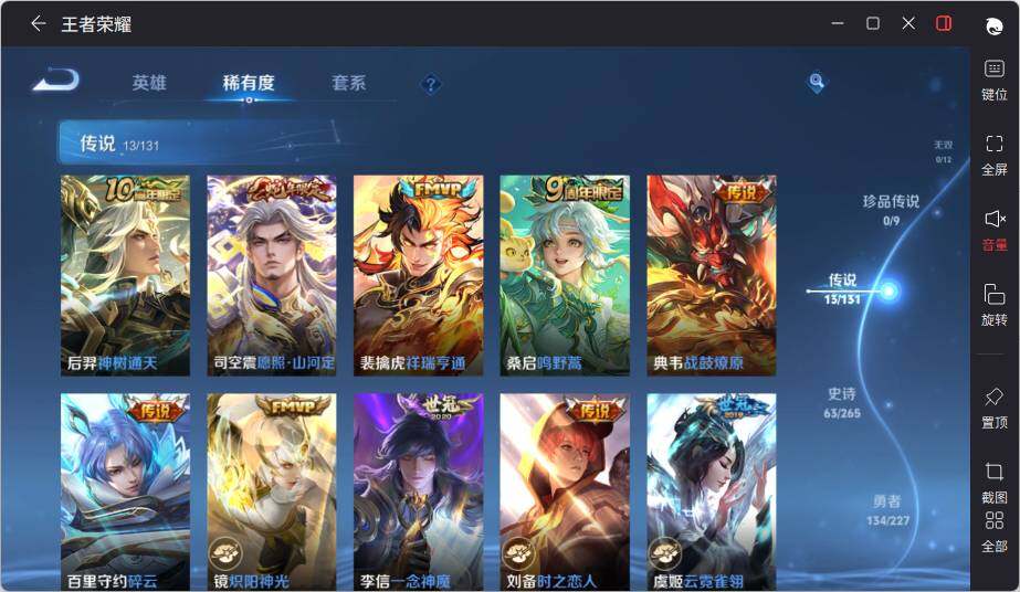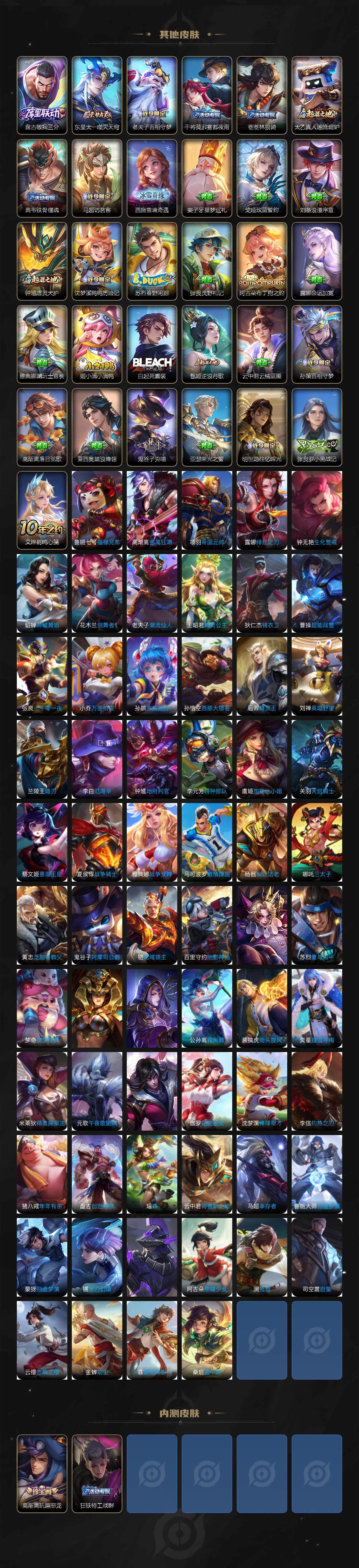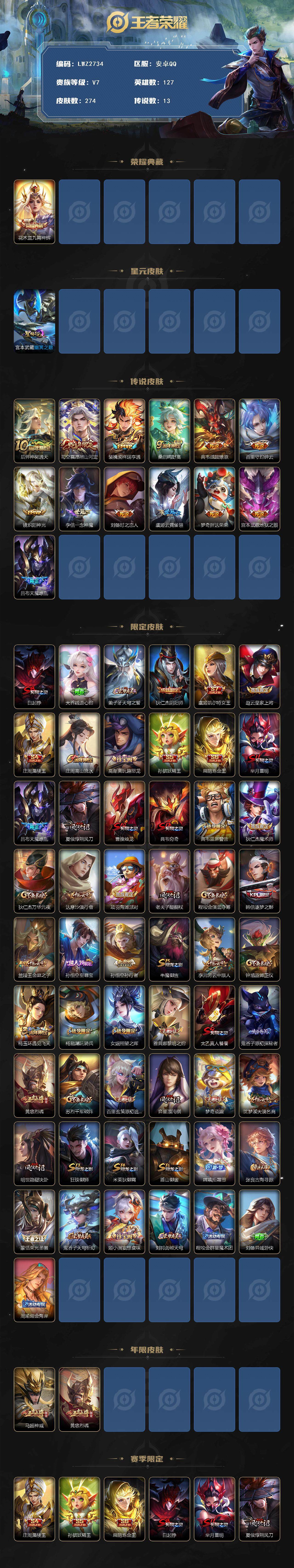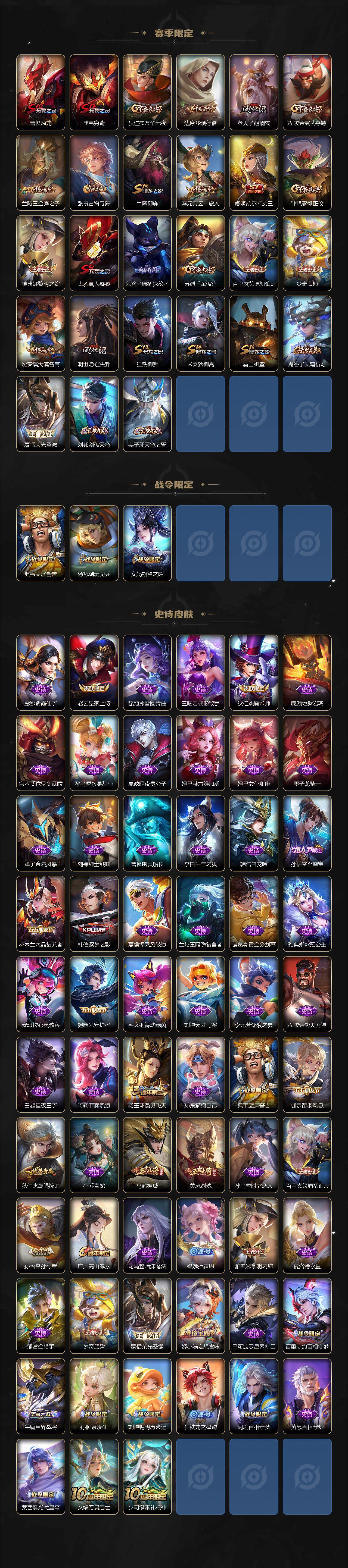 127英雄-274皮肤-安卓q-v7-最强王者段位-127英雄-274皮肤-1典藏皮肤-13传说-63史诗-1星元 【英雄全皮】:蒙恬全皮 【荣耀典藏】:花木兰九霄神辉 【传说皮肤】:后羿神树通天,司空震愿照山河定,裴擒虎祥瑞亨通,桑启鸣野蒿,典韦战鼓燎原,百里守约碎云,镜炽阳神光,李信一念神魔,刘备时之恋人,虞姬云霓雀翎