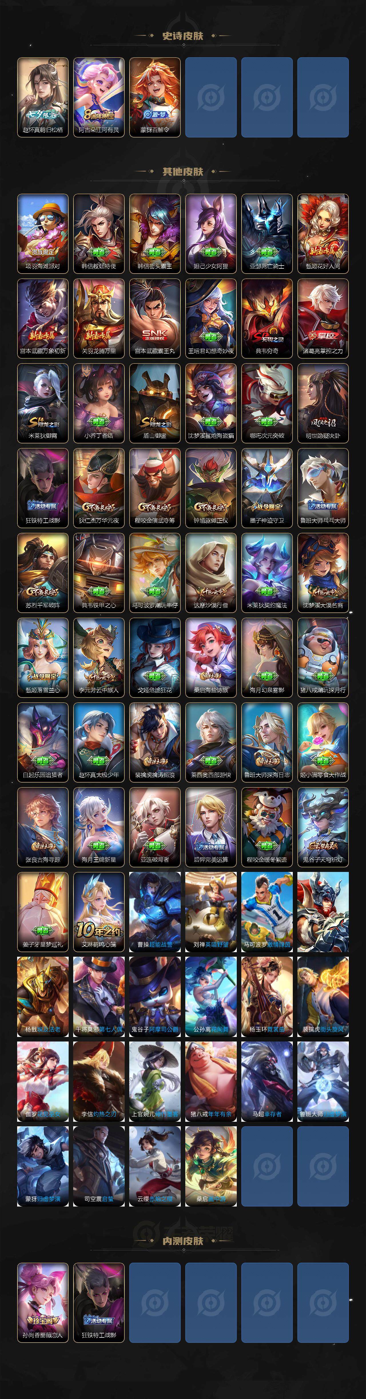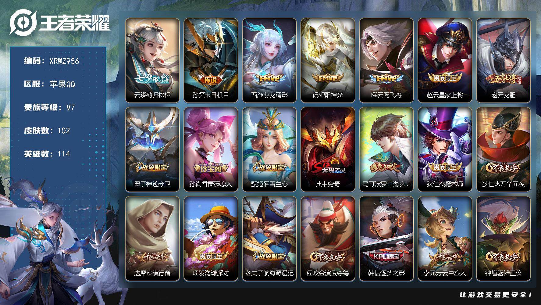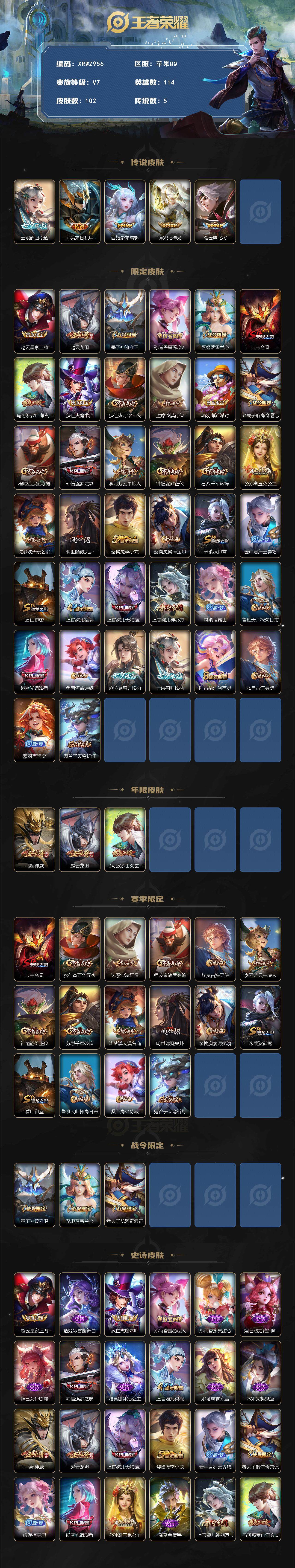 [14368556]43509-苹果q-可二次-v7-秩序白银ii段位-114英雄-102皮肤-5传说-27史诗 【传说皮肤】:云缨鹤归松栖,孙策末日机甲,西施游龙清影,镜炽阳神光,曜云鹰飞将 【限定皮肤】:赵云皇家上将,赵云龙胆,墨子神迹守卫,孙尚香蔷薇恋人,甄姬落雪兰心,典韦穷奇,马可波罗山