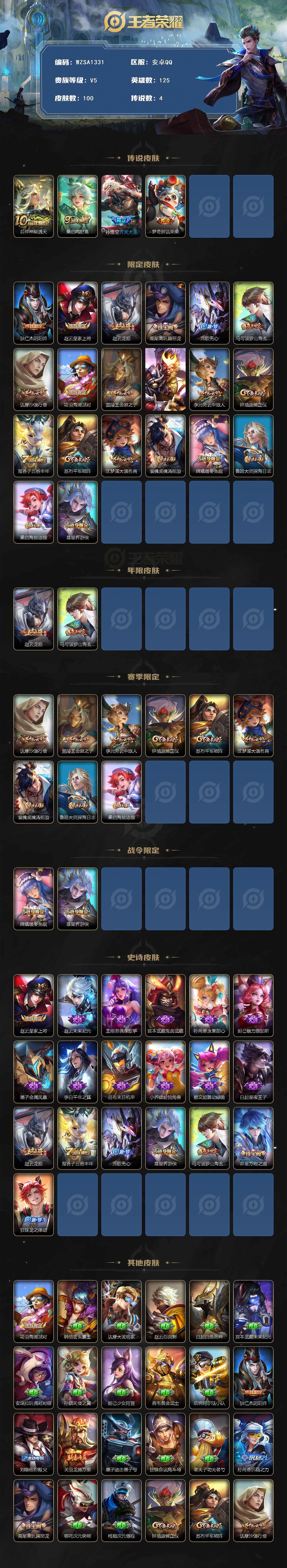 【wzsa1331】贵族5/皮肤100/传说4/史诗19/英雄125/后羿神树通天/桑启鸣野蒿/孙悟空齐天大圣/梦奇胖达荣荣/狄仁杰阴阳师/赵云皇家上将/赵云龙胆/高渐离玩趣恶龙/元歌无心/马可波罗山海玄木吟/达摩沙漠行僧/项羽海滩派对/兰陵王金庭之子/李元芳云中旅人/钟馗驱傩正仪/鬼谷子五谷丰年/苏烈千军破阵/沈梦溪大漠名商/裴擒虎擒涛扼浪/嫦娥暖冬兔眠/鲁班大师探海日志/桑启海盐诗旅/暃星界游侠/赵云未来纪元/王昭君偶像歌手/宫本武藏鬼剑武藏/孙尚香水果甜心/妲己魅力维加斯/墨子金属风暴/李白千年之狐/吕布末日机甲/小乔缤纷独角兽/蔡文姬舞动绿茵/白起星夜王子/弈星万物之道/狂铁龙之律动/韩信街头霸王/达摩大发明家/赵云忍炎影/白起白色死神/宫本武藏未来纪元/安琪拉玩偶对对碰/孙膑天使之翼/妲己少女阿狸/典韦黄金武士/后羿阿尔法小队/刘备纽约教父/关羽龙腾万里/墨子进击墨子号/狂铁命运角斗场/老夫子功夫老勺/孙尚香沉稳之力/哪吒次元突破/杨戬次元傲视/蒙恬蔚蓝守将/刘备潮玩造梦师/海月幻泉雾影/猪八戒潮玩探月行/牛魔牛运亨通/白起乐园追猎者/赵怀真太极少年/姬小满零食大作战/后羿完美运算/东皇太一噬灭天穹/干将莫邪雾都夜雨/吕布逐霄战戟/苍苍林狼骑/太乙真人谧流熔炉/典韦铁骨偃魂/西施雪境奇遇/戈娅玫蓝誓约/刘备浪漫序章/钟馗虚灵犬护/苏烈春野闲踪/张良灵野札记/阿古朵布丁狗之约/艾琳鹤鸣心笺/鲁班七号木偶奇遇记/貂蝉异域舞娘/老夫子潮流仙人/小乔万圣前夜/刘禅英喵野望/李白范海辛/虞姬加勒比小姐/苍维京掠夺者/杨戬埃及法老/黄忠芝加哥教父/干将莫邪第七人偶/鬼谷子阿摩司公爵/百里守约绝影神呛/孙策海之征途/司马懿魇语军师/李信灼热之刃/猪八戒年年有余/曜归虚梦演/马超幸存者/蒙犽归虚梦演/澜孤猎/司空震启蛰/金蝉前尘