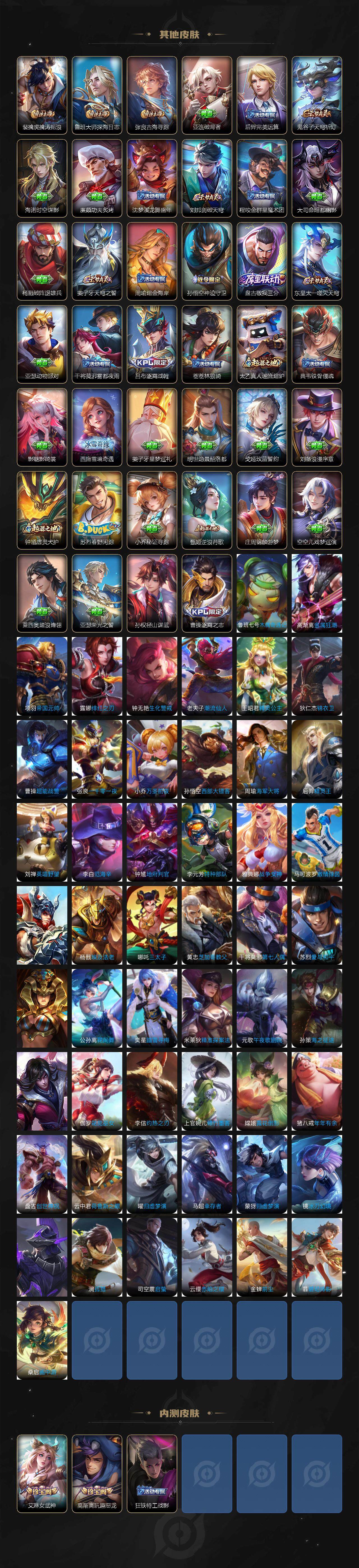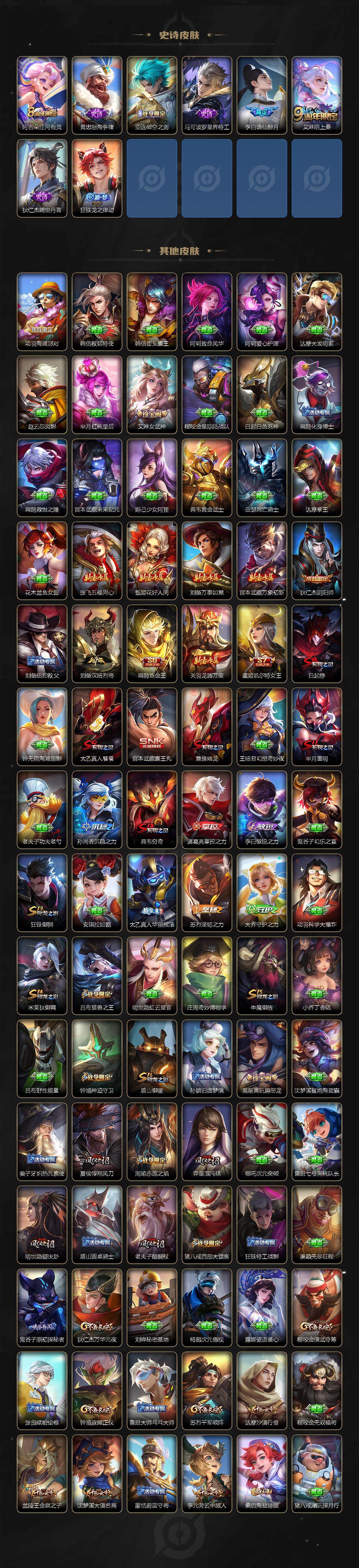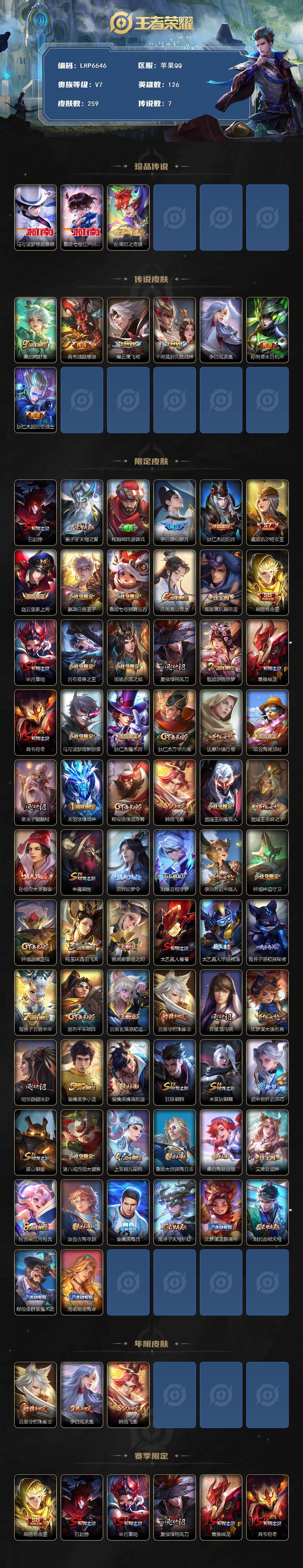 贵族7/皮肤259/传说7/史诗68/英雄126/孙权全皮/空空儿全皮/影全皮/马可波罗怪盗基德/鲁班七号江户川柯南/孙策时之奇旅/桑启鸣野蒿/典韦战鼓燎原/曜云鹰飞将/干将莫邪久胜战神/李白凤求凰/孙尚香末日机甲/狄仁杰超时空战士/白起狰/姜子牙天穹之誓/杨戬破阵退雄兵/李白谪仙醉月/狄仁杰阴阳师/虞姬凯尔特女王/赵云皇家上将/嬴政白昼王子/鲁班七号狮舞东方/庄周高山流水/高渐离玩趣恶龙/扁鹊炼金王/芈月重明/吕布猎兽之王/周瑜赤莲之焰/夏侯惇朔风刀/甄姬游园惊梦/曹操烛龙/典韦穷奇/马可波罗暗影游猎/狄仁杰魔术师/狄仁杰万华元夜/达摩沙漠行僧/项羽海滩派对/老夫子醍醐杖/关羽冰锋战神/程咬金演武夺筹/韩信飞衡/兰陵王驯魔猎人/兰陵王金庭之子/孙悟空大圣娶亲/牛魔御旌/后羿如梦令/刘备百相守梦/李元芳云中旅人/钟馗神迹守卫/钟馗驱傩正仪/杨玉环遇见飞天/雅典娜黎明之约/太乙真人饕餮/太乙真人华丽摇滚/鬼谷子原初探秘者/鬼谷子五谷丰年/苏烈千军破阵/百里玄策原初追逐者/百里守约朱雀志/弈星混沌棋/沈梦溪大漠名商/明世隐疑决卦/裴擒虎李小龙/裴擒虎擒涛扼浪/狂铁御狮/米莱狄御霄/云中君纤云弄巧/盾山御銮/猪八戒西部大镖客/上官婉儿梁祝/鲁班大师探海日志/桑启海盐诗旅/艾琳女武神/阿古朵江河有灵/张良古海寻踪/裴擒虎梅西/鬼谷子天穹祈灯/沈梦溪龙舞盛年/刘邦剑破天穹/程咬金群星魔术团/周瑜熔金海岸/鲁班七号电玩小子/项羽苍穹之光/露娜紫霞仙子/赵云未来纪元/貂蝉圣诞恋歌/甄姬冰雪圆舞曲/廉颇地狱岩魂/宫本武藏鬼剑武藏/孙尚香水果甜心/嬴政暗夜贵公子/妲己魅力维加斯/妲己女仆咖啡/墨子金属风暴/吕布圣诞狂欢/曹操幽灵船长/李白千年之狐/吕布末日机甲/张飞乱世虎臣/韩信白龙吟/花木兰水晶猎龙者/刘邦德古拉伯爵/夏侯惇乘风破浪/小乔缤纷独角兽/兰陵王暗隐猎兽者/诸葛亮黄金分割率/亚瑟心灵战警/百里守约特工魅影/铠曙光守护者/蔡文姬舞动绿茵/刘禅天才门将/程咬金功夫厨神/白起星夜王子/阿轲节奏热浪/孙策猫狗日记/狄仁杰鹰眼统帅/娜可露露晚萤/大乔白蛇/不知火舞魅语/黄忠怒海争锋/亚连破空之剑/马可波罗星界特工/艾琳陌上桑/狄仁杰绮世丹青/狂铁龙之律动/韩信教廷特使/韩信街头霸王/阿轲致命风华/阿轲爱心护理/达摩大发明家/赵云忍炎影/芈月红桃皇后/程咬金星际陆战队/白起白色死神/扁鹊化身博士/扁鹊救世之瞳/宫本武藏未来纪元/妲己少女阿狸/典韦黄金武士/亚瑟死亡骑士/达摩拳王/花木兰兔女郎/张飞五福同心/甄姬花好人间/刘备万事如意/宫本武藏万象初新/刘备纽约教父/刘备汉昭烈帝/关羽龙腾万里/钟无艳海滩丽影/宫本武藏霸王丸/王昭君幻想奇妙夜/老夫子功夫老勺/孙尚香沉稳之力/诸葛亮掌控之力/李白敏锐之力/鬼谷子幻乐之宴/安琪拉如懿/苏烈坚韧之力/大乔守护之力/项羽科学大爆炸/明世隐虹云星官/庄周奇妙博物学/小乔丁香结/吕布野性能量/孙膑归虚梦演/沈梦溪鲨炮海盗猫/姜子牙炽热元素使/哪吒次元突破/鲁班七号黑桃队长/盾山圆桌骑士/狂铁特工战影/廉颇无尽征程/刘禅秘密基地/杨戬次元傲视/露娜瓷语鉴心/张良缤纷绘卷/鲁班大师乓乓大师/程咬金无双福将/蒙恬蔚蓝守将/猪八戒潮玩探月行/亚连破局者/后羿完美运算/海诺时空谍影/廉颇功夫炙烤/大司命暗都幽影/孙悟空神迹守卫/盘古敬我三分/东皇太一噬灭天穹/亚瑟动物派对/干将莫邪雾都夜雨/吕布逐霄战戟/苍苍林狼骑/太乙真人谧流熔炉/典韦铁骨偃魂/影魅影绮裳/西施雪境奇遇/姜子牙星梦巡礼/明世隐景韶洛都/戈娅玫蓝誓约/刘备浪漫序章/钟馗虚灵犬护/苏烈春野闲踪/小乔秘证寻踪/甄姬逆浪荇歌/庄周锦麟游梦/空空儿戏梦巡演/莱西奥踏浪烽翎/亚瑟荣光之誓/孙权径山谋武/曹操逐霄之志/鲁班七号木偶奇遇记/高渐离金属狂潮/项羽帝国元帅/露娜绯红之刃/钟无艳生化警戒/老夫子潮流仙人/王昭君精灵公主/狄仁杰锦衣卫/曹操超能战警/张良一千零一夜/小乔万圣前夜/孙悟空西部大镖客/周瑜海军大将/后羿精灵王/刘禅英喵野望/李白范海辛/钟馗地府判官/李元芳特种部队/雅典娜战争女神/马可波罗激情绿茵/苍维京掠夺者/杨戬埃及法老/哪吒三太子/黄忠芝加哥教父/干将莫邪第七人偶/苏烈爱与和平/女娲尼罗河女神/公孙离花间舞/弈星踏雪寻梅/米莱狄精准探案法/元歌午夜歌剧院/孙策海之征途/司马懿魇语军师/伽罗花见巫女/李信灼热之刃/上官婉儿修竹墨客/嫦娥露花倒影/猪八戒年年有余/盘古创世神祝/云中君荷鲁斯之眼/曜归虚梦演/马超幸存者/蒙犽归虚梦演/镜冰刃幻境/蒙恬秩序猎龙将/澜孤猎/司空震启蛰/云缨赤焰之缨/金蝉前尘/暃碧珀绯影/桑启画中游