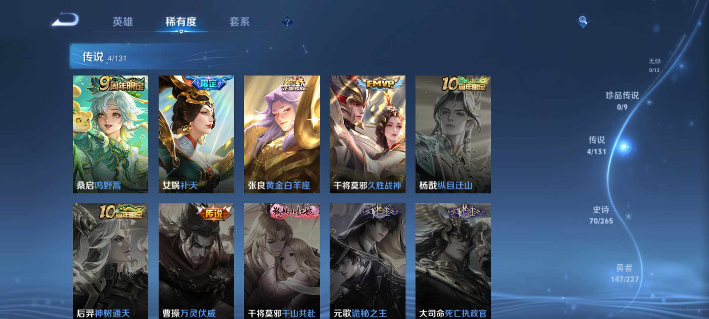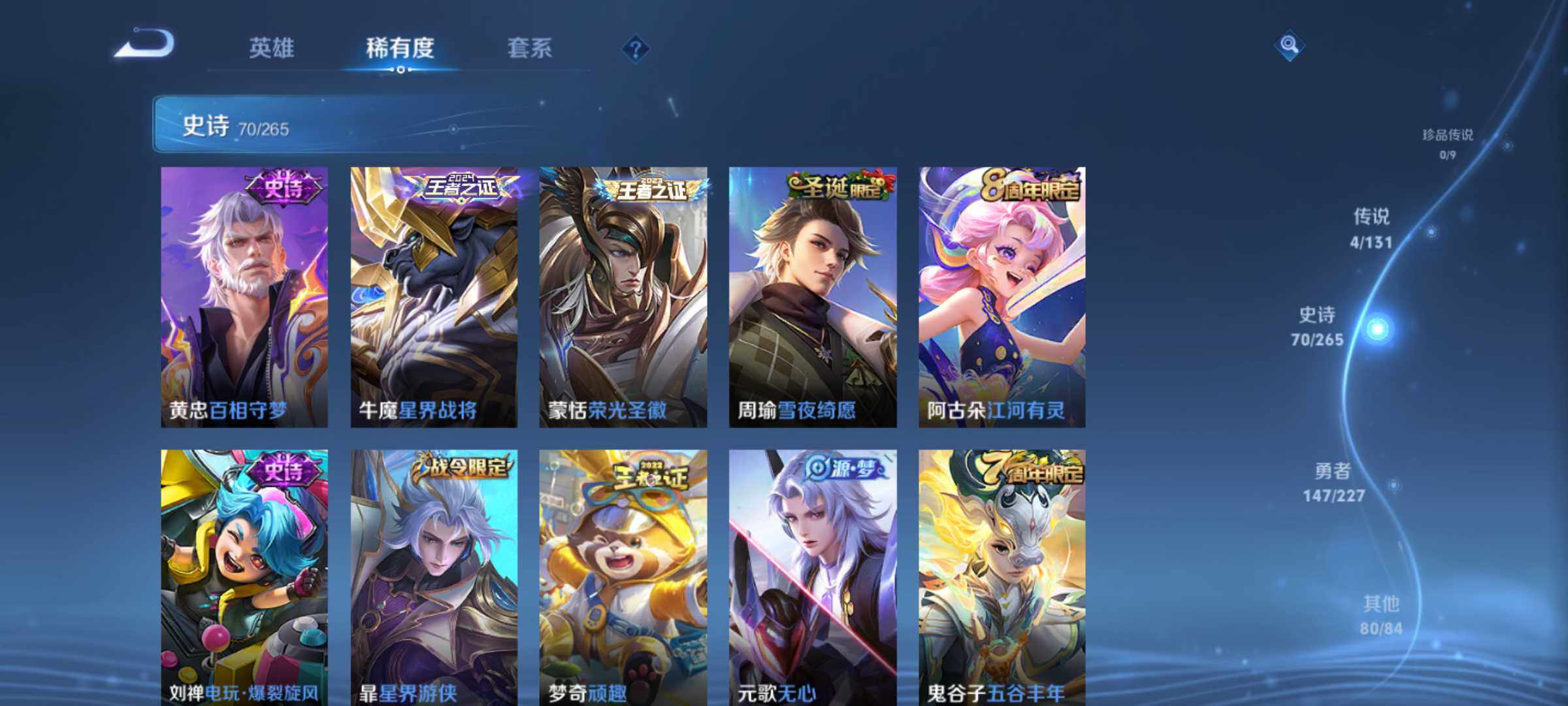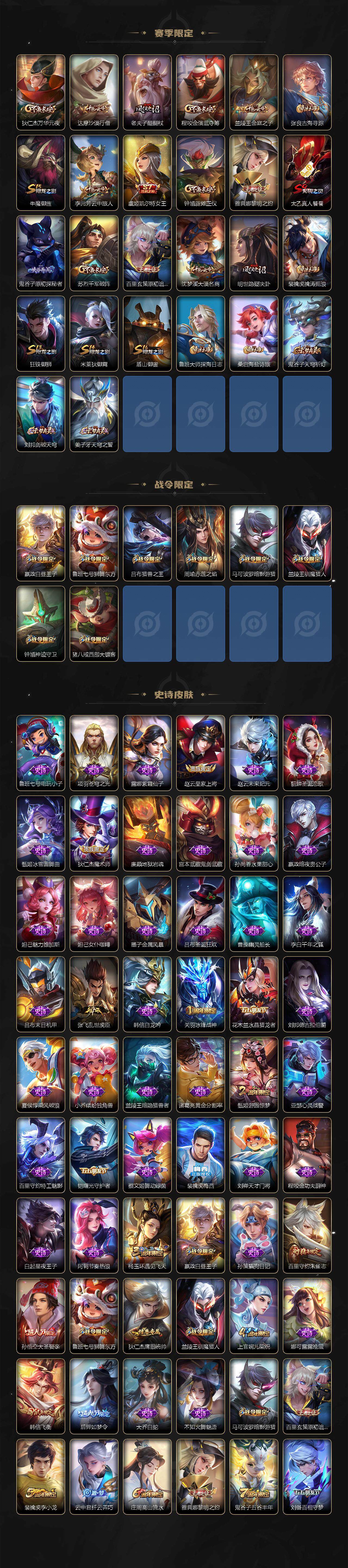 贵族7/皮肤259/传说7/史诗68/英雄126/孙权全皮/空空儿全皮/影全皮/马可波罗怪盗基德/鲁班七号江户川柯南/孙策时之奇旅/桑启鸣野蒿/典韦战鼓燎原/曜云鹰飞将/干将莫邪久胜战神/李白凤求凰/孙尚香末日机甲/狄仁杰超时空战士/白起狰/姜子牙天穹之誓/杨戬破阵退雄兵/李白谪仙醉月/狄仁杰阴阳师/虞姬凯尔特女王/赵云皇家上将/嬴政白昼王子/鲁班七号狮舞东方/庄周高山流水/高渐离玩趣恶龙/扁鹊炼金王/芈月重明/吕布猎兽之王/周瑜赤莲之焰/夏侯惇朔风刀/甄姬游园惊梦/曹操烛龙/典韦穷奇/马可波罗暗影游猎/狄仁杰魔术师/狄仁杰万华元夜/达摩沙漠行僧/项羽海滩派对/老夫子醍醐杖/关羽冰锋战神/程咬金演武夺筹/韩信飞衡/兰陵王驯魔猎人/兰陵王金庭之子/孙悟空大圣娶亲/牛魔御旌/后羿如梦令/刘备百相守梦/李元芳云中旅人/钟馗神迹守卫/钟馗驱傩正仪/杨玉环遇见飞天/雅典娜黎明之约/太乙真人饕餮/太乙真人华丽摇滚/鬼谷子原初探秘者/鬼谷子五谷丰年/苏烈千军破阵/百里玄策原初追逐者/百里守约朱雀志/弈星混沌棋/沈梦溪大漠名商/明世隐疑决卦/裴擒虎李小龙/裴擒虎擒涛扼浪/狂铁御狮/米莱狄御霄/云中君纤云弄巧/盾山御銮/猪八戒西部大镖客/上官婉儿梁祝/鲁班大师探海日志/桑启海盐诗旅/艾琳女武神/阿古朵江河有灵/张良古海寻踪/裴擒虎梅西/鬼谷子天穹祈灯/沈梦溪龙舞盛年/刘邦剑破天穹/程咬金群星魔术团/周瑜熔金海岸/鲁班七号电玩小子/项羽苍穹之光/露娜紫霞仙子/赵云未来纪元/貂蝉圣诞恋歌/甄姬冰雪圆舞曲/廉颇地狱岩魂/宫本武藏鬼剑武藏/孙尚香水果甜心/嬴政暗夜贵公子/妲己魅力维加斯/妲己女仆咖啡/墨子金属风暴/吕布圣诞狂欢/曹操幽灵船长/李白千年之狐/吕布末日机甲/张飞乱世虎臣/韩信白龙吟/花木兰水晶猎龙者/刘邦德古拉伯爵/夏侯惇乘风破浪/小乔缤纷独角兽/兰陵王暗隐猎兽者/诸葛亮黄金分割率/亚瑟心灵战警/百里守约特工魅影/铠曙光守护者/蔡文姬舞动绿茵/刘禅天才门将/程咬金功夫厨神/白起星夜王子/阿轲节奏热浪/孙策猫狗日记/狄仁杰鹰眼统帅/娜可露露晚萤/大乔白蛇/不知火舞魅语/黄忠怒海争锋/亚连破空之剑/马可波罗星界特工/艾琳陌上桑/狄仁杰绮世丹青/狂铁龙之律动/韩信教廷特使/韩信街头霸王/阿轲致命风华/阿轲爱心护理/达摩大发明家/赵云忍炎影/芈月红桃皇后/程咬金星际陆战队/白起白色死神/扁鹊化身博士/扁鹊救世之瞳/宫本武藏未来纪元/妲己少女阿狸/典韦黄金武士/亚瑟死亡骑士/达摩拳王/花木兰兔女郎/张飞五福同心/甄姬花好人间/刘备万事如意/宫本武藏万象初新/刘备纽约教父/刘备汉昭烈帝/关羽龙腾万里/钟无艳海滩丽影/宫本武藏霸王丸/王昭君幻想奇妙夜/老夫子功夫老勺/孙尚香沉稳之力/诸葛亮掌控之力/李白敏锐之力/鬼谷子幻乐之宴/安琪拉如懿/苏烈坚韧之力/大乔守护之力/项羽科学大爆炸/明世隐虹云星官/庄周奇妙博物学/小乔丁香结/吕布野性能量/孙膑归虚梦演/沈梦溪鲨炮海盗猫/姜子牙炽热元素使/哪吒次元突破/鲁班七号黑桃队长/盾山圆桌骑士/狂铁特工战影/廉颇无尽征程/刘禅秘密基地/杨戬次元傲视/露娜瓷语鉴心/张良缤纷绘卷/鲁班大师乓乓大师/程咬金无双福将/蒙恬蔚蓝守将/猪八戒潮玩探月行/亚连破局者/后羿完美运算/海诺时空谍影/廉颇功夫炙烤/大司命暗都幽影/孙悟空神迹守卫/盘古敬我三分/东皇太一噬灭天穹/亚瑟动物派对/干将莫邪雾都夜雨/吕布逐霄战戟/苍苍林狼骑/太乙真人谧流熔炉/典韦铁骨偃魂/影魅影绮裳/西施雪境奇遇/姜子牙星梦巡礼/明世隐景韶洛都/戈娅玫蓝誓约/刘备浪漫序章/钟馗虚灵犬护/苏烈春野闲踪/小乔秘证寻踪/甄姬逆浪荇歌/庄周锦麟游梦/空空儿戏梦巡演/莱西奥踏浪烽翎/亚瑟荣光之誓/孙权径山谋武/曹操逐霄之志/鲁班七号木偶奇遇记/高渐离金属狂潮/项羽帝国元帅/露娜绯红之刃/钟无艳生化警戒/老夫子潮流仙人/王昭君精灵公主/狄仁杰锦衣卫/曹操超能战警/张良一千零一夜/小乔万圣前夜/孙悟空西部大镖客/周瑜海军大将/后羿精灵王/刘禅英喵野望/李白范海辛/钟馗地府判官/李元芳特种部队/雅典娜战争女神/马可波罗激情绿茵/苍维京掠夺者/杨戬埃及法老/哪吒三太子/黄忠芝加哥教父/干将莫邪第七人偶/苏烈爱与和平/女娲尼罗河女神/公孙离花间舞/弈星踏雪寻梅/米莱狄精准探案法/元歌午夜歌剧院/孙策海之征途/司马懿魇语军师/伽罗花见巫女/李信灼热之刃/上官婉儿修竹墨客/嫦娥露花倒影/猪八戒年年有余/盘古创世神祝/云中君荷鲁斯之眼/曜归虚梦演/马超幸存者/蒙犽归虚梦演/镜冰刃幻境/蒙恬秩序猎龙将/澜孤猎/司空震启蛰/云缨赤焰之缨/金蝉前尘/暃碧珀绯影/桑启画中游