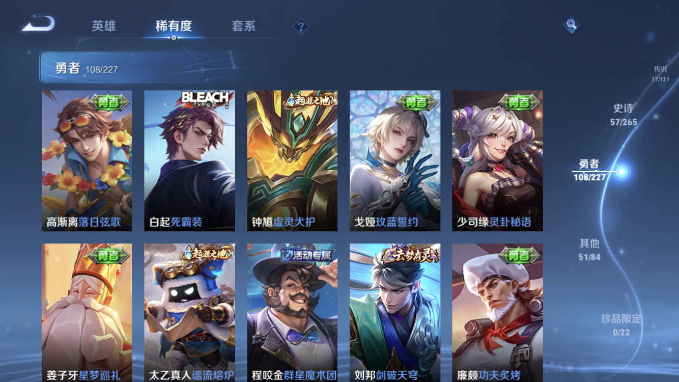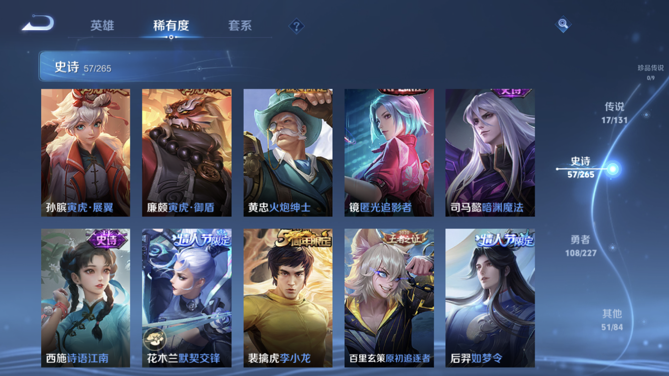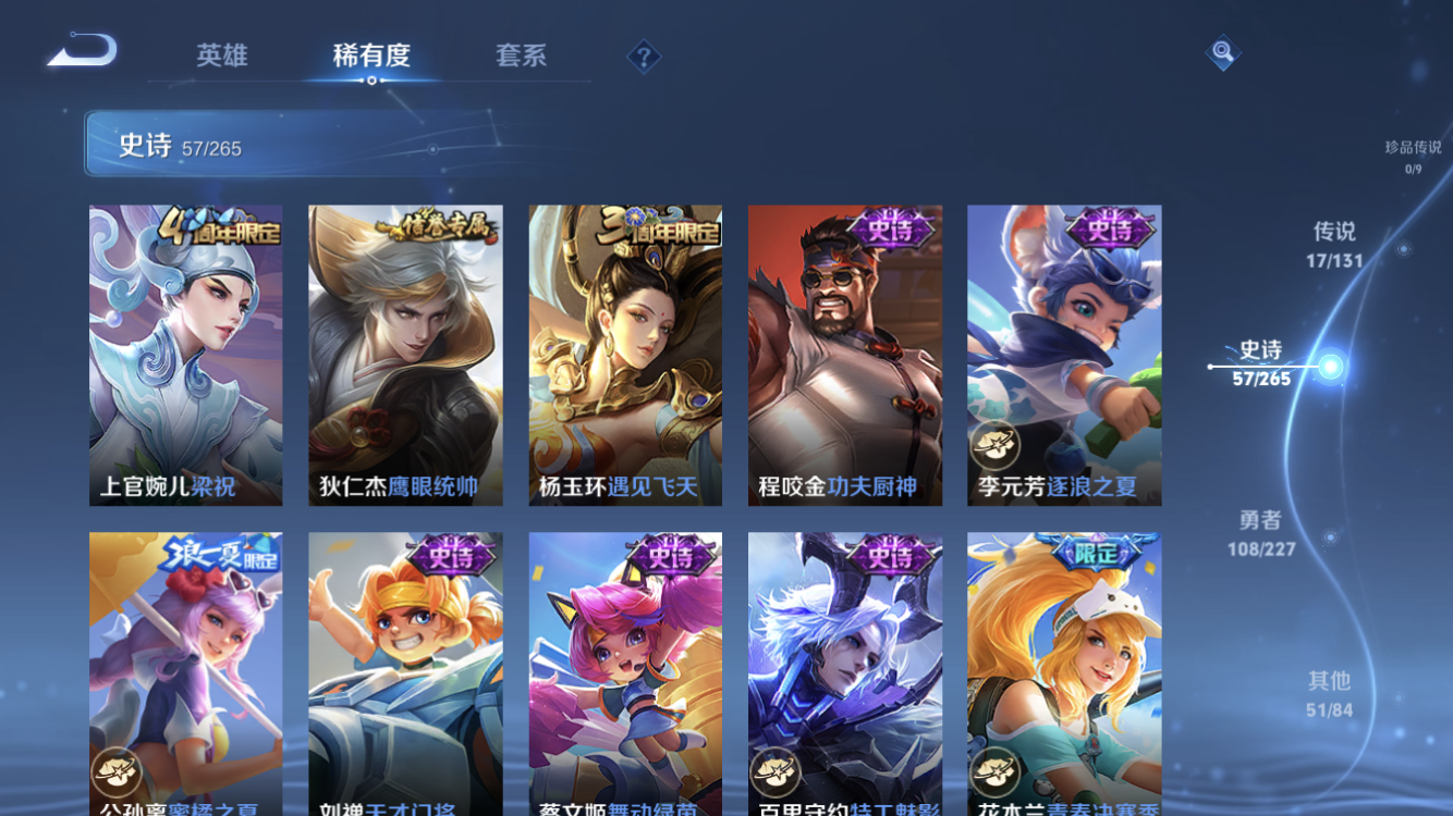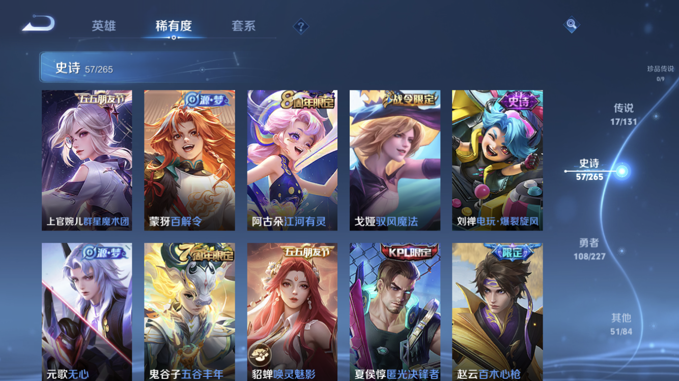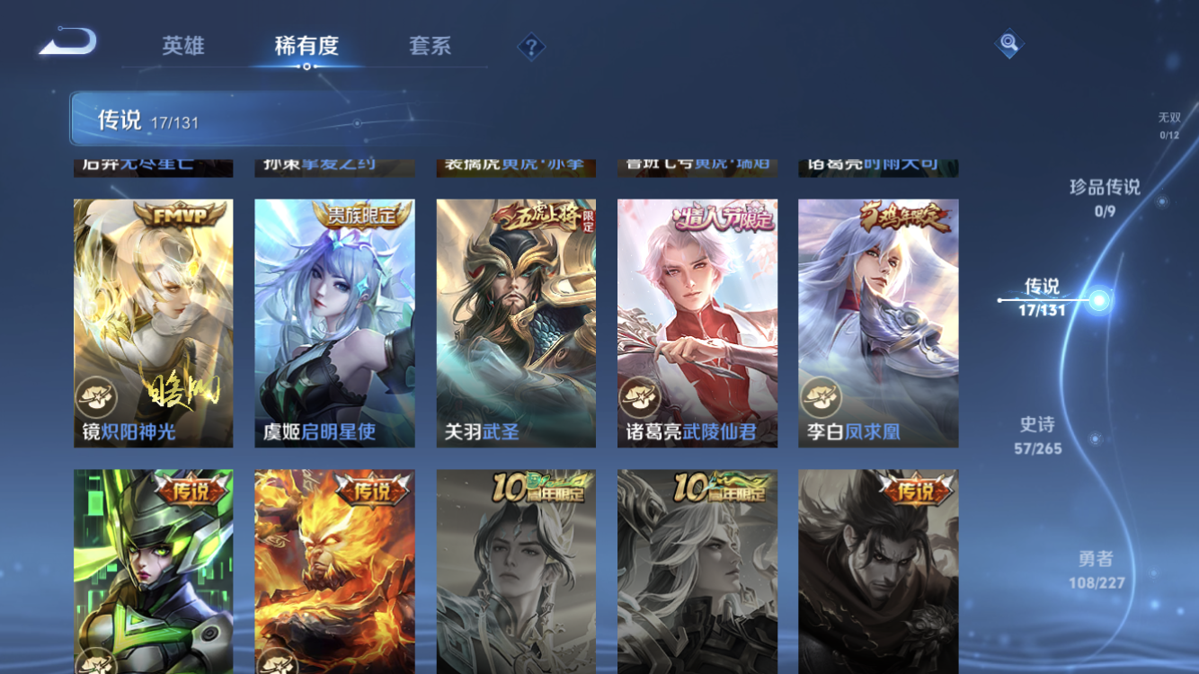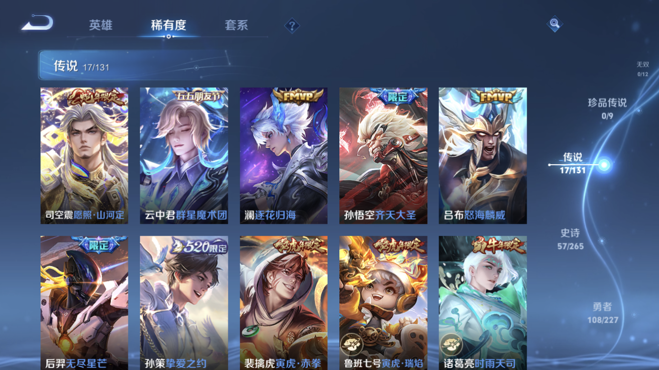 v8【17传说 凤求凰 至尊宝 时雨天司 武圣】苹果qq/至尊星耀/233皮肤/123英雄/17传说/57史诗/7稀有英雄【17 传说皮肤】武圣 关羽启明星使 虞姬逐花归海 澜地狱火 孙悟空齐天大圣 孙悟空凤求凰 李白武陵仙君 诸葛亮时雨天司 诸葛亮炽阳神光 镜无尽星芒 后羿寅虎·瑞焰 鲁班七号怒海麟威 吕布挚爱之约 孙策末日机甲 孙尚香寅虎·赤拳 裴擒虎群星魔术团