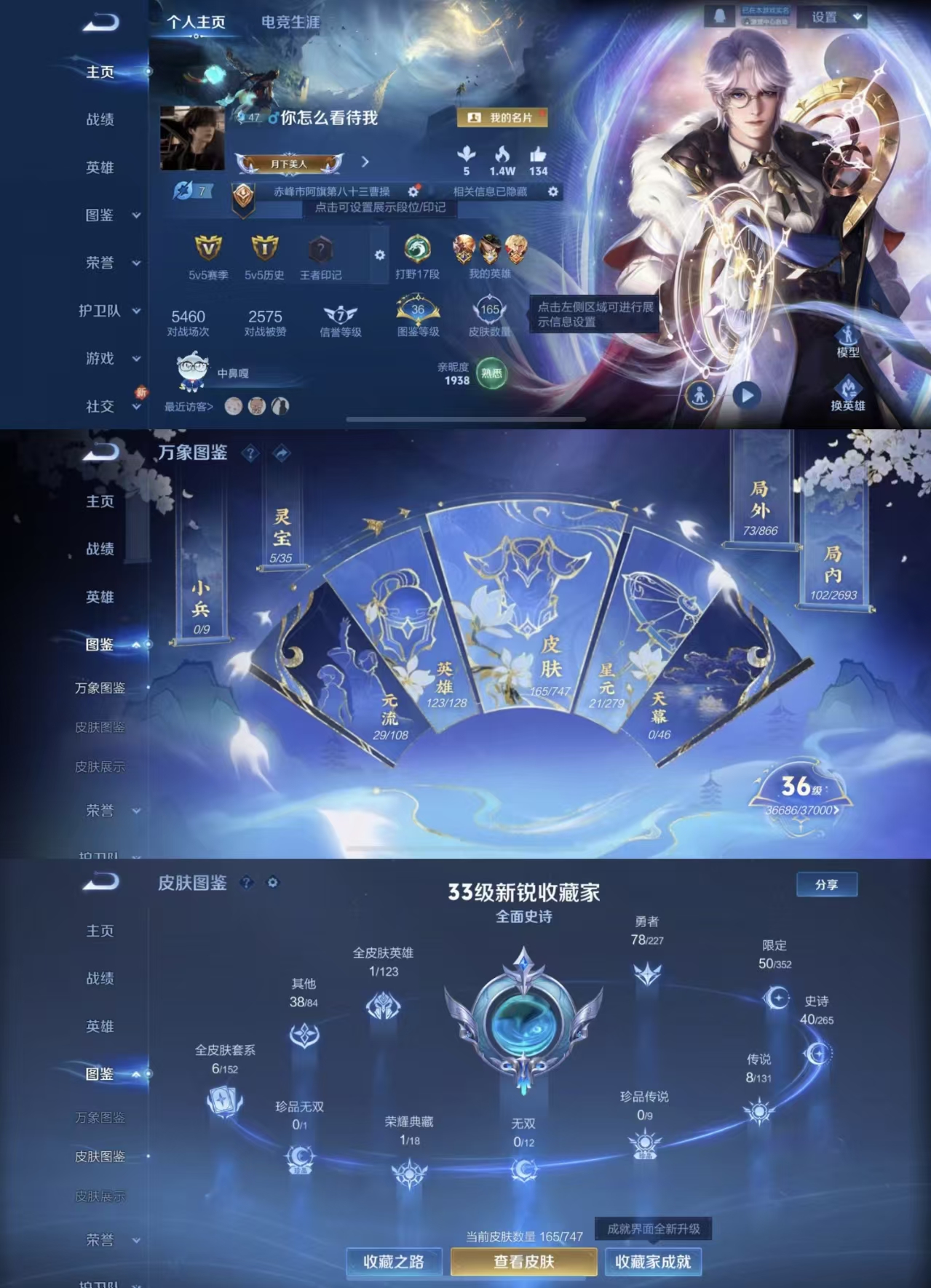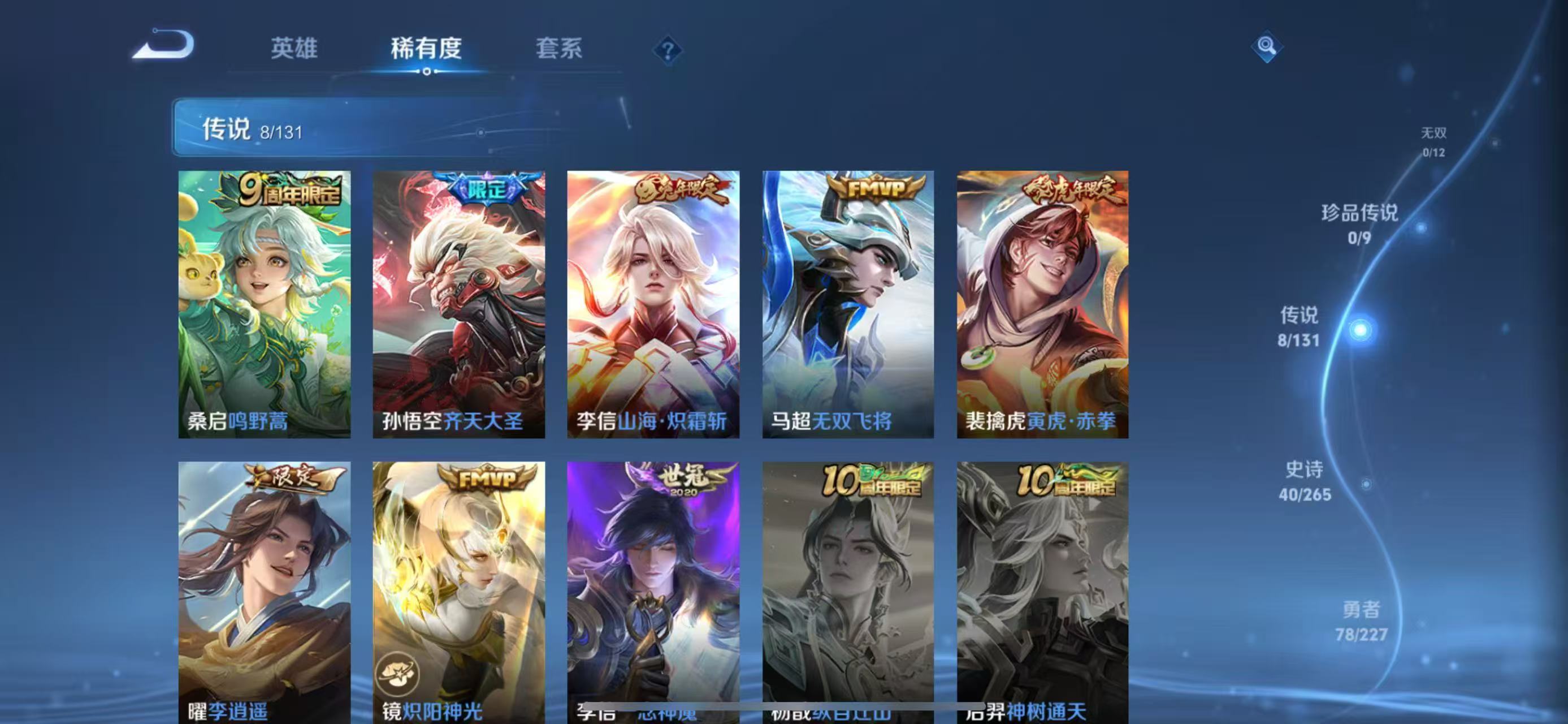 _2302783-实名:可修改贵族等级:v7英雄数:123皮肤数:165荣耀水晶:星域神启传说皮:炽阳神光一念神魔李无双飞将山海·炽霜斩限定皮:遇见飞天李小龙游园惊梦御风骁将如梦令-后羿傲雪梅呛寅虎·赤拳山海·玄木吟齐天大圣鸣野蒿