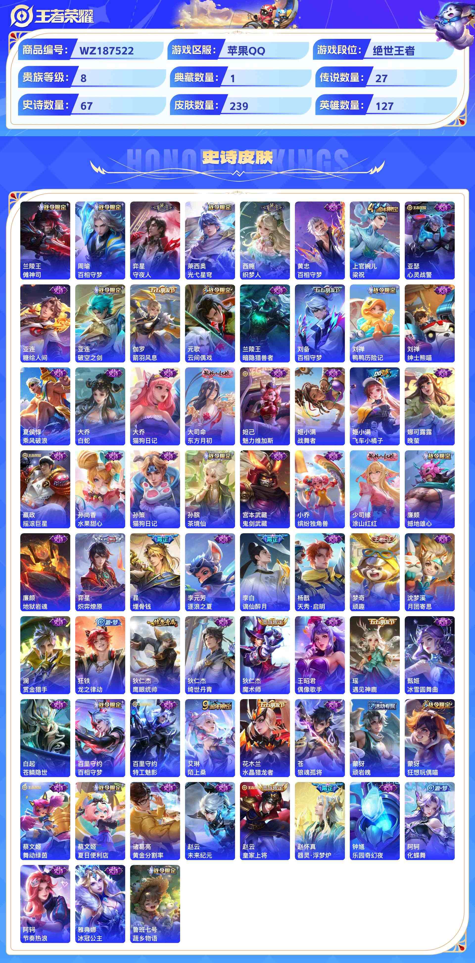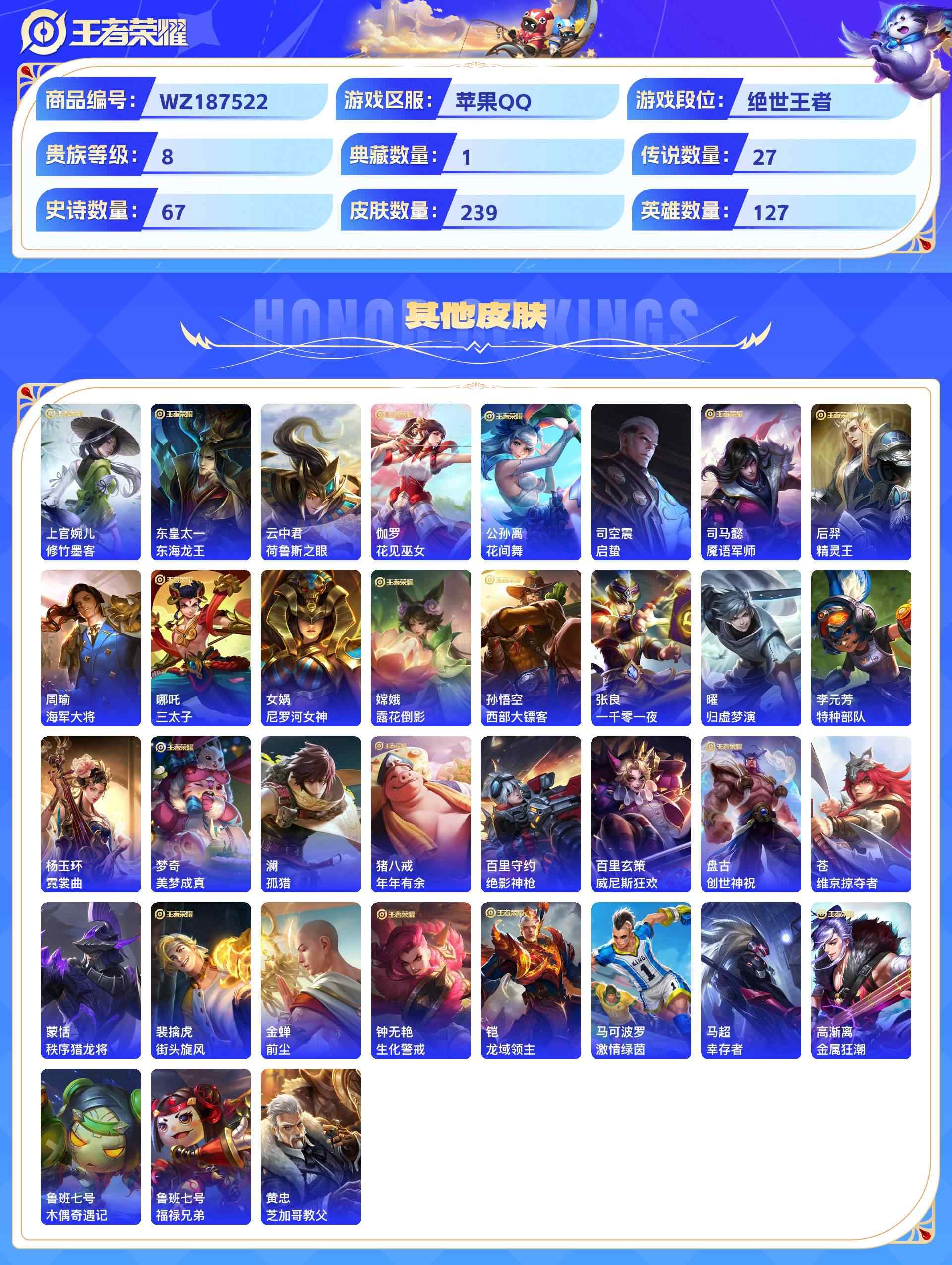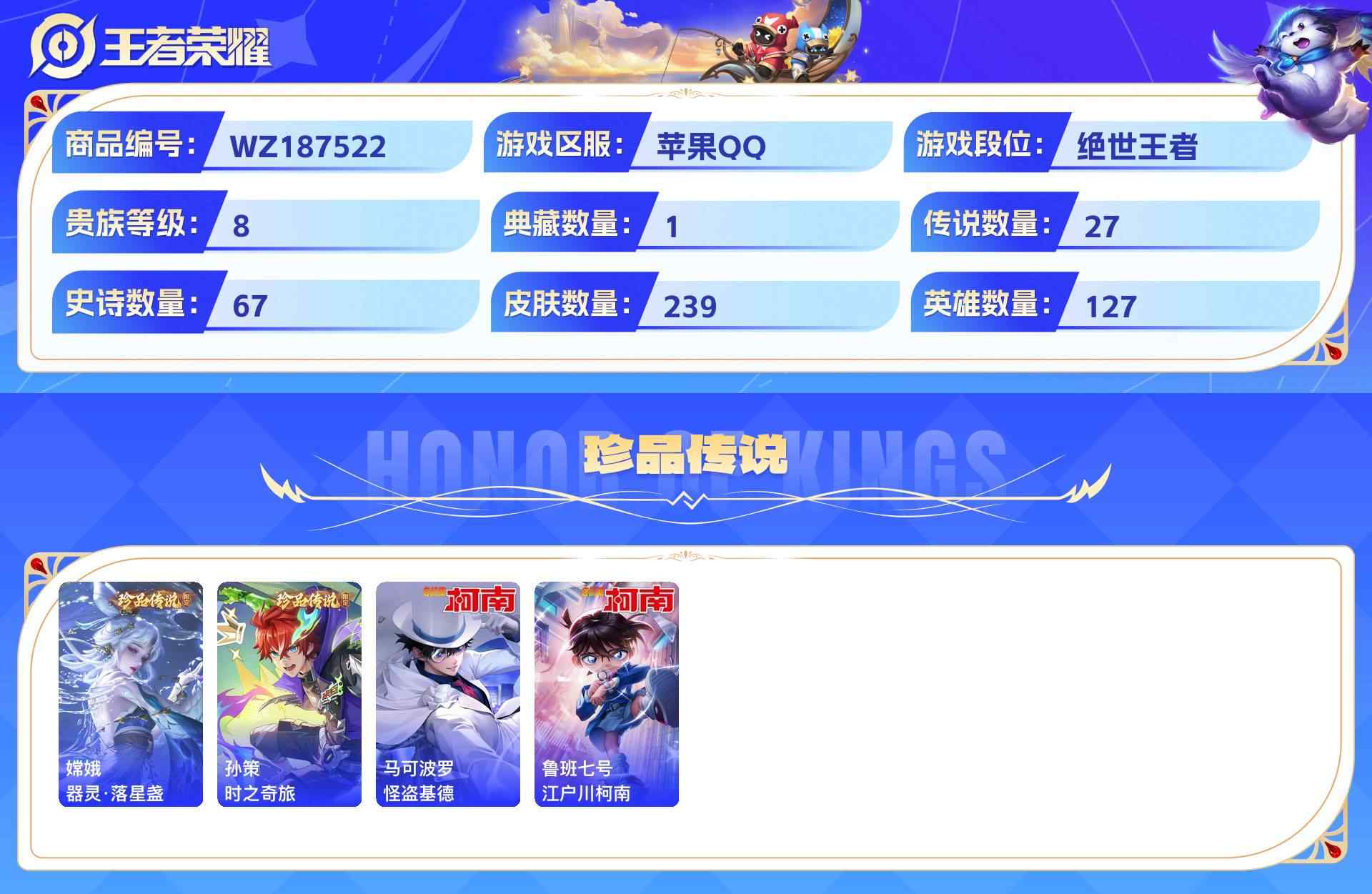 wz187522|精品金标号可二次2金标(梦奇 云中君)【荣耀典藏】活力突击【珍品传说】器灵·落星盏时之奇旅怪盗基德江户川柯南【传说皮肤】九山相柳死亡执政官千山共赴群星魔术团幻光神呛愿照·山河定怒海麟威苹果qq 贵族8级 239皮 1典藏 4珍品传说 27传说 67史诗1星传说48个性按键