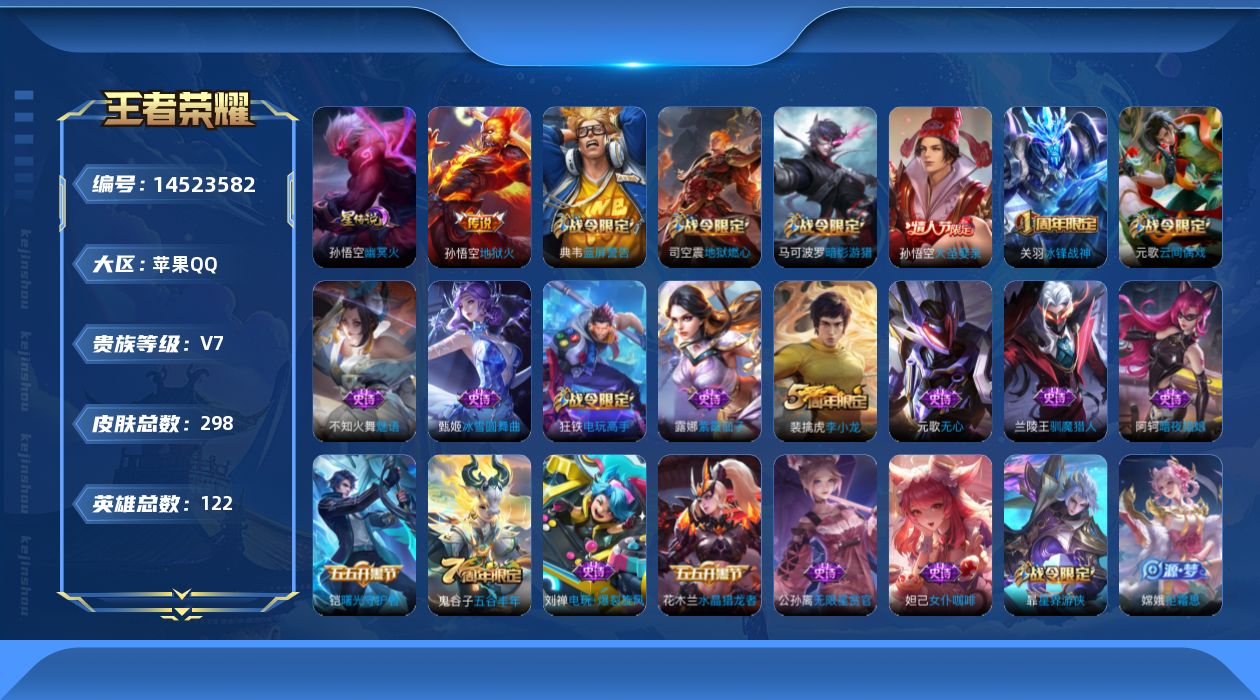 [14523582]qq等级皇冠无违规账号,苹果q-298皮肤-1传说-81史诗 【英雄全皮】:蒙恬全皮 【传说皮肤】:孙悟空地狱火 【限定皮肤】:白起狰,姜子牙天穹之誓,狄仁杰阴阳师,虞姬凯尔特女王,赵云皇家上将,墨子神迹守卫,孙尚香蔷薇恋人,鲁班七号狮舞东方,庄周蜃楼王,庄周高山流水,高渐离死亡摇滚,钟无艳王者之锤,钟无艳超时空战士,孙膑妖精王,扁鹊炼金王,扁鹊奇幻香踪,白起夜都怪侠,芈月重明,芈月幻夜卜梦,周瑜赤莲之焰,元歌云间偶戏,元歌无心,夏侯惇朔风刀,甄姬游园惊梦,甄姬落雪兰心,曹操烛龙,典韦穷奇,典韦蓝屏警告,马可波罗暗影游猎,狄仁杰魔术师,狄仁杰万华元夜,达摩沙漠行僧,项羽海滩派对,老夫子醍醐杖,老夫子航海奇遇记,关羽冰锋战神,程咬金演武夺筹,王昭君午后时光,兰陵王驯魔猎人,兰陵王金庭之子,亚瑟狮心王,亚瑟潮玩骑士王,孙悟空大圣娶亲,牛魔御旌,后羿圣弓游侠,李元芳云中旅人,钟馗神迹守卫,钟馗驱傩正仪,杨戬潮玩骑兵,女娲朔望之晖,干将莫邪真爱魔法,雅典娜单词大作战,雅典娜黎明之约,蔡文姬繁星吟游,太乙真人饕餮,鬼谷子原初探秘者,鬼谷子五谷丰年,黄忠火炮绅士,苏烈千军破阵,百里玄策原初追逐者,弈星混沌棋,梦奇顽趣,沈梦溪大漠名商,明世隐疑决卦,明世隐吟游魔法,裴擒虎李小龙,裴擒虎擒涛扼浪,狂铁御狮,狂铁电玩高手,米莱狄御霄,云中君纤云弄巧,盾山御銮,猪八戒西部大镖客,上官婉儿梁祝,嫦娥拒霜思,嫦娥暖冬兔眠,西施玲珑珍味,蒙犽狂想玩偶喵,鲁班大师探海日志,桑启海盐诗旅,暃星界游侠,戈娅驭风魔法,艾琳女武神,艾琳流音漫舞,司空震地狱燃心,阿古朵江河有灵,张良古海寻踪,蒙犽百解令,蒙恬荣光圣徽,妲己灵卜魔法,鬼谷子天穹祈灯,周瑜熔金海岸 【赛季限定】:庄周蜃楼王,孙膑妖精王,扁鹊炼金王,白起狰,芈月重明,夏侯惇朔风刀,曹操烛龙,典韦穷奇,狄仁杰万华元夜,达摩沙漠行僧,老夫子醍醐杖,程咬金演武夺筹,兰陵王金庭之子,张良古海寻踪,亚瑟狮心王,牛魔御旌,李元芳云中旅人,虞姬凯尔特女王,钟馗驱傩正仪,雅典娜黎明之约,太乙真人饕餮,鬼谷子原初探秘者,苏烈千军破阵,百里玄策原初追逐者,弈星混沌棋,梦奇顽趣,沈梦溪大漠名商,明世隐疑决卦,裴擒虎擒涛扼浪,狂铁御狮,米莱狄御霄,盾山御銮,鲁班大师探海日志,桑启海盐诗旅,鬼谷子天穹祈灯,蒙恬荣光圣徽,姜子牙天穹之誓 【战令限定】:墨子神迹守卫,鲁