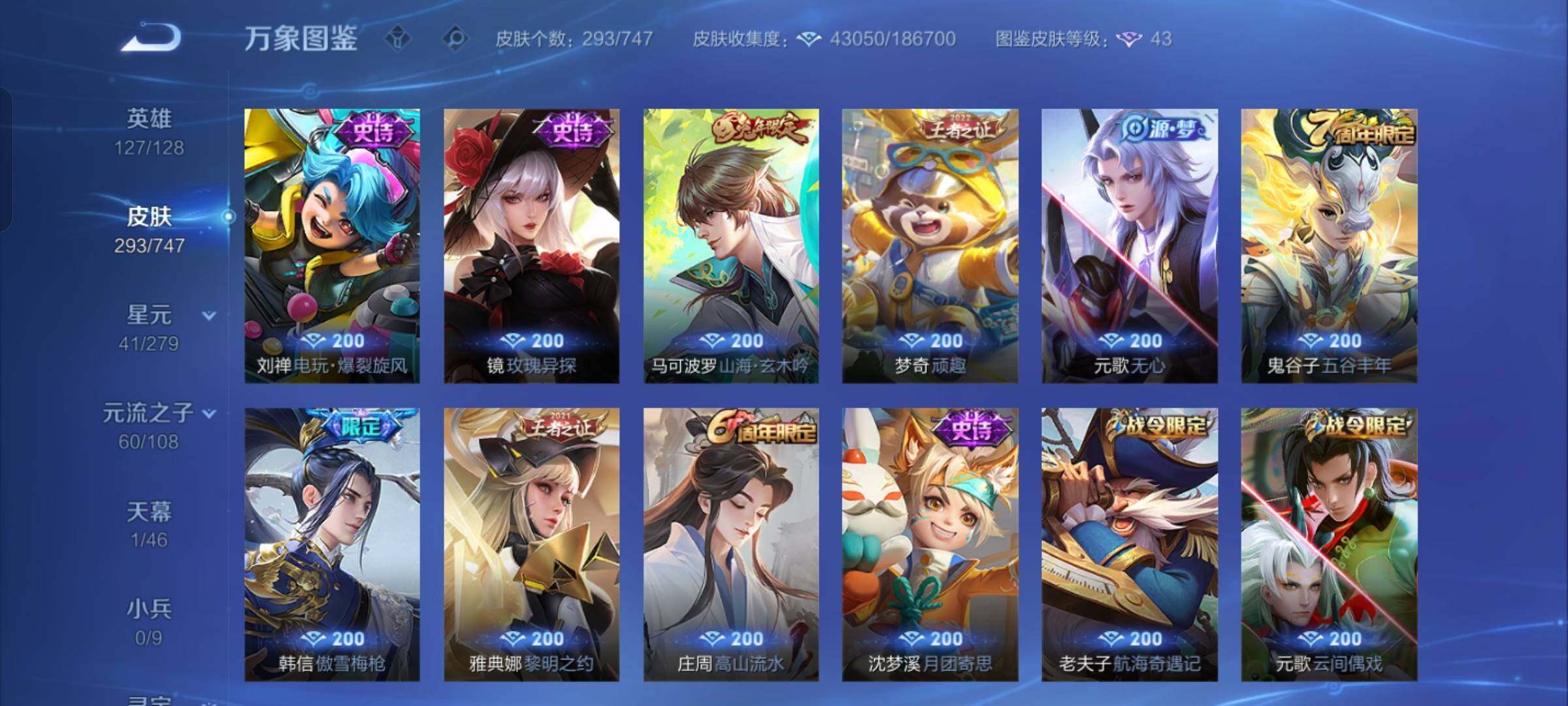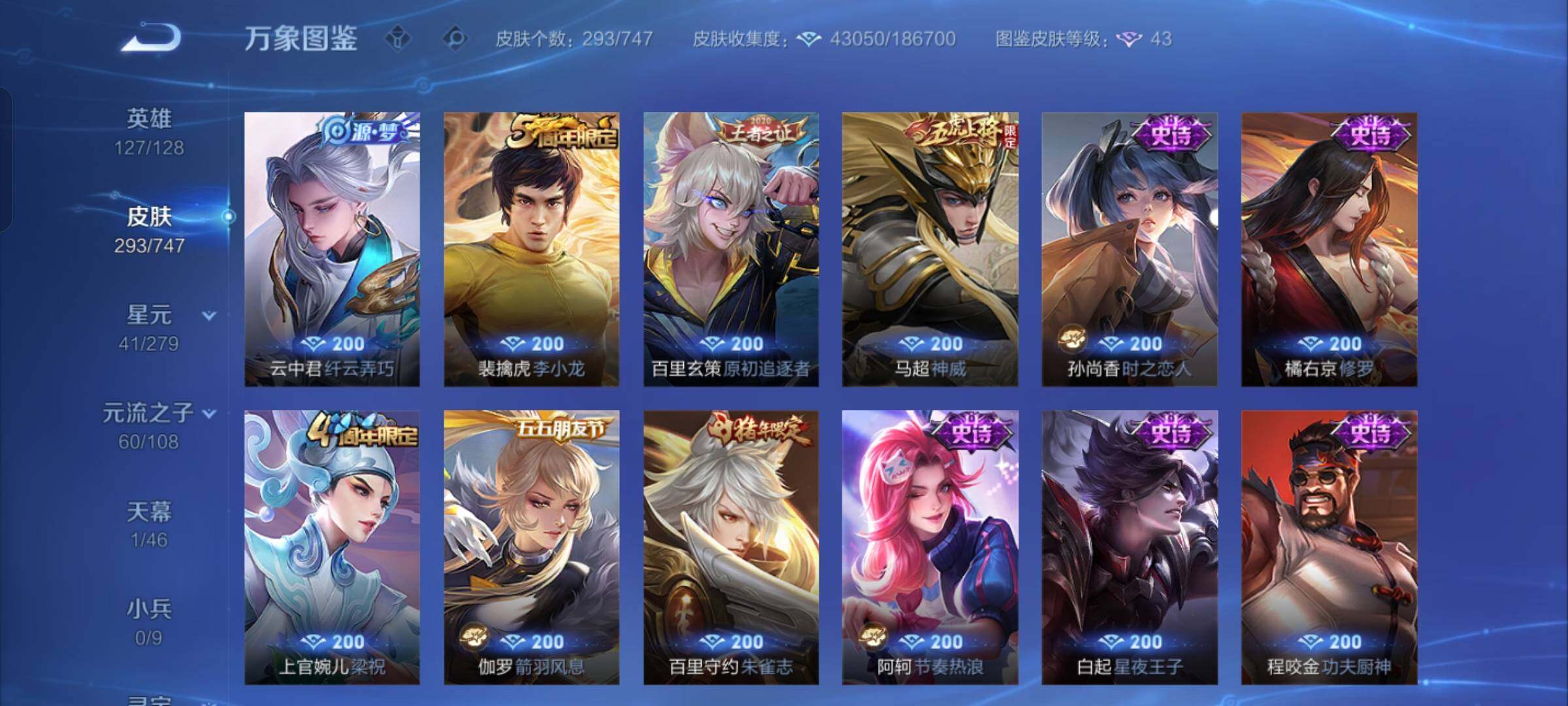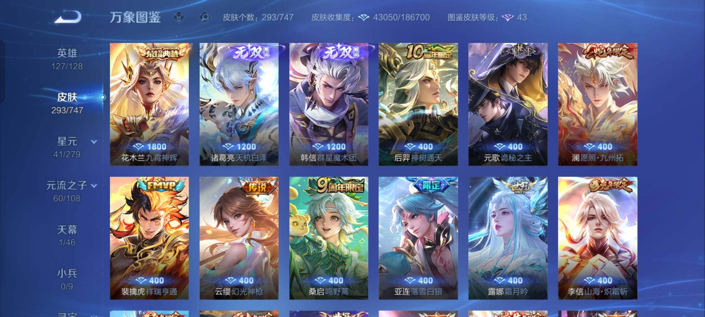 【店长推荐·韩信群星魔术团·天机白泽·九霄神辉·诡秘之主·愿照九州拓·祥瑞亨通·落雪白狼·霜月吟·山海苍雷引·山海炽霜斩·寅虎赤拳·祈雪灵祝·永曜之星·神威·山海玄木吟·可二次】w7869-安卓q-127英雄-293皮肤-16王者印记-300铭文-贵族积分5w【贵族8】【1典藏·2无双·1星传说·22传说·1天幕·12按键·247幸运值】【因赛季更新游戏段付以上号为准!】 【英雄全皮】:元