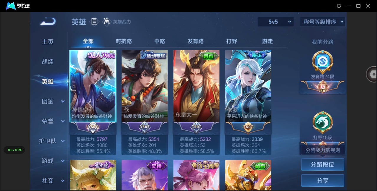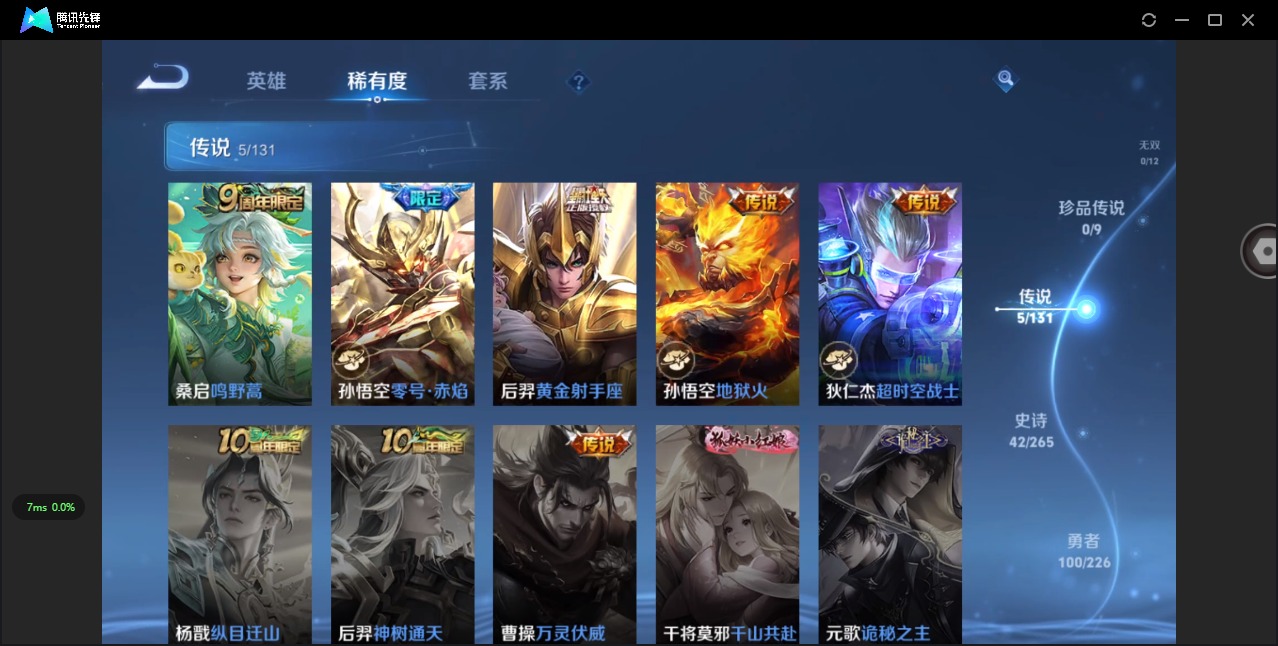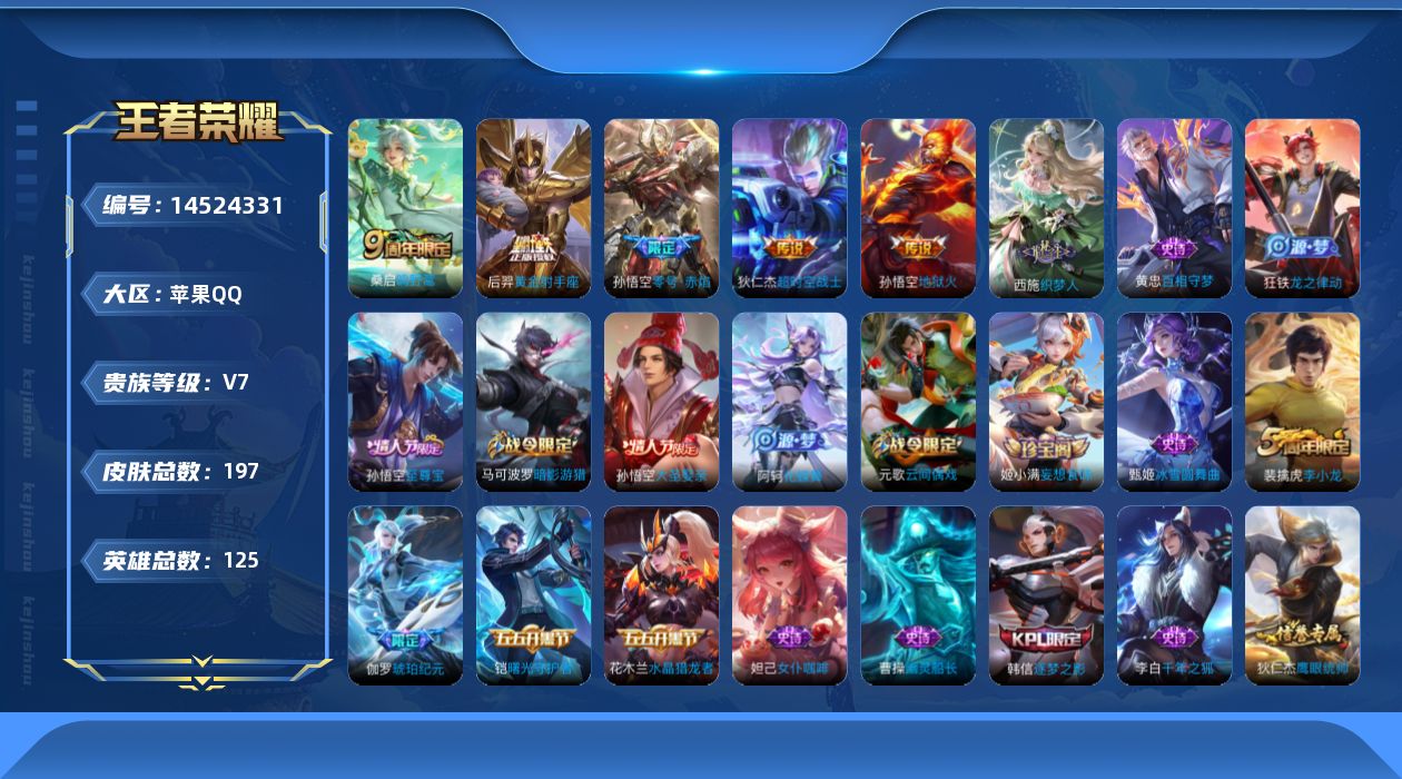 v7 5传说 125英雄 197皮肤 可修改实名 【稀有英雄】:大司命韩信韩跳跳夏洛特夏师傅艾琳橘右京橘子娜可露露鸟人不知火舞赵云金蝉唐僧戈娅 【传说皮】:黄金射手座零号·赤焰地狱火超时空战士-狄仁杰 【珍宝阁皮】:妄想食味蔷薇恋人 【赛季/战令皮】: