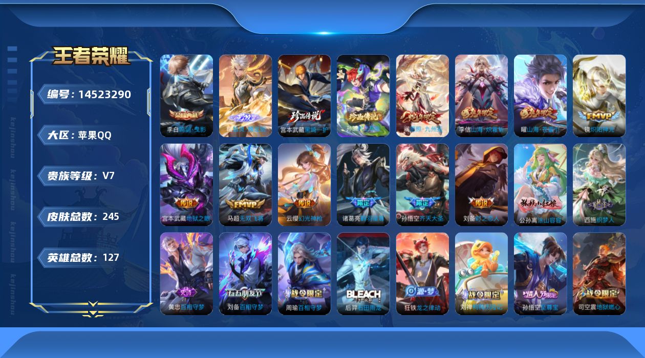 v7 1典藏 1无双 2珍品传说 10传说 127英雄 245皮肤 可修改实名 【英雄全皮】:敖隐全皮鬼谷子全皮赵怀真全皮 【稀有英雄】:敖隐小龙人大司命嬴政始皇帝韩信韩跳跳夏洛特夏师傅艾琳橘右京橘子娜可露露鸟人不知火舞赵云金蝉唐僧戈娅 【荣耀