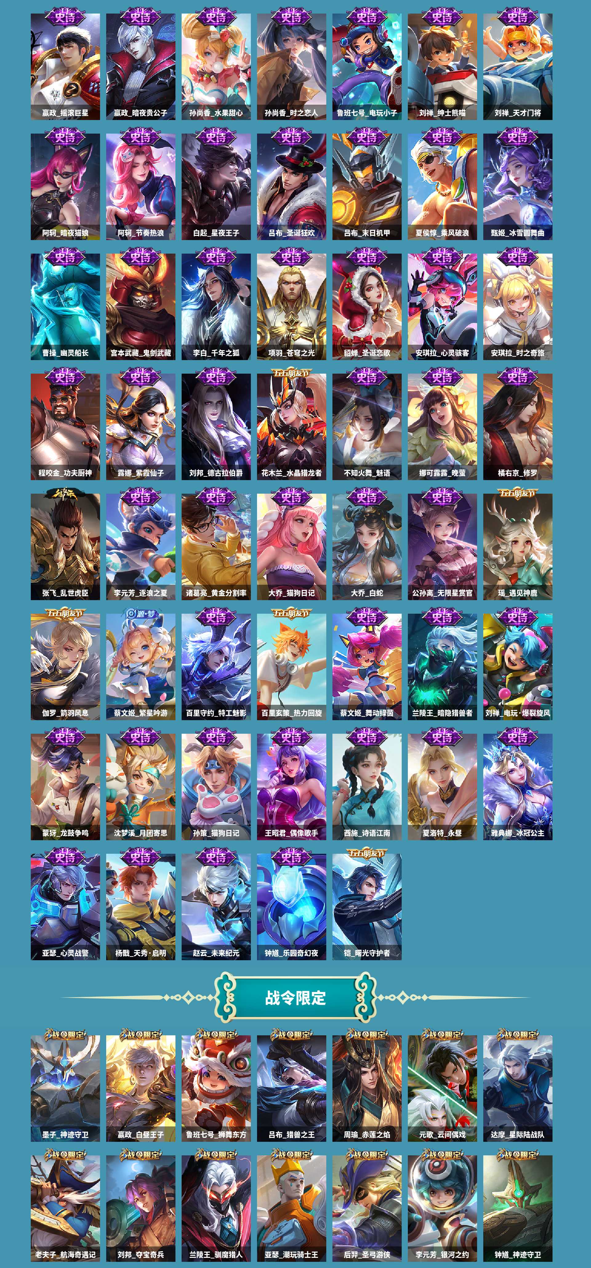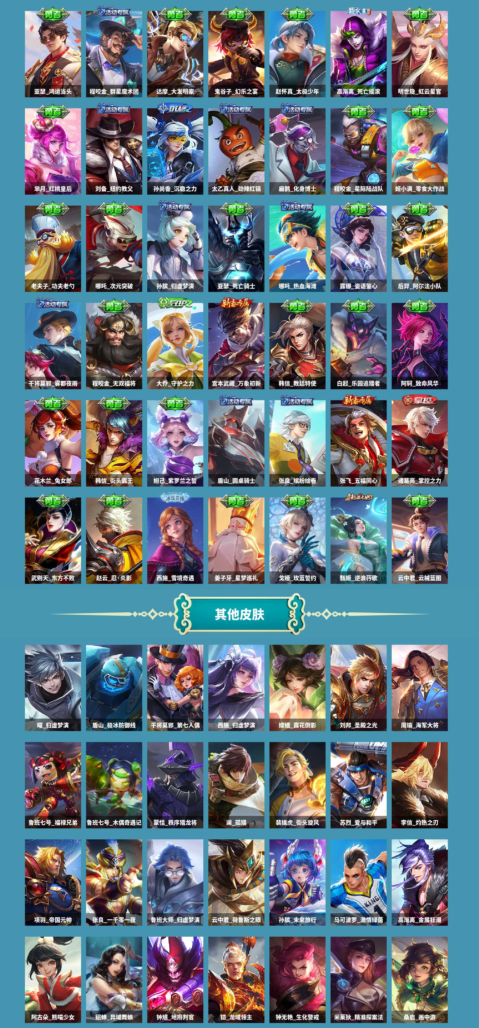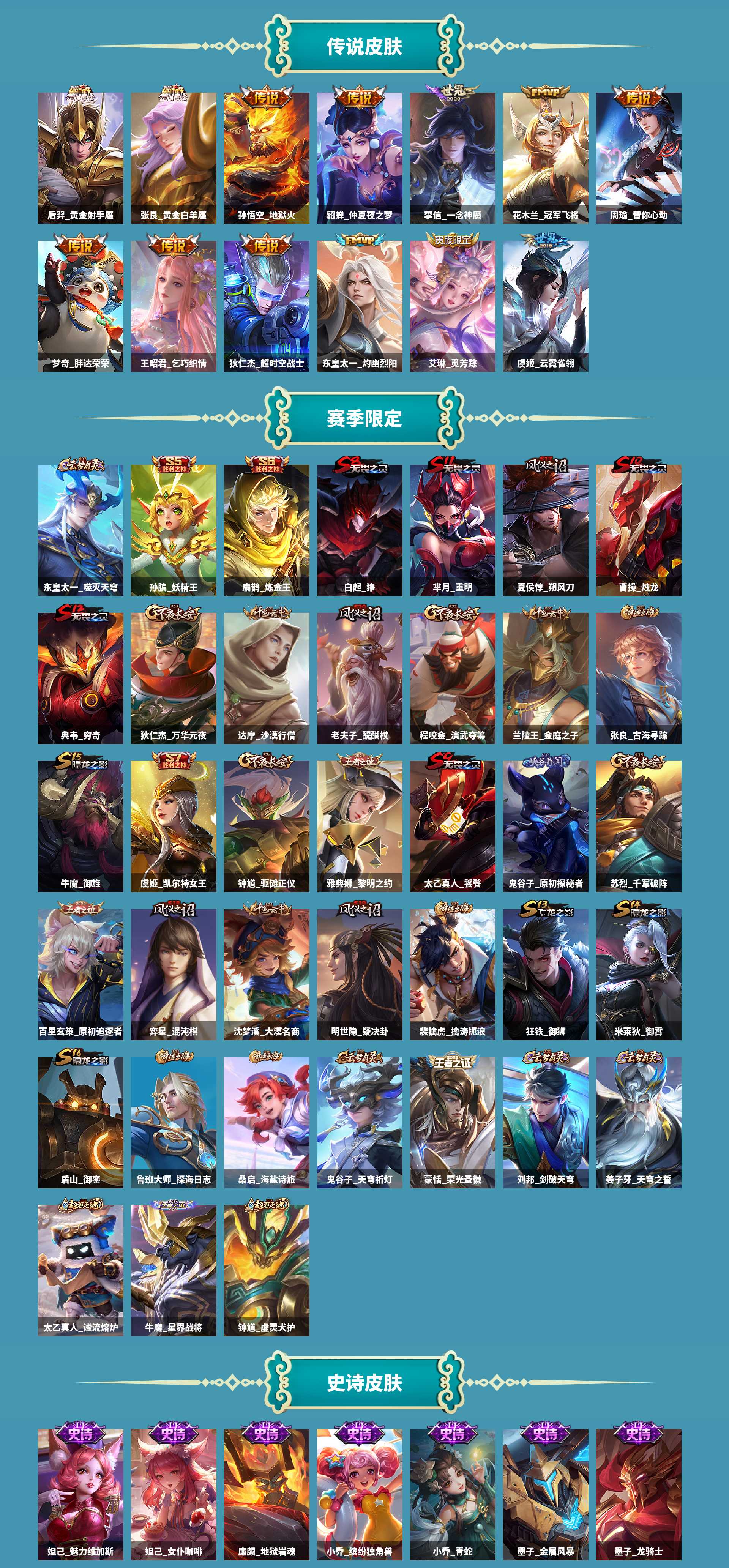 al637591 【特价v10 349皮8水韩信弑呛猎影,貂蝉幻阙歌,鲁班七号星空梦想,夏侯惇无限飓风号,孙尚香杀手不太冷,武则天倪克斯神谕,小乔天鹅之梦 武则天 】 皮肤数349 皮肤价值356776 传说皮肤数17 史诗皮肤数95 英雄数127 营地id536891499 荣耀水晶数8 贵族等级【文本】贵族10级 【贵族10级】 【可排位】 【是】 荣耀典藏7 内测皮肤3 年限皮肤1 限定皮肤96 赛季限定39 史诗皮肤95 战令限定28 勇者皮肤150 其他皮肤80 荣耀典藏:韩信弑呛猎影,貂蝉幻阙歌,鲁班七号星空梦想,夏侯惇无限飓风号,孙尚香杀手不太冷,武则天倪克斯神谕,小乔天鹅之梦; 内测皮肤:姬小满妄想食味,高渐离玩趣恶龙,艾琳女武神; 年限皮肤:牛魔奔雷神使; 限定皮肤:鬼谷子克喵,牛魔星界战将,钟馗虚灵犬护,太乙真人谧流熔炉,百里玄策原初追逐者,东皇太一噬灭天穹,姬小满妄想食味,桑启鸣野蒿,艾琳觅芳踪,姜子牙天穹之誓,女娲朔望之晖,刘邦剑破天穹,鲁班七号蔬乡物语,李元芳蔬乡物语,沈梦溪龙舞盛年,高渐离燃音魔法,妲己灵卜魔法,鬼谷子天穹祈灯,蒙恬荣光圣徽,阿古朵江河有灵,张良古海寻踪,上官婉儿妄想奇谈,马可波罗妄想实况,戈娅驭风魔法,西施玲珑珍味,鲁班大师探海日志,高渐离玩趣恶龙,裴擒虎擒涛扼浪,暃星界游侠,嫦娥暖冬兔眠,桑启海盐诗旅,沈梦溪大漠名商,兰陵王金庭之子,达摩沙漠行僧,雅典娜黎明之约,庄周高山流水,干将莫邪真爱魔法,猪八戒猪悟能,苏烈千军破阵,后羿圣弓游侠,艾琳女武神,老夫子航海奇遇记,鲁班七号乒乒小将,大乔白鹤梁神女,墨子神迹守卫,伽罗天狼溯光者,钟馗驱傩正仪,刘邦夺宝奇兵,米莱狄胡桃异想国,达摩星际陆战队,程咬金演武夺筹,牛魔奔雷神使,元歌云间偶戏,芈月白晶晶,亚瑟潮玩骑士王,狄仁杰万华元夜,虞姬启明星使,云中君纤云弄巧,狄仁杰魔术师,蒙犽狂想玩偶喵,裴擒虎李小龙,鬼谷子原初探秘者,雅典娜单词大作战,蔡文姬繁星吟游,老夫子醍醐杖,明世隐疑决卦,李元芳银河之约,赵云皇家上将,沈梦溪星空之诺,弈星混沌棋,周瑜赤莲之焰,兰陵王驯魔猎人,上官婉儿梁祝,夏侯惇朔风刀,鲁班七号狮舞东方,钟馗神迹守卫,盾山御銮,狄仁杰鹰眼统帅,牛魔御旌,嬴政白昼王子,米莱狄御霄,吕布猎兽之王,狂铁御狮,杨玉环遇见飞天,高渐离死亡摇滚,典韦穷奇,芈月重明,项羽海滩派对,曹操烛龙,太乙真人饕餮,甄姬游园惊梦,狄仁杰阴阳师,白起狰,虞姬凯尔特女王,扁鹊炼金王,孙膑妖精王; 赛季限定:甄姬逆浪荇歌,牛魔星界战将,钟馗虚灵犬护,太乙真人谧流熔炉,百里玄策原初追逐者,东皇太一噬灭天穹,姜子牙天穹之誓,刘邦剑破天穹,鬼谷子天穹祈灯,蒙恬荣光圣徽,张良古海寻踪,鲁班大师探海日志,裴擒虎擒涛扼浪,桑启海盐诗旅,沈梦溪大漠名商,兰陵王金庭之子,达摩沙漠行僧,雅典娜黎明之约,苏烈千军破阵,钟馗驱傩正仪,程咬金演武夺筹,狄仁杰万华元夜,鬼谷子原初探秘者,老夫子醍醐杖,明世隐疑决卦,弈星混沌棋,夏侯惇朔风刀,盾山御銮,牛魔御旌,米莱狄御霄,狂铁御狮,典韦穷奇,芈月重明,曹操烛龙,太乙真人饕餮,白起狰,虞姬凯尔特女王,扁鹊炼金王,孙膑妖精王; 史诗皮肤:牛魔星界战将,百里玄策原初追逐者,姬小满妄想食味,鲁班七号蔬乡物语,高渐离燃音魔法,蒙恬荣光圣徽,阿古朵江河有灵,瑶遇见神鹿,夏洛特永昼,戈娅驭风魔法,钟馗乐园奇幻夜,沈梦溪月团寄思,刘禅电玩爆裂旋风,暃星界游侠,公孙离无限星赏官,大乔白蛇,诸葛亮黄金分割率,铠曙光守护者,孙尚香时之恋人,阿轲节奏热浪,吕布末日机甲,西施诗语江南,蒙犽龙鼓争