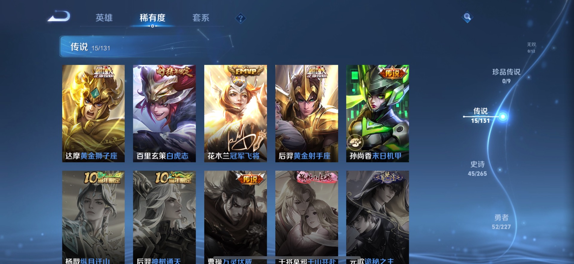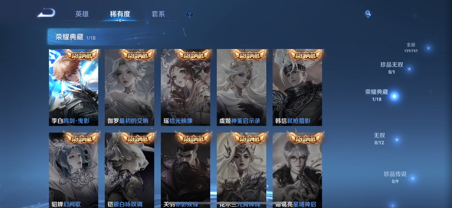v8 1典藏 15传说 118英雄 139皮肤 可修改实名 【英雄全皮】:影全皮 【稀有英雄】:大司命韩信韩跳跳夏洛特夏师傅艾琳橘右京橘子娜可露露鸟人不知火舞赵云金蝉唐僧戈娅 【荣耀水晶】:鸣剑·曳影 【传说皮】:黄金狮子座黄金射手座零号·赤焰末日机甲-