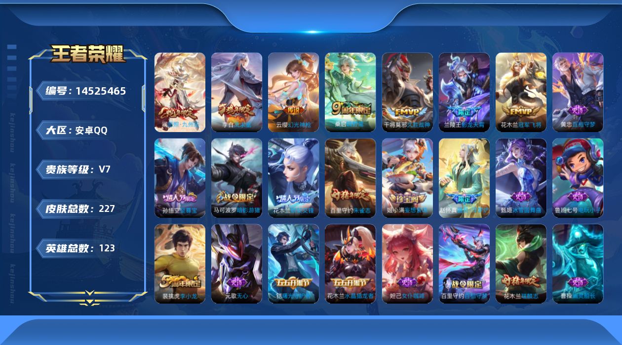 [14525465]安卓q-v7-永恒钻石i段位-123英雄-227皮肤-7传说-63史诗 hh1022 【内测皮肤】:孙尚香蔷薇恋人,狂铁特工战影 【传说皮肤】:李白凤求凰,花木兰冠军飞将,干将莫邪久胜战神,兰陵王影龙天霄,桑启鸣野蒿,云缨幻光神呛,澜愿照九州拓 【限定皮肤】:白起狰,狄仁杰阴阳师,虞姬凯尔特女王,赵云皇家上将,嬴政白昼王子,孙尚香蔷薇恋人,庄周蜃楼王,高渐离死亡摇滚,孙膑妖精王,扁鹊炼金王,芈月重明,吕布猎兽之王,元歌无心,夏侯惇朔风刀,甄姬游园惊梦,曹操烛龙,典韦穷奇,马可波罗暗影游猎,狄仁杰魔术师,狄仁杰万华元夜,达摩沙漠行僧,项羽海滩派对,老夫子醍醐杖,程咬金演武夺筹,兰陵王影龙天霄,兰陵王金庭之子,花木兰瑞麟志,花木兰默契交锋,孙悟空美猴王,孙悟空至尊宝,牛魔御旌,李元芳云中旅人,钟馗驱傩正仪,杨玉环遇见飞天,雅典娜黎明之约,蔡文姬繁星吟游,太乙真人饕餮,太乙真人华丽摇滚,鬼谷子原初探秘者,苏烈千军破阵,百里玄策原初追逐者,百里守约朱雀志,弈星混沌棋,沈梦溪大漠名商,明世隐疑决卦,裴擒虎李小龙,裴擒虎擒涛扼浪,狂铁御狮,米莱狄御霄,云中君纤云弄巧,盾山御銮,猪八戒西部大镖客,上官婉儿梁祝,上官婉儿神器万象笔,鲁班大师探海日志,桑启海盐诗旅,阿古朵江河有灵,张良古海寻踪,蒙犽百解令,蒙恬荣光圣徽,鬼谷子天穹祈灯,姬小满妄想食味,沈梦溪龙舞盛年,刘邦剑破天穹,程咬金群星魔术团,周瑜熔金海岸 【年限皮肤】:百里守约朱雀志,花木兰瑞麟志,孙悟空美猴王,李白凤求凰 【赛季限定】:庄周蜃楼王,孙膑妖精王,扁鹊炼金王,白起狰,芈月重明,夏侯惇朔风刀,曹操烛龙,典韦穷奇,狄仁杰万华元夜,达摩沙漠行僧,老夫子醍醐杖,程咬金演武夺筹,兰陵王金庭之子,张良古海寻踪,牛魔御旌,李元芳云中旅人,虞姬凯尔特女王,钟馗驱傩正仪,雅典娜黎明之约,太乙真人饕餮,鬼谷子原初探秘者,苏烈千军破阵,百里玄策原初追逐者,弈星混沌棋,沈梦溪大漠名商,明世隐疑决卦,裴擒虎擒涛扼浪,狂铁御狮,米莱狄御霄,盾山御銮,鲁班大师探海日志,桑启海盐诗旅,鬼谷子天穹祈灯,蒙恬荣光圣徽,刘邦剑破天穹 【战令限定】:嬴政白昼王子,吕布猎兽之王,马可波罗暗影游猎,猪八戒西部大镖客 【史诗皮肤】:鲁班七号电玩小子,赵云皇家上将,貂蝉圣诞恋歌,甄姬冰雪圆舞曲,王昭君偶像歌手,狄仁杰魔术师,廉颇地狱岩魂,宫本武藏鬼剑武藏,孙