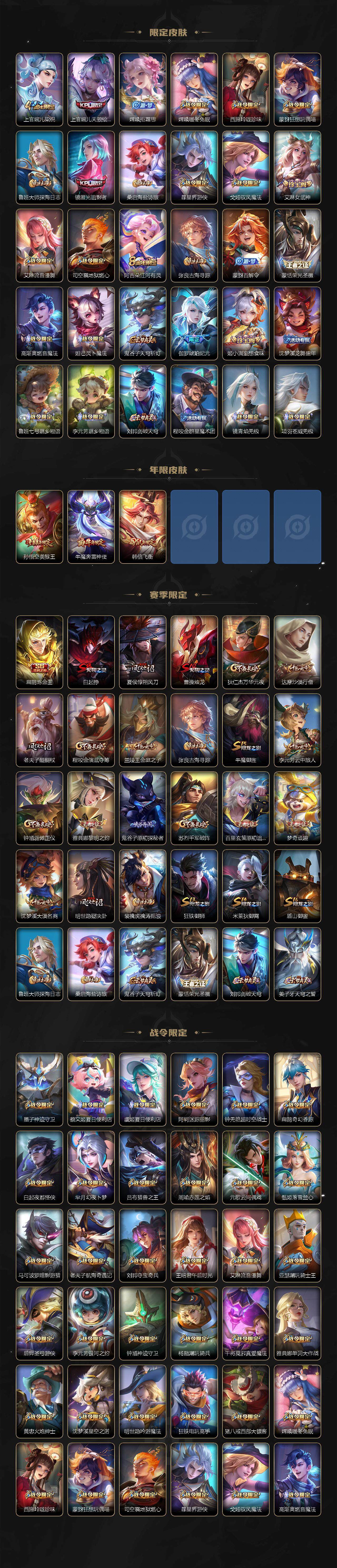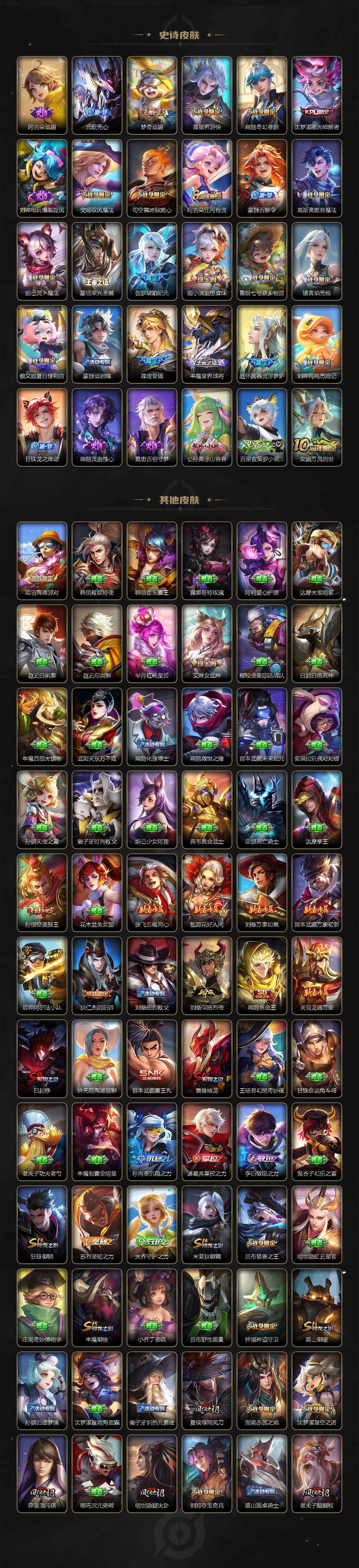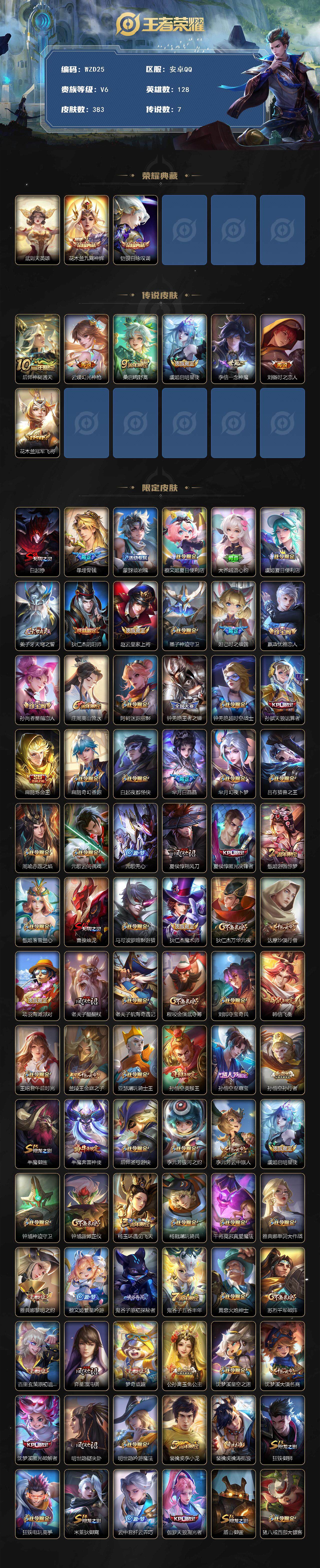 【wzd25】贵族6/皮肤383/典藏2/传说7/史诗125/英雄128/刘禅全皮/刘邦全皮/孙权全皮/钟馗全皮/鬼谷子全皮/沈梦溪全皮/狂铁全皮/蒙恬全皮/阿古朵全皮/空空儿全皮/影全皮/武则天/花木兰-九霄神辉/铠-银白咏叹调/后羿神树通天/云缨-幻光神呛/桑启-鸣野蒿/虞姬-启明星使/李信-一念神魔/刘备-时之恋人/花木兰-冠军飞将/白起-狰/暃-埋骨钱/蒙犽-顽岩魄/蔡文姬-夏日便利店