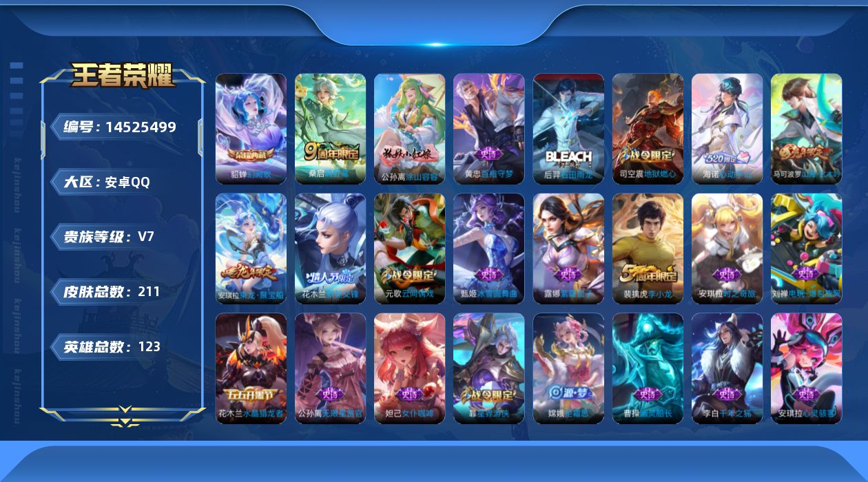 v7 1典藏 1传说 123英雄 211皮肤 可修改实名 【英雄全皮】:海诺全皮 【稀有英雄】:大司命韩信韩跳跳夏洛特夏师傅艾琳橘右京橘子娜可露露鸟人不知火舞赵云金蝉唐僧戈娅 【荣耀水晶】:幻阙歌貂蝉典藏 【珍宝阁皮】:蔷薇恋人玩趣恶龙 【赛季/战令皮】