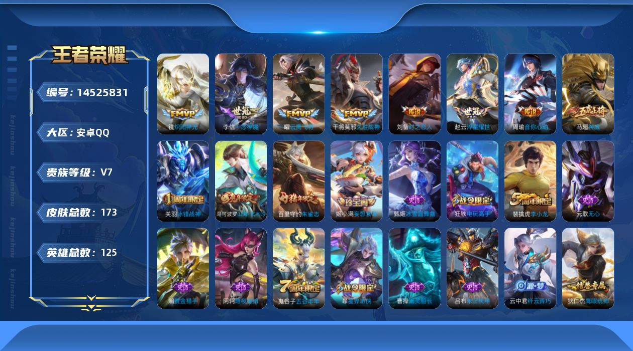 [14525831]v7-124英雄-173皮肤-7传说-44史诗cc8117 【内测皮肤】:狂铁特工战影,干将莫邪胡桃夹子 【传说皮肤】:干将莫邪久胜战神,刘备时之恋人,李信一念神魔,曜云鹰飞将,镜炽阳神光,周瑜音你心动,赵云淬星耀世 【限定皮肤】:狄仁杰阴阳师,赵云皇家上将,鲁班七号狮舞东方,钟无艳超时空战士,元歌无心,夏侯惇朔风刀,甄姬落雪兰心,马可波罗山海玄木吟,狄仁杰魔术师,狄仁杰万华元夜,达摩沙漠行僧,项羽海滩派对,老夫子醍醐杖,关羽冰锋战神,王昭君午后时光,兰陵王金庭之子,牛魔御旌,李元芳云中旅人,钟馗神迹守卫,钟馗驱傩正仪,干将莫邪胡桃夹子,雅典娜黎明之约,鬼谷子原初探秘者,鬼谷子五谷丰年,苏烈千军破阵,百里玄策原初追逐者,百里守约朱雀志,弈星混沌棋,梦奇顽趣,沈梦溪大漠名商,明世隐疑决卦,裴擒虎李小龙,裴擒虎擒涛扼浪,狂铁电玩高手,云中君纤云弄巧,盾山御銮,上官婉儿梁祝,嫦娥暖冬兔眠,鲁班大师探海日志,桑启海盐诗旅,暃星界游侠,阿古朵江河有灵,张良古海寻踪,蒙犽百解令,蒙恬荣光圣徽,鬼谷子天穹祈灯,姬小满妄想食味,沈梦溪龙舞盛年,刘邦剑破天穹 【年限皮肤】:百里守约朱雀志,马超神威,马可波罗山海玄木吟 【赛季限定】:夏侯惇朔风刀,狄仁杰万华元夜,达摩沙漠行僧,老夫子醍醐杖,兰陵王金庭之子,张良古海寻踪,牛魔御旌,李元芳云中旅人,钟馗驱傩正仪,雅典娜黎明之约,鬼谷子原初探秘者,苏烈千军破阵,百里玄策原初追逐者,弈星混沌棋,梦奇顽趣,沈梦溪大漠名商,明世隐疑决卦,裴擒虎擒涛扼浪,盾山御銮,鲁班大师探海日志,桑启海盐诗旅,鬼谷子天穹祈灯,蒙恬荣光圣徽,刘邦剑破天穹 【战令限定】:鲁班七号狮舞东方,钟无艳超时空战士,甄姬落雪兰心,王昭君午后时光,钟馗神迹守卫,狂铁电玩高手,嫦娥暖冬兔眠,暃星界游侠 【史诗皮肤】:阿轲暗夜猫娘,赵云皇家上将,貂蝉圣诞恋歌,甄姬冰雪圆舞曲,王昭君偶像歌手,狄仁杰魔术师,廉颇地狱岩魂,宫本武藏鬼剑武藏,孙尚香水果甜心,妲己魅力维加斯,曹操幽灵船长,吕布末日机甲,关羽冰锋战神,刘邦德古拉伯爵,夏侯惇乘风破浪,兰陵王暗隐猎兽者,诸葛亮黄金分割率,百里守约特工魅影,刘禅天才门将,李元芳逐浪之夏,白起星夜王子,阿轲节奏热浪,孙策猫狗日记,百里守约朱雀志,鲁班七号狮舞东方,狄仁杰鹰眼统帅,上官婉儿梁祝,马超神威,百里玄策原初追逐者,裴擒虎李小龙,云中君纤云