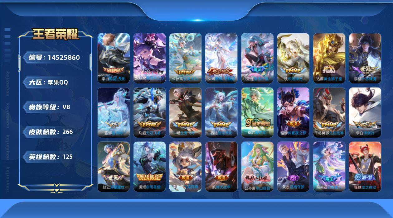 v8 1典藏 1珍品传说 18传说 125英雄 266皮肤 可修改实名 【稀有英雄】:大司命韩信韩跳跳夏洛特夏师傅艾琳橘右京橘子娜可露露鸟人不知火舞赵云金蝉唐僧戈娅 【荣耀水晶】:鸣剑·曳影 【珍品传说】:酷洛米之心 【传说皮】:落雪白狼云诺千山游龙清影