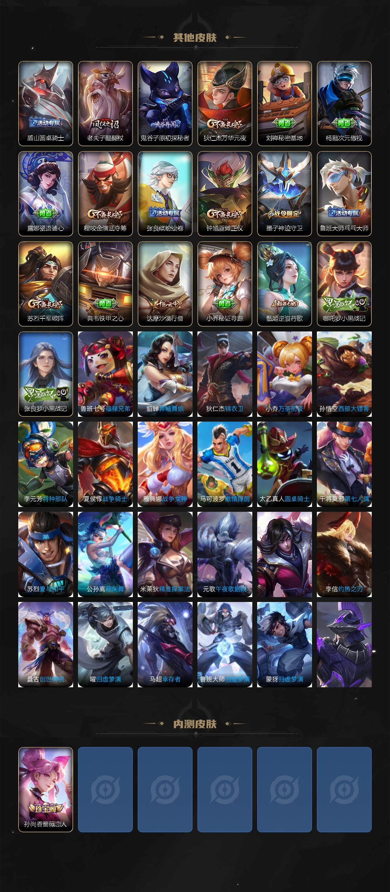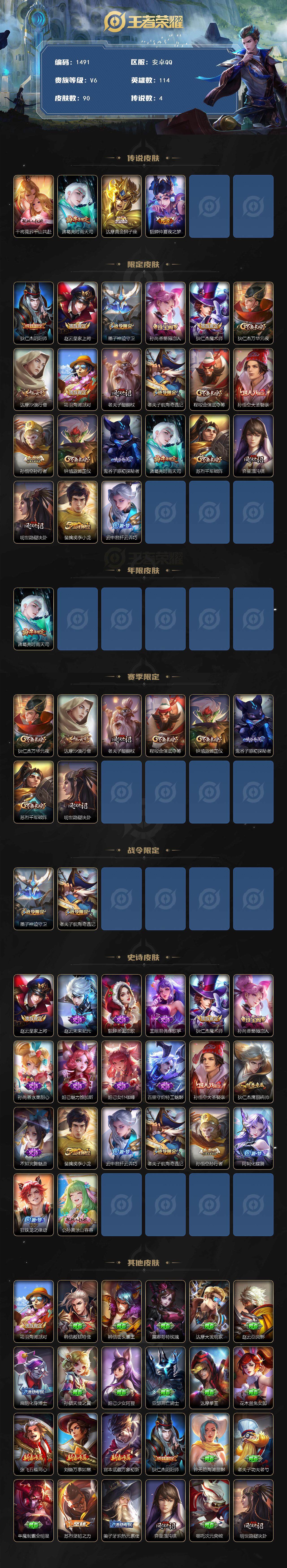 114英雄-90皮肤-贵族6/皮肤90/传说4/史诗20/英雄114/千山共赴 干将莫邪/时雨天司 诸葛亮/黄金狮子座 达摩/仲夏夜之梦 貂蝉/阴阳师 狄仁杰/皇家上将 赵云/神迹守卫 墨子/蔷薇恋人 孙尚香/魔术师 狄仁杰/万华元夜 狄仁杰/沙漠行僧 达摩/海滩派对 项羽/醍醐杖 老夫子/航海奇遇记 老夫子/演武夺筹 程咬金/大圣娶亲 孙悟空/孙行者 孙悟空/驱傩正仪 钟馗/原初探秘者 鬼谷子/千军破阵 苏烈/混