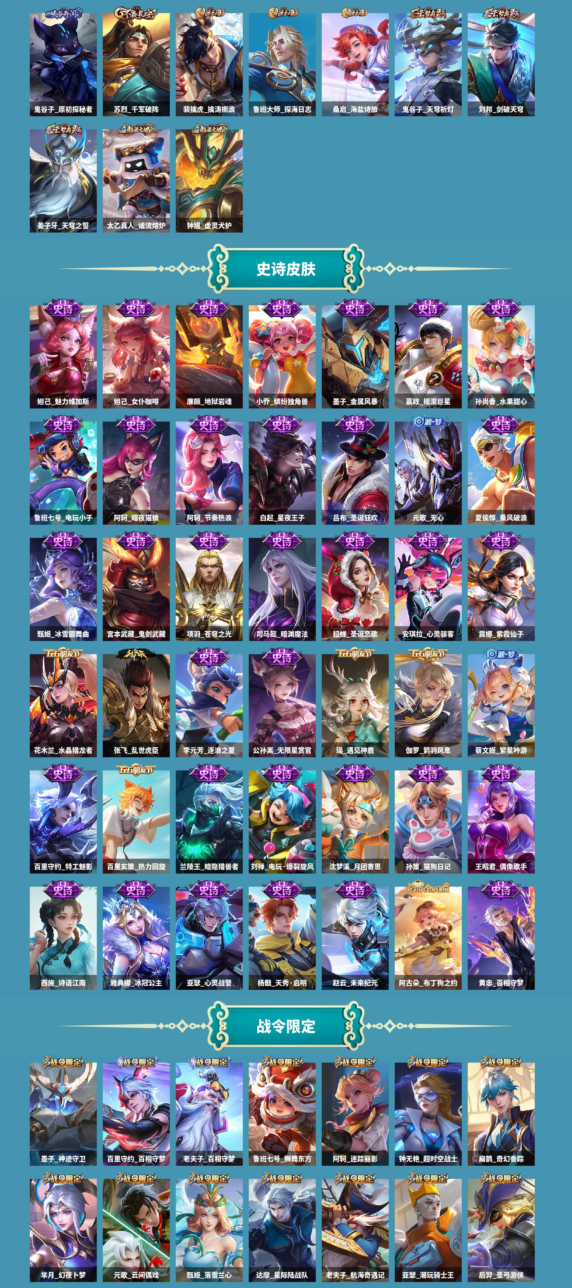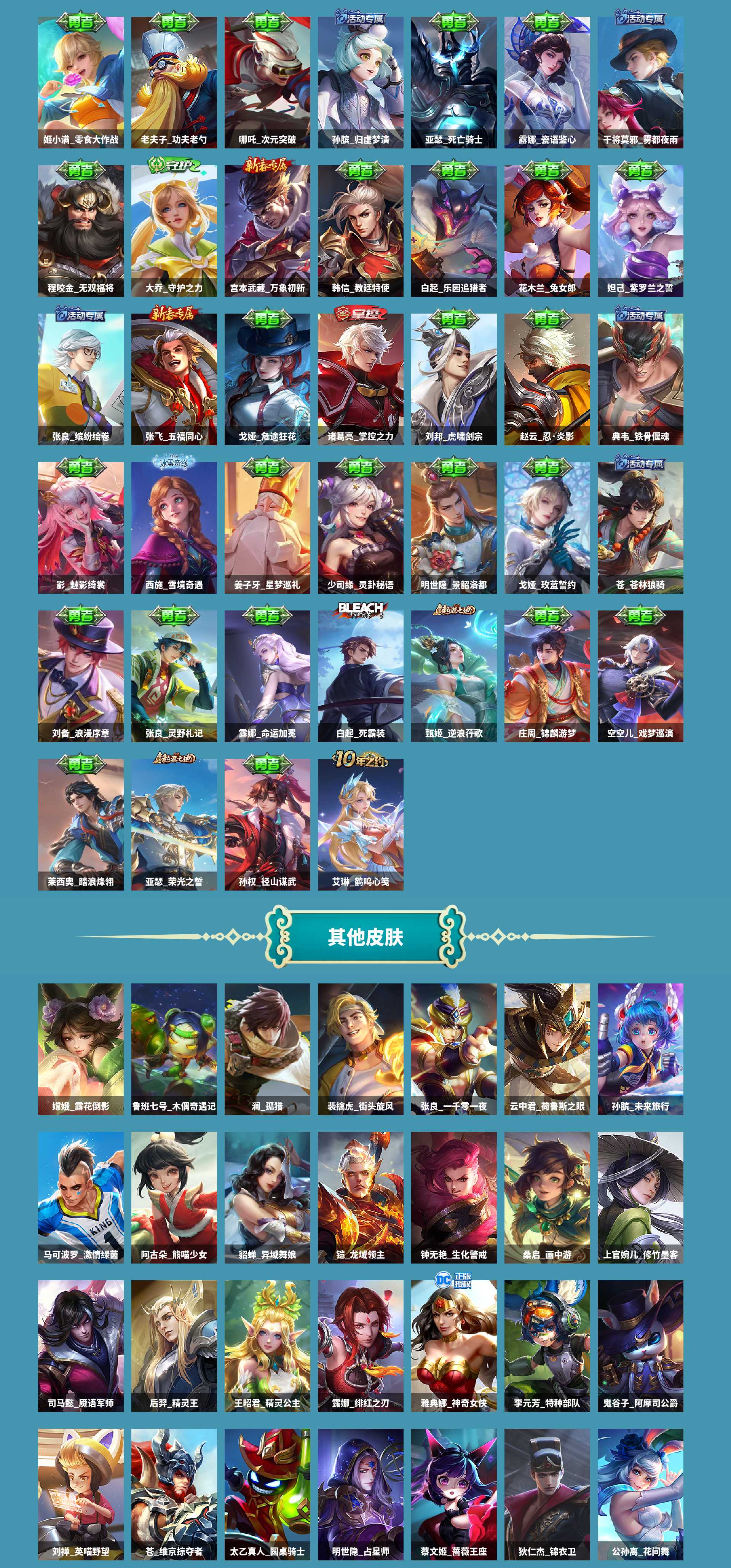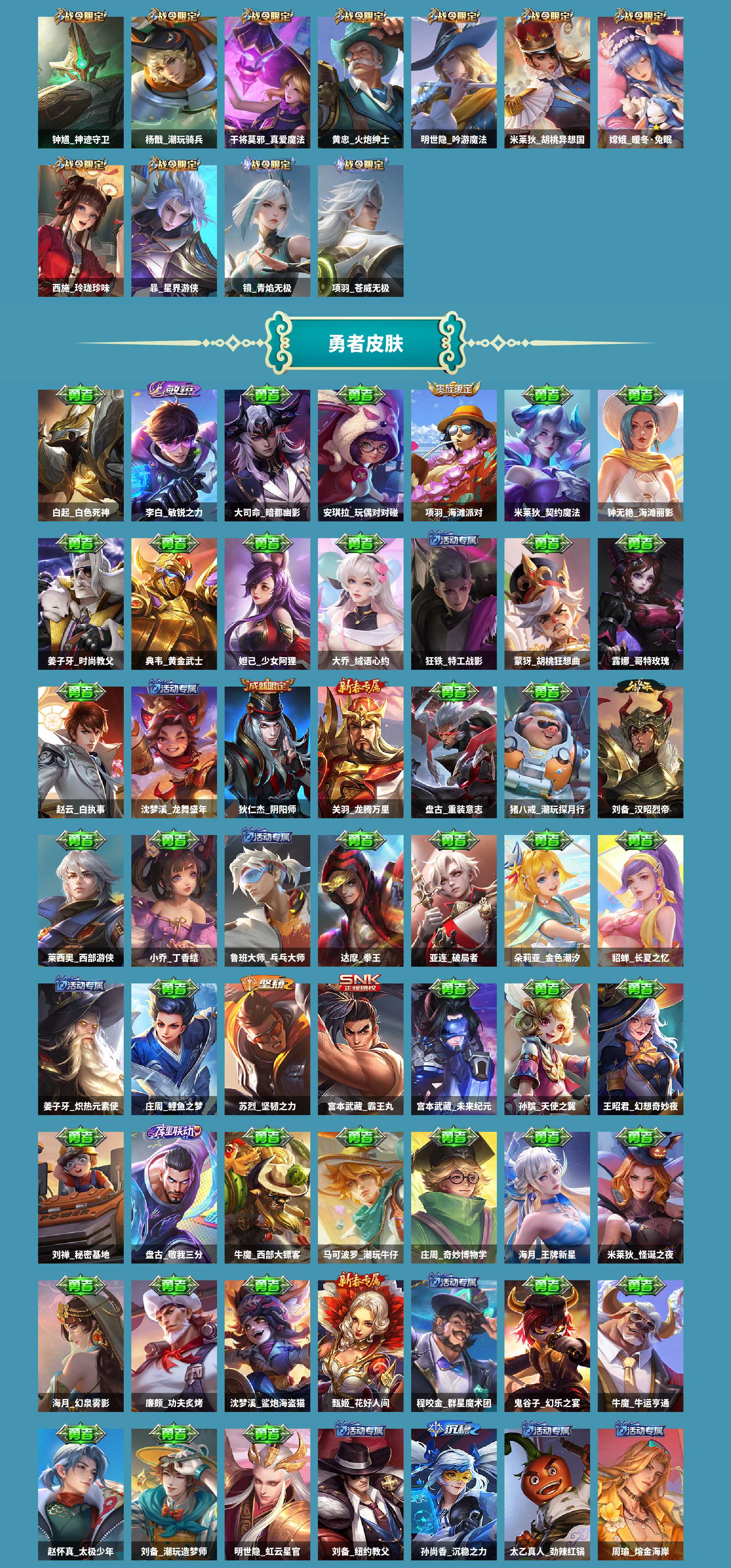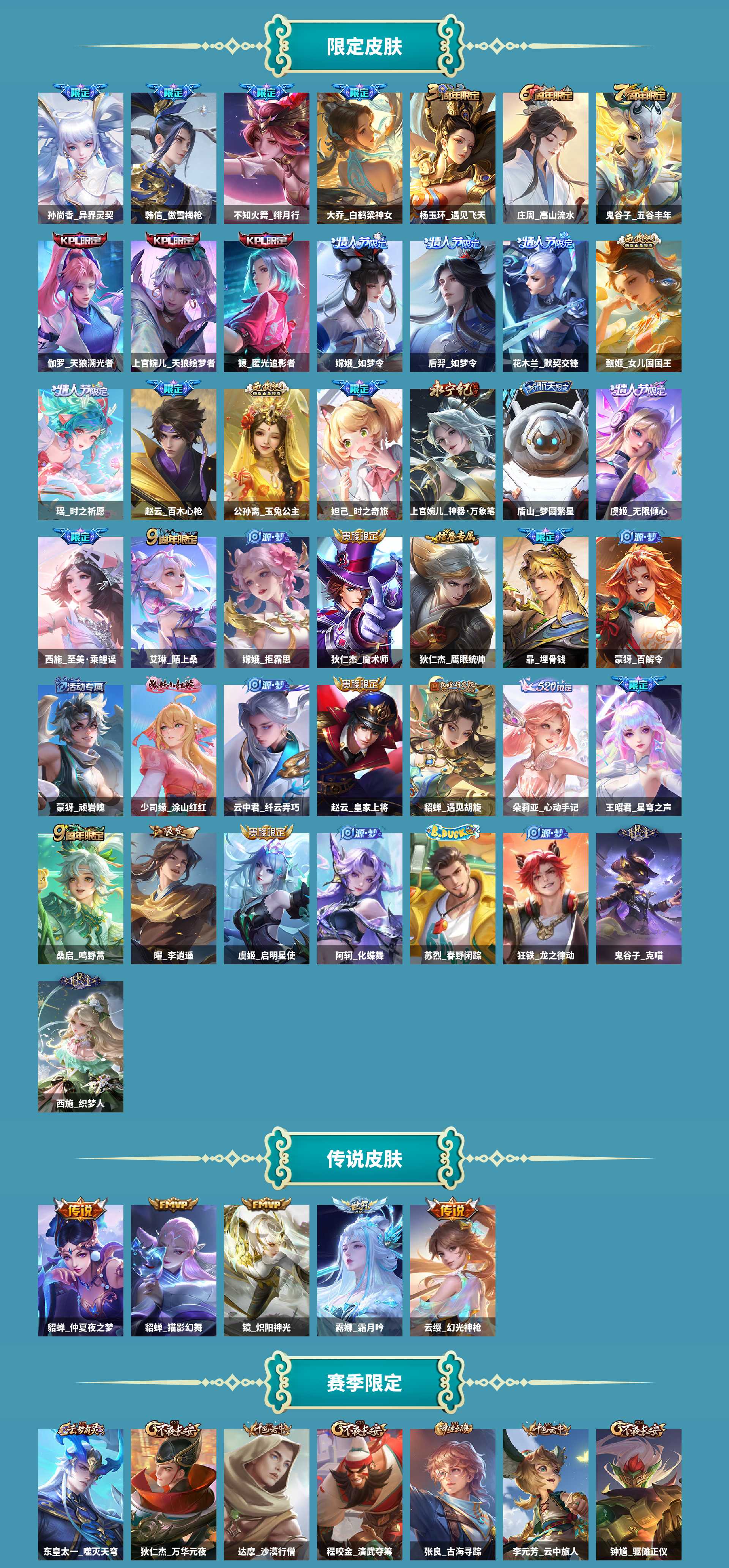 al636730 【极品女号3典藏貂蝉幻阙歌瑶拾光映像小乔天鹅之梦无双皮肤瑶真我赫兹,3珍品传说嫦娥器灵落星马可波罗怪盗基德瑶大耳狗之梦】 皮肤数287 皮肤价值262360 无双皮肤数1 传说皮肤数18 珍品传说皮数3 星传说皮肤数1 史诗皮肤数93 英雄数127 营地id1863822984 贵族等级【文本】贵族8级 【贵族8级】 【可排位】 【是】 星元皮肤1 荣耀典藏3 无双皮肤1 珍品传说3 内测皮肤3 年限皮肤8 限定皮肤107 赛季限定19 史诗皮肤94 战令限定25 勇者皮肤125 其他皮肤42 星元皮肤:貂蝉金色仲夏夜; 荣耀典藏:貂蝉幻阙歌,瑶拾光映像,小乔天鹅之梦; 无双皮肤:瑶真我赫兹; 珍品传说:嫦娥器灵落星盏,马可波罗怪盗基德,瑶大耳狗之梦; 内测皮肤:姬小满妄想食味,嬴政优雅恋人,孙尚香蔷薇恋人; 年限皮肤:公孙离祈雪灵祝,女娲愿照千秋盛,赵云龙胆,马可波罗山海玄木吟,瑶山海碧波行,百里守约朱雀志,鲁班七号寅虎瑞焰,杨玉环寅虎心曲; 限定皮肤:西施织梦人,少司缘涂山红红,鬼谷子克喵,狂铁龙之律动,白起死霸装,苏烈春野闲踪,钟馗虚灵犬护,阿轲化蝶舞,公孙离祈雪灵祝,嫦娥器灵落星盏,女娲愿照千秋盛,太乙真人谧流熔炉,百里守约百相守梦,老夫子百相守梦,马可波罗怪盗基德,西施至美乘鲤谣,姬小满妄想食味,桑启鸣野蒿,艾琳陌上桑,东皇太一噬灭天穹,沈梦溪龙舞盛年,盘古敬我三分,蒙犽顽岩魄,暃埋骨钱,姜子牙天穹之誓,镜青焰无极,项羽苍威无极,朵莉亚心动手记,刘邦剑破天穹,鬼谷子天穹祈灯,蒙犽百解令,张良古海寻踪,西施玲珑珍味,鲁班大师探海日志,明世隐吟游魔法,扁鹊奇幻香踪,杨戬潮玩骑兵,裴擒虎擒涛扼浪,蔡文姬繁星吟游,暃星界游侠,虞姬无限倾心,虞姬启明星使,赵云龙胆,马可波罗山海玄木吟,瑶山海碧波行,嫦娥暖冬兔眠,桑启海盐诗旅,雅典娜神奇女侠,不知火舞绯月行,元歌无心,上官婉儿神器万象笔,钟无艳超时空战士,孙尚香异界灵契,盾山梦圆繁星,鬼谷子五谷丰年,嬴政优雅恋人,王昭君星穹之声,甄姬落雪兰心,李元芳云中旅人,妲己时之奇旅,上官婉儿天狼绘梦者,百里守约朱雀志,韩信傲雪梅呛,钟馗神迹守卫,公孙离玉兔公主,赵云百木心呛,瑶时之祈愿,鲁班七号狮舞东方,芈月幻夜卜梦,黄忠火炮绅士,鲁班七号寅虎瑞焰,后羿如梦令,嫦娥如梦令,杨玉环寅虎心曲,孙尚香蔷薇恋人,达摩沙漠行僧,甄姬女儿国国王,镜匿光追影者,嫦娥拒霜思,貂蝉遇见胡旋,干将莫邪真爱魔法,杨玉环遇见飞天,庄周高山流水,后羿圣弓游侠,苏烈千军破阵,墨子神迹守卫,老夫子航海奇遇记,大乔白鹤梁神女,钟馗驱傩正仪,伽罗天狼溯光者,阿轲迷踪丽影,曜李,米莱狄胡桃异想国,狄仁杰魔术师,狄仁杰阴阳师,程咬金演武夺筹,达摩星际陆战队,花木兰默契交锋,赵云皇家上将,元歌云间偶戏,亚瑟潮玩骑士王,项羽海滩派对,狄仁杰万华元夜,狄仁杰鹰眼统帅,云中君纤云弄巧,鬼谷子原初探秘者,瑶大耳狗之梦; 赛季限定:亚瑟荣光之誓,甄姬逆浪荇歌,钟馗虚灵犬护,太乙真人谧流熔炉,东皇太一噬灭天穹,姜子牙天穹之誓,刘邦剑破天穹,鬼谷子天穹祈灯,张良古海寻踪,鲁班大师探海日志,裴擒虎擒涛扼浪,桑启海盐诗旅,李元芳云中旅人,达摩沙漠行僧,苏烈千军破阵,钟馗驱傩正仪,程咬金演武夺筹,狄仁杰万华元夜,鬼谷子原初探秘者; 史诗皮肤:司马懿暗渊魔法,西施织梦人,少司缘涂山红红,兰陵王暗隐猎兽者,黄忠百相守梦,狂铁龙之律动,嬴政摇滚巨星,阿轲化蝶舞,吕布圣诞狂欢,廉颇地狱岩魂,杨戬天秀启明,百里守约百相守梦,张飞乱世虎臣,小乔缤纷独