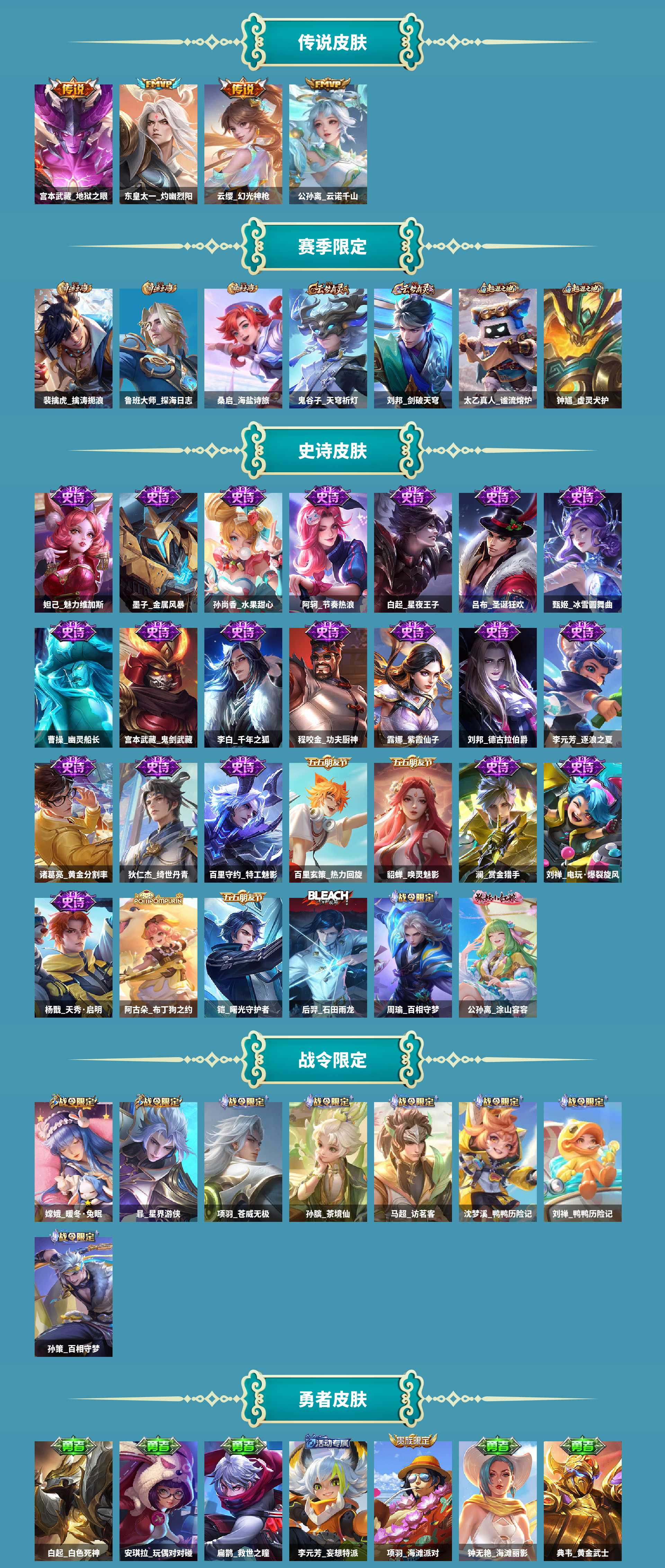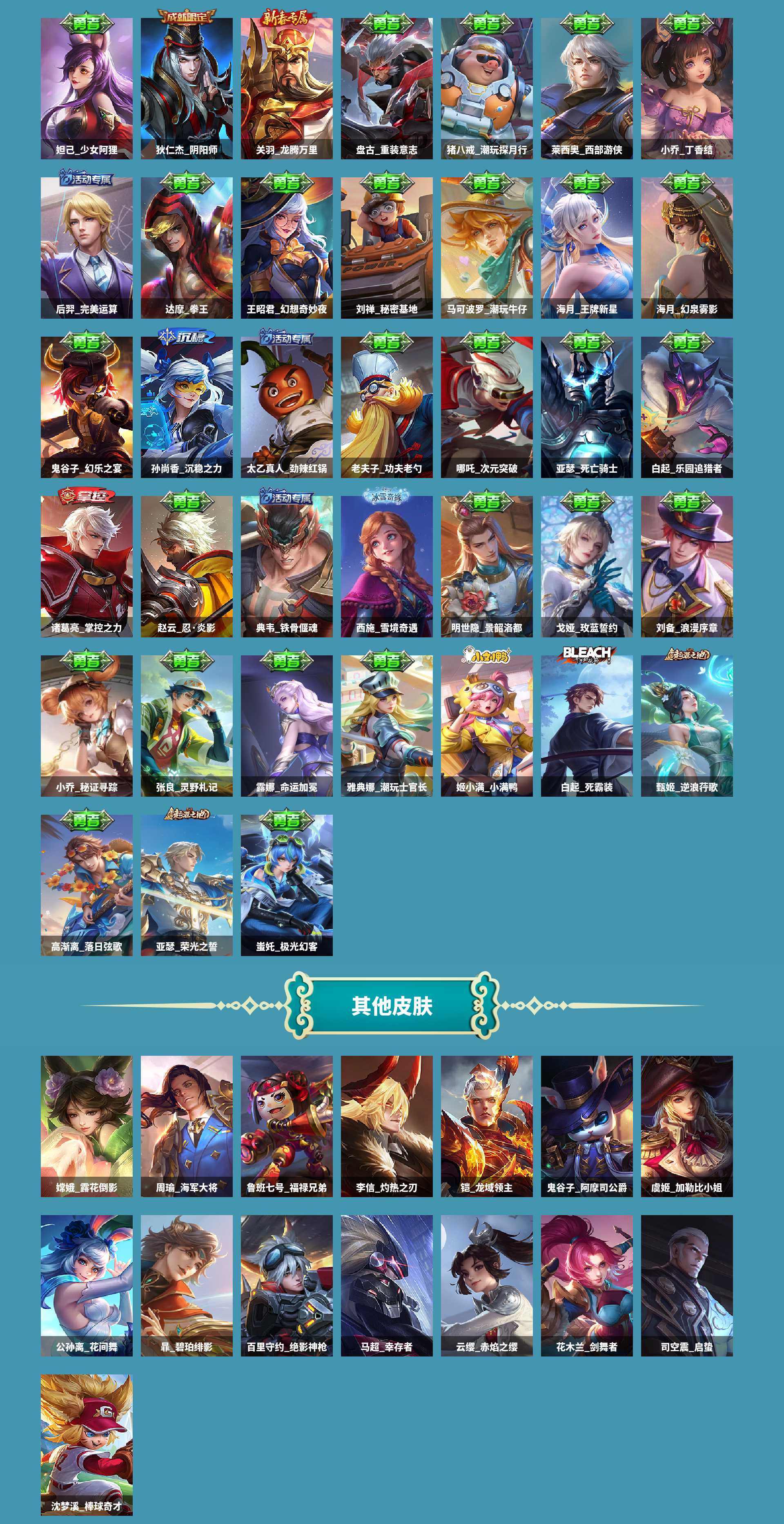 al637036 【极品珍品传说瑶大耳狗之梦7传说号亲情价出】 皮肤数122 皮肤价值80848 传说皮肤数7 珍品传说皮数1 星传说皮肤数1 史诗皮肤数39 英雄数123 营地id1758932927 贵族等级【文本】贵族6级 【贵族6级】 【可排位】 【是】 星元皮肤1 珍品传说1 内测皮肤1 年限皮肤3 限定皮肤33 赛季限定9 史诗皮肤39 战令限定9 勇者皮肤58 其他皮肤15 星元皮肤:宫本武藏幽冥之眼; 珍品传说:瑶大耳狗之梦; 内测皮肤:姬小满妄想食味; 年限皮肤:司空震愿照山河定,孙悟空美猴王,马可波罗山海玄木吟; 限定皮肤:姬小满妄想食味,项羽苍威无极,后羿石田雨龙,白起死霸装,扁鹊灵蛊蚀心,姬小满小满鸭,瑶大耳狗之梦,老夫子_藏狐·褐绒,百里守约雪豹霜爪,狂铁龙之律动,苏烈春野闲踪,钟馗虚灵犬护,阿轲化蝶舞,马超访茗客,孙膑茶境仙,狄仁杰魔术师,西施续相思,司空震愿照山河定,太乙真人谧流熔炉,刘邦剑破天穹,鬼谷子天穹祈灯,狄仁杰鹰眼统帅,孙悟空美猴王,鲁班大师探海日志,狄仁杰阴阳师,裴擒虎擒涛扼浪,暃星界游侠,赵云皇家上将,嫦娥暖冬兔眠,虞姬无限倾心,项羽海滩派对,马可波罗山海玄木吟,桑启海盐诗旅; 赛季限定:亚瑟荣光之誓,甄姬逆浪荇歌,钟馗虚灵犬护,太乙真人谧流熔炉,刘邦剑破天穹,鬼谷子天穹祈灯,鲁班大师探海日志,裴擒虎擒涛扼浪,桑启海盐诗旅; 史诗皮肤:百里守约特工魅影,宫本武藏鬼剑武藏,公孙离涂山容容,姬小满妄想食味,甄姬冰雪圆舞曲,周瑜百相守梦,后羿石田雨龙,扁鹊灵蛊蚀心,杨戬天秀启明,澜赏金猎手,墨子金属风暴,貂蝉唤灵魅影,阿古朵_布丁狗之约,百里守约雪豹霜爪,狂铁龙之律动,刘禅鸭鸭历险记,阿轲化蝶舞,刘邦德古拉伯爵,露娜紫霞仙子,孙膑茶境仙,狄仁杰魔术师,狄仁杰绮世丹青,程咬金功夫厨神,曹操幽灵船长,白起星夜王子,狄仁杰鹰眼统帅,刘禅电玩爆裂旋风,吕布圣诞狂欢,暃星界游侠,孙尚香水果甜心,百里玄策热力回旋,赵云皇家上将,诸葛亮黄金分割率,铠曙光守护者,李白千年之狐,李元芳逐浪之夏,马可波罗山海玄木吟,妲己魅力维加斯,阿轲节奏热浪; 战令限定:项羽苍威无极,孙策百相守梦,周瑜百相守梦,沈梦溪鸭鸭历险记,刘禅鸭鸭历险记,马超访茗客,孙膑茶境仙,暃星界游侠,嫦娥暖冬兔眠; 勇者皮肤:蚩奼极光幻客,安琪拉玩偶对对碰,亚瑟荣光之誓,达摩拳王,高渐离落日弦歌,海月幻泉雾影,海月王牌新星,盘古重装意志,项羽苍威无极,孙策百相守梦,甄姬逆浪荇歌,哪吒次元突破,白起死霸装,姬小满小满鸭,露娜命运加冕,雅典娜潮玩士官长,扁鹊救世之瞳,王昭君幻想奇妙夜,关羽龙腾万里,老夫子功夫老勺,妲己少女阿狸,诸葛亮掌控之力,马可波罗潮玩牛仔,张良灵野札记,钟馗虚灵犬护,小乔秘证寻踪,沈梦溪鸭鸭历险记,刘备浪漫序章,小乔丁香结,刘禅秘密基地,戈娅玫蓝誓约,马超访茗客,白起白色死神,明世隐景韶洛都,太乙真人谧流熔炉,西施雪境奇遇,典韦铁骨偃魂,后羿完美运算,刘邦剑破天穹,鬼谷子幻乐之宴,鬼谷子天穹祈灯,李元芳妄想特派,孙悟空美猴王,鲁班大师探海日志,猪八戒潮玩探月行,狄仁杰阴阳师,典韦黄金武士,莱西奥西部游侠,太乙真人劲辣红锅,裴擒虎擒涛扼浪,钟无艳海滩丽影,孙尚香沉稳之力,白起乐园追猎者,嫦娥暖冬兔眠,项羽海滩派对,赵云忍炎影,桑启海盐诗旅,亚瑟死亡骑士; 其他皮肤:鬼谷子阿摩司公爵,周瑜海军大将,马超幸存者,公孙离花间舞,司空震启蛰,铠龙域领主,花木兰剑舞者,暃碧珀绯影,嫦娥露花倒影,李信灼热之刃,百里守约绝影神呛,云缨赤焰之缨,沈梦溪棒球奇才,虞