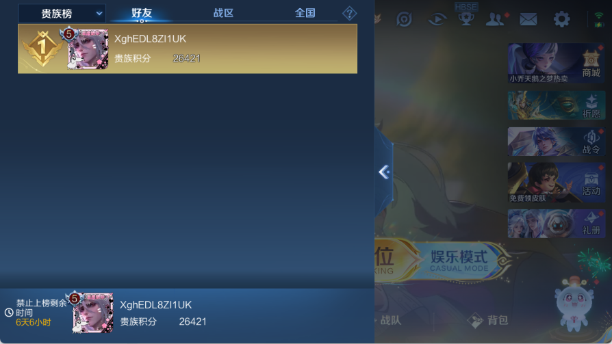 _2303154-实名:可修改贵族等级:v7英雄数:125皮肤数:271传说皮:地狱之眼限定皮:遇见飞天李小龙梁祝御风骁将白晶晶凤求凰瑞麟志朱雀志至尊宝霸王别姬-虞姬高山流水猪悟能五谷丰年鸣野蒿愿照·众生和愿照·九州拓亮点:【精品号手慢无】v7对抗路练手小号,对抗路25段,消耗任意点券恢复v7,星币3761,传说皮地狱之眼,限定皮白晶晶凤求凰瑞麟志朱雀志至尊宝,71史诗皮,53赛季战令皮.