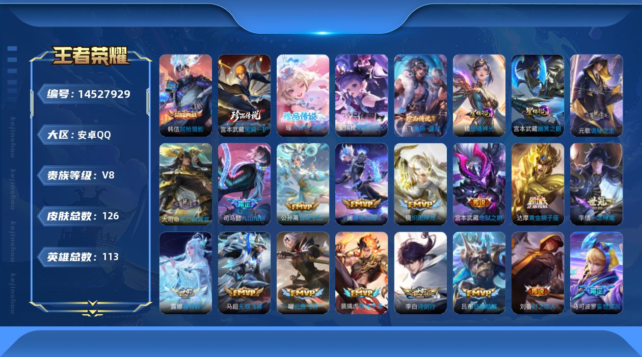 [14527929]安卓q-v8-最强王者段位-113英雄-126皮肤-1典藏-0珍品无双-0无双-4珍品传说-22传说-37史诗 【英雄全皮】:司马懿全皮,孙权全皮 【荣耀典藏】:韩信弑呛猎影 【珍品传说】:张飞兔狲蓬尾,瑶大耳狗之梦,安琪拉酷洛米之心,宫本武藏黑崎一护 【传说皮肤】:后羿神树通天,元歌诡秘之主,大司命死亡执政官,司马懿九山相柳,公孙离云诺千山,裴擒虎祥瑞亨通,澜逐花归海,露娜霜月吟,马可波罗妄想实况,吕布怒海麟威,李白诗剑行,马超无双飞将,周瑜音你心动,镜炽阳神光,虞姬启明星使,曜云鹰飞将,李信一念神魔,刘备时之恋人,虞姬云霓雀翎,达摩黄金狮子座,宫本武藏地狱之眼,武则天海洋之心 【限定皮肤】:狄仁杰阴阳师,赵云皇家上将,元歌云间偶戏,马可波罗妄想实况,狄仁杰魔术师,项羽海滩派对,李元芳云中旅人,虞姬启明星使,沈梦溪匿光破解者,裴擒虎李小龙,桑启海盐诗旅,伽罗琥珀纪元,姬小满妄想食味 【赛季限定】:李元芳云中旅人,桑启海盐诗旅 【战令限定】:元歌云间偶戏 【史诗皮肤】:鲁班七号电玩小子,赵云皇家上将,王昭君偶像歌手,狄仁杰魔术师,廉颇地狱岩魂,宫本武藏鬼剑武藏,孙尚香水果甜心,嬴政摇滚巨星,妲己女仆咖啡,墨子金属风暴,张飞乱世虎臣,兰陵王暗隐猎兽者,诸葛亮黄金分割率,百里守约特工魅影,铠曙光守护者,孙策猫狗日记,狄仁杰鹰眼统帅,橘右京修罗,裴擒虎李小龙,元歌云间偶戏,杨戬天秀启明,沈梦溪月团寄思,司马懿暗渊魔法,沈梦溪匿光破解者,伽罗琥珀纪元,姬小满妄想食味,马可波罗星界特工,阿轲化蝶舞,刘禅鸭鸭历险记,狂铁龙之律动,百里守约雪豹霜爪,后羿石田雨龙,周瑜百相守梦,云缨赞萌露比,黄忠百相守梦,公孙离涂山容容,莱西奥光弋星穹 【其他皮肤】:项羽海滩派对,韩信教廷特使,赵云忍炎影,芈月红桃皇后,白起白色死神,孙膑天使之翼,妲己少女阿狸,典韦黄金武士,狄仁杰阴阳师,刘备汉昭烈帝,王昭君幻想奇妙夜,诸葛亮掌控之力,典韦铁甲之心,马可波罗潮玩牛仔,刘禅唤灵魔甲,李元芳云中旅人,戈娅危途狂花,桑启海盐诗旅,大司命暗都幽影,太乙真人谧流熔炉,西施雪境奇遇,明世隐景韶洛都,戈娅玫蓝誓约,刘备浪漫序章,钟馗虚灵犬护,沈梦溪鸭鸭历险记,苏烈春野闲踪,张良灵野札记,阿古朵布丁狗之约,露娜命运加冕,雅典娜潮玩士官长,姬小满小满鸭,白起死霸装,甄姬逆浪荇歌,孙策百相守梦,庄周锦麟游梦,莱西奥