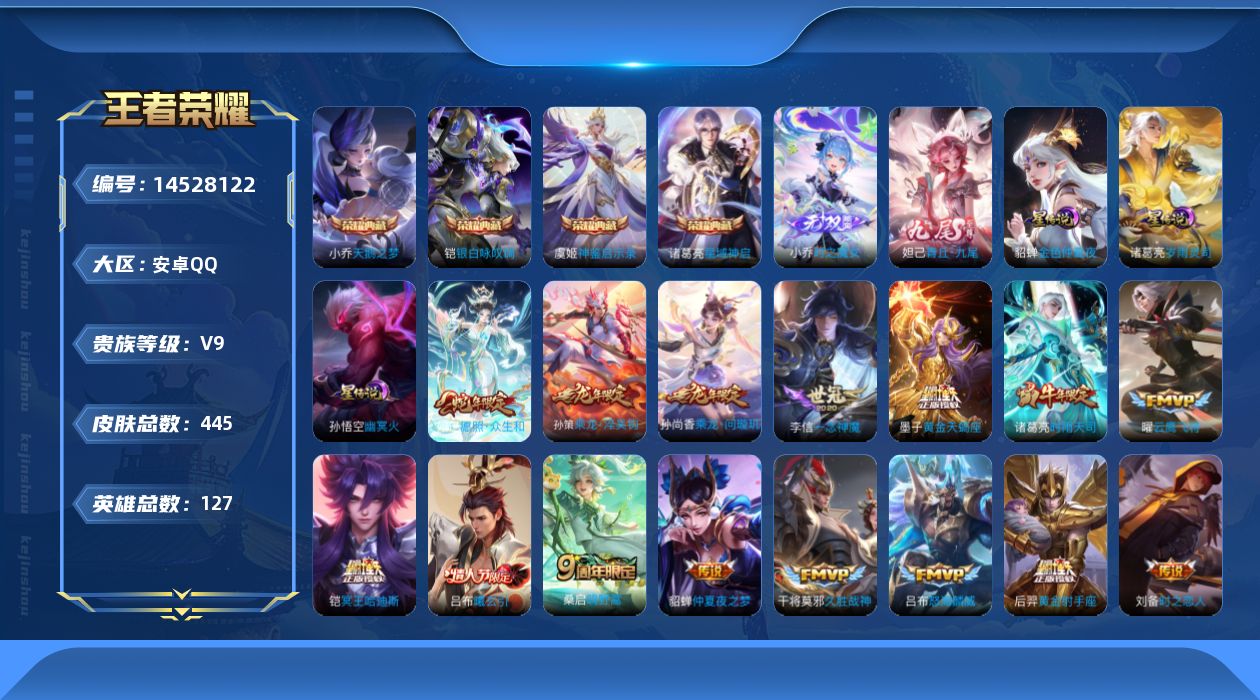 [14528122]v9 背包有颗荣耀水晶 有个小兵皮肤 安卓q-v9-最强王者段位-127英雄-445皮肤-4典藏-0珍品无双-2无双-0珍品传说-27传说-132史诗 【英雄全皮】:阿轲全皮,扁鹊全皮,孙权全皮,钟馗全皮,鬼谷子全皮,狂铁全皮,蒙恬全皮,阿古朵全皮,戈娅全皮,空空儿全皮,影全皮 【荣耀典藏】:小乔天鹅之梦,诸葛亮星域神启,铠银白咏叹调,虞姬神鉴启示录 【无双皮肤】:妲己青丘九尾,小乔时之魔女 【传说皮肤】:后羿神树通天,妲己愿照众生和,桑启鸣野蒿,铠冥王哈迪斯,墨子黄金天蝎座,吕布曦玄引,孙尚香乘龙问璇玑,孙策乘龙淬吴钩,吕布怒海麟威,百里守约碎云,孙尚香音你闪耀,王昭君乞巧织情,周瑜音你心动,小乔音你心动,诸葛亮时雨天司,铠绛天战甲,虞姬启明星使,曜云鹰飞将,李信一念神魔,刘备时之恋人,貂蝉猫影幻舞,张良黄金白羊座,干将莫邪久胜战神,虞姬云霓雀翎,后羿黄金射手座,貂蝉仲夏夜之梦,孙悟空地狱火 【限定皮肤】:白起狰,铠冥王哈迪斯,蔡文姬夏日便利店,大乔绒语心约,虞姬夏日便利店,姜子牙天穹之誓,杨戬破阵退雄兵,狄仁杰阴阳师,虞姬凯尔特女王,赵云皇家上将,墨子神迹守卫,孙尚香蔷薇恋人,阿轲迷踪丽影,钟无艳超时空战士,孙膑妖精王,扁鹊炼金王,扁鹊奇幻香踪,白起夜都怪侠,芈月重明,芈月幻夜卜梦,吕布御风骁将,周瑜赤莲之焰,元歌无心,夏侯惇朔风刀,甄姬幽恒,甄姬游园惊梦,甄姬落雪兰心,曹操烛龙,典韦穷奇,典韦蓝屏警告,马可波罗暗影游猎,马可波罗山海玄木吟,狄仁杰魔术师,狄仁杰万华元夜,达摩星际陆战队,达摩沙漠行僧,项羽海滩派对,老夫子醍醐杖,安琪拉魔法小厨娘,程咬金演武夺筹,王昭君午后时光,兰陵王驯魔猎人,兰陵王金庭之子,亚瑟潮玩骑士王,孙悟空美猴王,孙悟空至尊宝,孙悟空孙行者,牛魔御旌,后羿辉光之辰,后羿圣弓游侠,李元芳匿光侦查者,李元芳云中旅人,虞姬启明星使,钟馗神迹守卫,钟馗驱傩正仪,杨戬潮玩骑兵,干将莫邪冰霜恋舞曲,干将莫邪胡桃夹子,雅典娜黎明之约,蔡文姬繁星吟游,太乙真人饕餮,鬼谷子原初探秘者,鬼谷子五谷丰年,诸葛亮时雨天司,黄忠火炮绅士,铠青龙志,苏烈千军破阵,百里玄策原初追逐者,弈星混沌棋,梦奇顽趣,沈梦溪星空之诺,沈梦溪大漠名商,明世隐疑决卦,明世隐吟游魔法,裴擒虎李小龙,裴擒虎擒涛扼浪,狂铁御狮,狂铁电玩高手,米莱狄御霄,米莱狄胡桃异想国,伽罗天狼溯光者,
