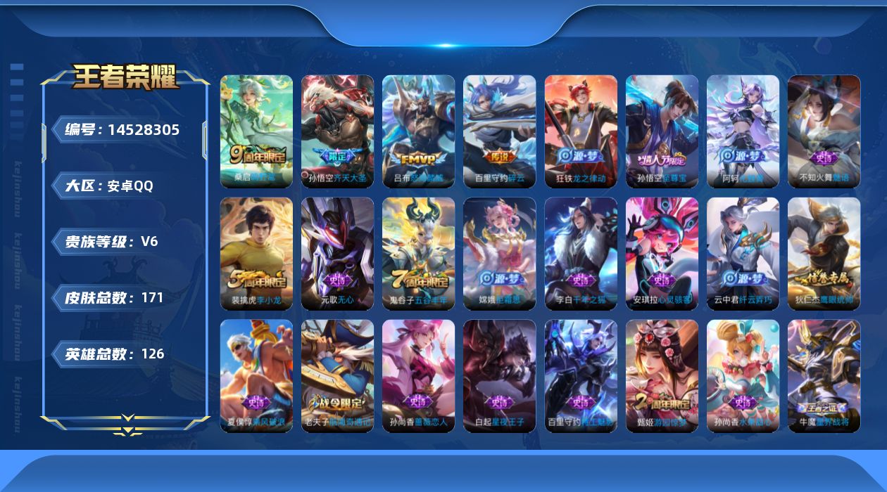 [14528305]安卓q-v6-最强王者段位-126英雄-171皮肤-0典藏-0珍品无双-0无双-0珍品传说-5传说-34史诗 【英雄全皮】:孙权全皮 【传说皮肤】:后羿神树通天,桑启鸣野蒿,孙悟空齐天大圣,吕布怒海麟威,百里守约碎云 【限定皮肤】:白起狰,姜子牙天穹之誓,狄仁杰阴阳师,虞姬凯尔特女王,赵云皇家上将,墨子神迹守卫,孙尚香蔷薇恋人,扁鹊炼金王,元歌无心,甄姬游园惊梦,典韦穷奇,狄仁杰魔术师,狄仁杰万华元夜,达摩沙漠行僧,项羽海滩派对,老夫子醍醐杖,老夫子航海奇遇记,程咬金演武夺筹,兰陵王金庭之子,孙悟空至尊宝,孙悟空齐天大圣,后羿圣弓游侠,李元芳云中旅人,钟馗驱傩正仪,干将莫邪真爱魔法,雅典娜单词大作战,雅典娜黎明之约,鬼谷子原初探秘者,鬼谷子五谷丰年,苏烈千军破阵,弈星混沌棋,沈梦溪大漠名商,明世隐疑决卦,裴擒虎李小龙,裴擒虎擒涛扼浪,云中君纤云弄巧,嫦娥拒霜思,蒙犽狂想玩偶喵,鲁班大师探海日志,桑启海盐诗旅,艾琳女武神,张良古海寻踪,鬼谷子天穹祈灯,刘邦剑破天穹,程咬金群星魔术团,周瑜熔金海岸 【赛季限定】:扁鹊炼金王,白起狰,典韦穷奇,狄仁杰万华元夜,达摩沙漠行僧,老夫子醍醐杖,程咬金演武夺筹,兰陵王金庭之子,张良古海寻踪,李元芳云中旅人,虞姬凯尔特女王,钟馗驱傩正仪,雅典娜黎明之约,鬼谷子原初探秘者,苏烈千军破阵,弈星混沌棋,沈梦溪大漠名商,明世隐疑决卦,裴擒虎擒涛扼浪,鲁班大师探海日志,桑启海盐诗旅,鬼谷子天穹祈灯,刘邦剑破天穹,姜子牙天穹之誓 【战令限定】:墨子神迹守卫,老夫子航海奇遇记,后羿圣弓游侠,干将莫邪真爱魔法,雅典娜单词大作战,蒙犽狂想玩偶喵 【史诗皮肤】:赵云皇家上将,貂蝉圣诞恋歌,王昭君偶像歌手,狄仁杰魔术师,宫本武藏鬼剑武藏,孙尚香蔷薇恋人,孙尚香水果甜心,妲己魅力维加斯,墨子金属风暴,李白千年之狐,孙悟空至尊宝,刘邦德古拉伯爵,夏侯惇乘风破浪,甄姬游园惊梦,亚瑟心灵战警,雅典娜冰冠公主,安琪拉心灵骇客,百里守约特工魅影,程咬金功夫厨神,白起星夜王子,狄仁杰鹰眼统帅,不知火舞魅语,蒙犽狂想玩偶喵,裴擒虎李小龙,云中君纤云弄巧,老夫子航海奇遇记,干将莫邪真爱魔法,嫦娥拒霜思,雅典娜黎明之约,鬼谷子五谷丰年,元歌无心,牛魔星界战将,阿轲化蝶舞,狂铁龙之律动 【其他皮肤】:项羽海滩派对,韩信教廷特使,阿轲爱心护理,赵云忍炎影,芈月红桃皇后,艾琳女