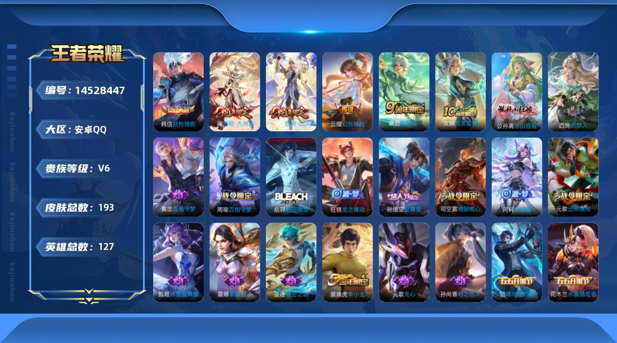 [14528447]安卓q-v6-永恒钻石i段位-127英雄-193皮肤-1典藏-0珍品无双-0无双-0珍品传说-5传说-61史诗 【英雄全皮】:司空震全皮,空空儿全皮,影全皮 【荣耀典藏】:韩信弑呛猎影 【传说皮肤】:后羿神树通天,司空震愿照山河定,澜愿照九州拓,云缨幻光神呛,桑启鸣野蒿 【限定皮肤】:蒙犽顽岩魄,蔡文姬夏日便利店,虞姬夏日便利店,姜子牙天穹之誓,狄仁杰阴阳师,赵云皇家上将,孙尚香蔷薇恋人,元歌云间偶戏,元歌无心,甄姬落雪兰心,狄仁杰魔术师,达摩沙漠行僧,项羽海滩派对,兰陵王金庭之子,孙悟空至尊宝,李元芳云中旅人,苏烈千军破阵,沈梦溪大漠名商,裴擒虎李小龙,裴擒虎擒涛扼浪,云中君纤云弄巧,嫦娥拒霜思,西施玲珑珍味,鲁班大师探海日志,桑启海盐诗旅,艾琳女武神,艾琳流音漫舞,司空震地狱燃心,阿古朵江河有灵,张良古海寻踪,蒙犽百解令,高渐离燃音魔法,妲己灵卜魔法,鬼谷子天穹祈灯,沈梦溪龙舞盛年,鲁班七号蔬乡物语,李元芳蔬乡物语,刘邦剑破天穹,程咬金群星魔术团,镜青焰无极,项羽苍威无极,周瑜熔金海岸 【赛季限定】:达摩沙漠行僧,兰陵王金庭之子,张良古海寻踪,李元芳云中旅人,苏烈千军破阵,沈梦溪大漠名商,裴擒虎擒涛扼浪,鲁班大师探海日志,桑启海盐诗旅,鬼谷子天穹祈灯,刘邦剑破天穹,姜子牙天穹之誓 【战令限定】:蔡文姬夏日便利店,虞姬夏日便利店,元歌云间偶戏,甄姬落雪兰心,艾琳流音漫舞,西施玲珑珍味,司空震地狱燃心,高渐离燃音魔法,妲己灵卜魔法,鲁班七号蔬乡物语,李元芳蔬乡物语,镜青焰无极,项羽苍威无极 【史诗皮肤】:露娜紫霞仙子,赵云皇家上将,貂蝉圣诞恋歌,甄姬冰雪圆舞曲,王昭君偶像歌手,狄仁杰魔术师,宫本武藏鬼剑武藏,孙尚香蔷薇恋人,孙尚香水果甜心,妲己魅力维加斯,妲己女仆咖啡,墨子金属风暴,曹操幽灵船长,李白千年之狐,吕布末日机甲,孙悟空至尊宝,花木兰水晶猎龙者,刘邦德古拉伯爵,夏侯惇乘风破浪,小乔缤纷独角兽,兰陵王暗隐猎兽者,诸葛亮黄金分割率,亚瑟心灵战警,雅典娜冰冠公主,安琪拉心灵骇客,百里守约特工魅影,铠曙光守护者,蔡文姬舞动绿茵,李元芳逐浪之夏,阿轲节奏热浪,大乔猫狗日记,狄仁杰鹰眼统帅,小乔青蛇,孙尚香时之恋人,裴擒虎李小龙,云中君纤云弄巧,元歌云间偶戏,杨戬天秀启明,嫦娥拒霜思,元歌无心,司空震地狱燃心,阿古朵江河有灵,蒙犽百解令,妲己灵卜魔法,高渐离燃音魔法