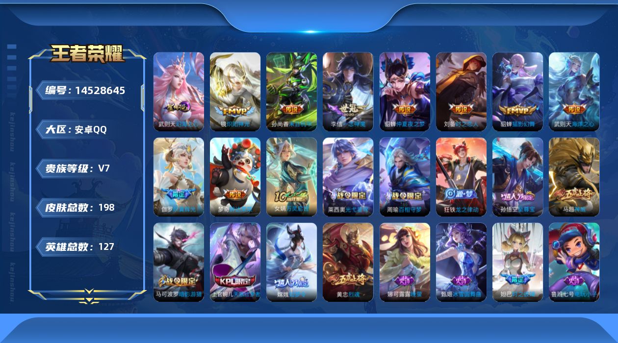 [14528645]安卓q-v7-最强王者段位-127英雄-198皮肤-1典藏英雄-10传说-69史诗 【荣耀典藏】:武则天英雄 【传说皮肤】:后羿神树通天,伽罗炽翼辉光,镜炽阳神光,李信一念神魔,刘备时之恋人,貂蝉猫影幻舞,梦奇胖达荣荣,貂蝉仲夏夜之梦,孙尚香末日机甲,武则天海洋之心 【限定皮肤】:狄仁杰阴阳师,赵云皇家上将,妲己时之彼端,高渐离玩趣恶龙,阿轲迷踪丽影,钟无艳王者之锤,孙膑天狼运算者,芈月幻夜卜梦,元歌无心,夏侯惇朔风刀,甄姬幽恒,曹操天狼征服者,马可波罗暗影游猎,狄仁杰魔术师,狄仁杰万华元夜,达摩沙漠行僧,项羽海滩派对,老夫子醍醐杖,刘邦夺宝奇兵,孙悟空至尊宝,后羿如梦令,后羿圣弓游侠,李元芳银河之约,李元芳云中旅人,干将莫邪真爱魔法,雅典娜单词大作战,雅典娜黎明之约,蔡文姬繁星吟游,鬼谷子原初探秘者,鬼谷子五谷丰年,黄忠烈魂,黄忠火炮绅士,苏烈千军破阵,百里玄策原初追逐者,弈星混沌棋,梦奇顽趣,沈梦溪星空之诺,沈梦溪大漠名商,明世隐疑决卦,裴擒虎李小龙,裴擒虎擒涛扼浪,云中君纤云弄巧,伽罗炽翼辉光,猪八戒西部大镖客,上官婉儿天狼绘梦者,嫦娥如梦令,嫦娥暖冬兔眠,蒙犽狂想玩偶喵,鲁班大师探海日志,桑启海盐诗旅,暃星界游侠,蒙恬荣光圣徽,沈梦溪龙舞盛年 【年限皮肤】:甄姬幽恒,马超神威,黄忠烈魂,伽罗炽翼辉光 【赛季限定】:夏侯惇朔风刀,狄仁杰万华元夜,达摩沙漠行僧,老夫子醍醐杖,李元芳云中旅人,雅典娜黎明之约,鬼谷子原初探秘者,苏烈千军破阵,百里玄策原初追逐者,弈星混沌棋,梦奇顽趣,沈梦溪大漠名商,明世隐疑决卦,裴擒虎擒涛扼浪,鲁班大师探海日志,桑启海盐诗旅,蒙恬荣光圣徽 【战令限定】:阿轲迷踪丽影,芈月幻夜卜梦,马可波罗暗影游猎,刘邦夺宝奇兵,后羿圣弓游侠,李元芳银河之约,干将莫邪真爱魔法,雅典娜单词大作战,黄忠火炮绅士,沈梦溪星空之诺,猪八戒西部大镖客,嫦娥暖冬兔眠,蒙犽狂想玩偶喵,暃星界游侠 【史诗皮肤】:鲁班七号电玩小子,阿轲暗夜猫娘,钟无艳王者之锤,赵云皇家上将,貂蝉圣诞恋歌,甄姬冰雪圆舞曲,狄仁杰魔术师,廉颇地狱岩魂,宫本武藏鬼剑武藏,孙尚香水果甜心,嬴政暗夜贵公子,妲己魅力维加斯,墨子金属风暴,吕布圣诞狂欢,刘禅绅士熊喵,李白千年之狐,吕布末日机甲,张飞乱世虎臣,韩信白龙吟,孙悟空至尊宝,刘邦德古拉伯爵,夏侯惇乘风破浪,小乔缤纷独角兽,兰陵王暗隐猎兽