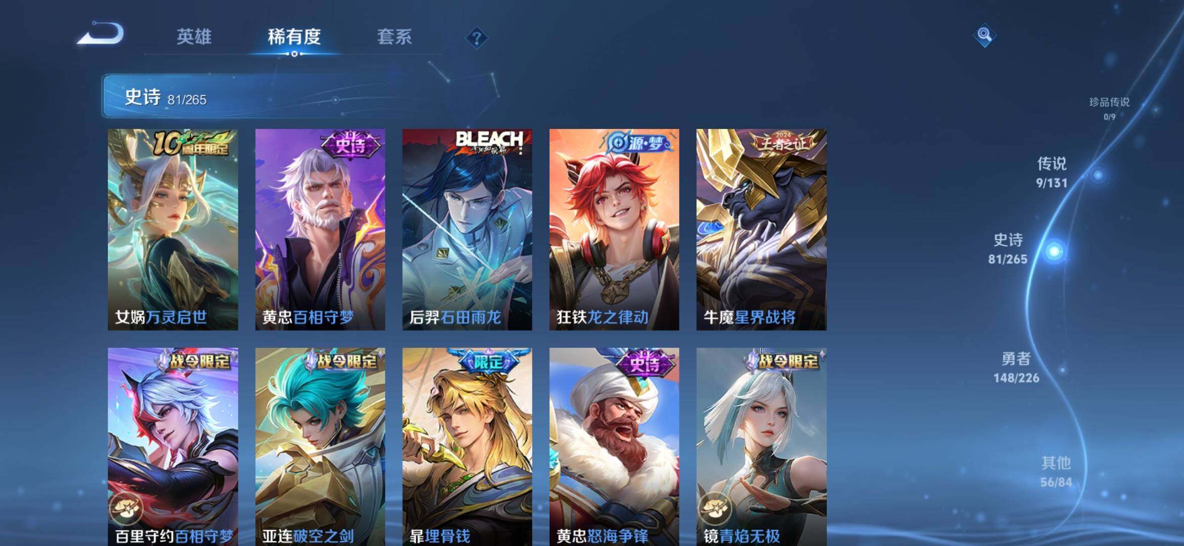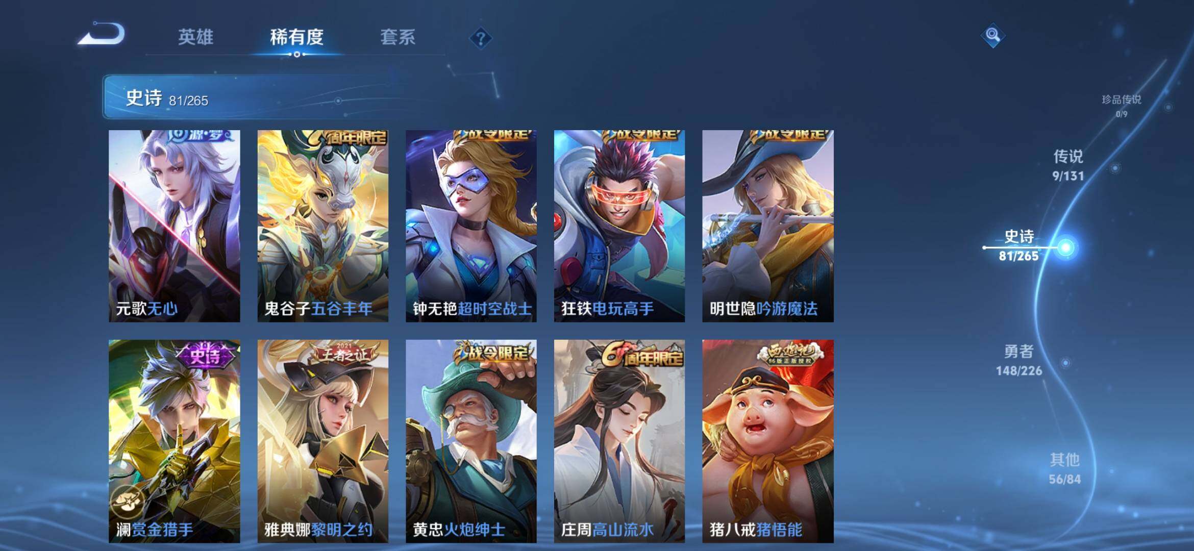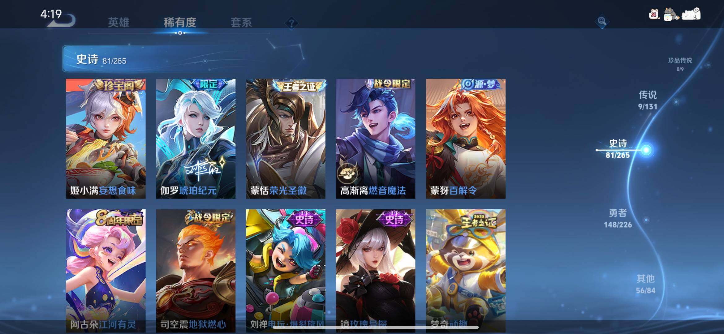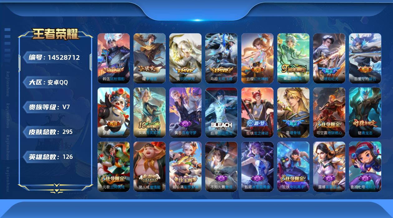 [14528712]安卓q-v7-最强王者段位-126英雄-295皮肤-1典藏皮肤-9传说-81史诗 【英雄全皮】:狂铁全皮,蒙恬全皮 【荣耀典藏】:韩信弑呛猎影 【传说皮肤】:后羿神树通天,云缨幻光神呛,桑启鸣野蒿,铠琥珀纪元,百里守约碎云,马超无双飞将,曜李 ,镜炽阳神光,梦奇胖达荣荣 【限定皮肤】:暃埋骨钱,姜子牙天穹之誓,狄仁杰阴阳师,赵云皇家上将,孙尚香蔷薇恋人,鲁班七号狮舞东方,庄周高山流水,高渐离玩趣恶龙,钟无艳超时空战士,白起夜都怪侠,芈月幻夜卜梦,吕布猎兽之王,元歌云间偶戏,元歌无心,夏侯惇朔风刀,甄姬落雪兰心,狄仁杰魔术师,狄仁杰万华元夜,达摩星际陆战队,达摩沙漠行僧,项羽海滩派对,老夫子醍醐杖,程咬金演武夺筹,王昭君午后时光,兰陵王金庭之子,亚瑟潮玩骑士王,牛魔御旌,后羿圣弓游侠,李元芳银河之约,李元芳云中旅人,钟馗神迹守卫,钟馗驱傩正仪,干将莫邪真爱魔法,雅典娜黎明之约,蔡文姬繁星吟游,鬼谷子原初探秘者,鬼谷子五谷丰年,黄忠火炮绅士,铠青龙志,苏烈千军破阵,百里玄策原初追逐者,弈星混沌棋,梦奇顽趣,沈梦溪大漠名商,明世隐疑决卦,明世隐吟游魔法,裴擒虎李小龙,裴擒虎擒涛扼浪,狂铁御狮,狂铁电玩高手,米莱狄御霄,米莱狄胡桃异想国,盾山御銮,猪八戒猪悟能,上官婉儿梁祝,曜李 ,鲁班大师探海日志,桑启海盐诗旅,艾琳流音漫舞,司空震地狱燃心,阿古朵江河有灵,张良古海寻踪,蒙犽百解令,蒙恬荣光圣徽,高渐离燃音魔法,妲己灵卜魔法,鬼谷子天穹祈灯,伽罗琥珀纪元,铠琥珀纪元,姬小满妄想食味,沈梦溪龙舞盛年,刘邦剑破天穹,程咬金群星魔术团,镜青焰无极,项羽苍威无极,刘备异域游侠,周瑜熔金海岸 【年限皮肤】:铠青龙志 【赛季限定】:夏侯惇朔风刀,狄仁杰万华元夜,达摩沙漠行僧,老夫子醍醐杖,程咬金演武夺筹,兰陵王金庭之子,张良古海寻踪,牛魔御旌,李元芳云中旅人,钟馗驱傩正仪,雅典娜黎明之约,鬼谷子原初探秘者,苏烈千军破阵,百里玄策原初追逐者,弈星混沌棋,梦奇顽趣,沈梦溪大漠名商,明世隐疑决卦,裴擒虎擒涛扼浪,狂铁御狮,米莱狄御霄,盾山御銮,鲁班大师探海日志,桑启海盐诗旅,鬼谷子天穹祈灯,蒙恬荣光圣徽,刘邦剑破天穹,姜子牙天穹之誓 【战令限定】:鲁班七号狮舞东方,钟无艳超时空战士,白起夜都怪侠,芈月幻夜卜梦,吕布猎兽之王,元歌云间偶戏,甄姬落雪兰心,达摩星际陆战队,王昭君午后时